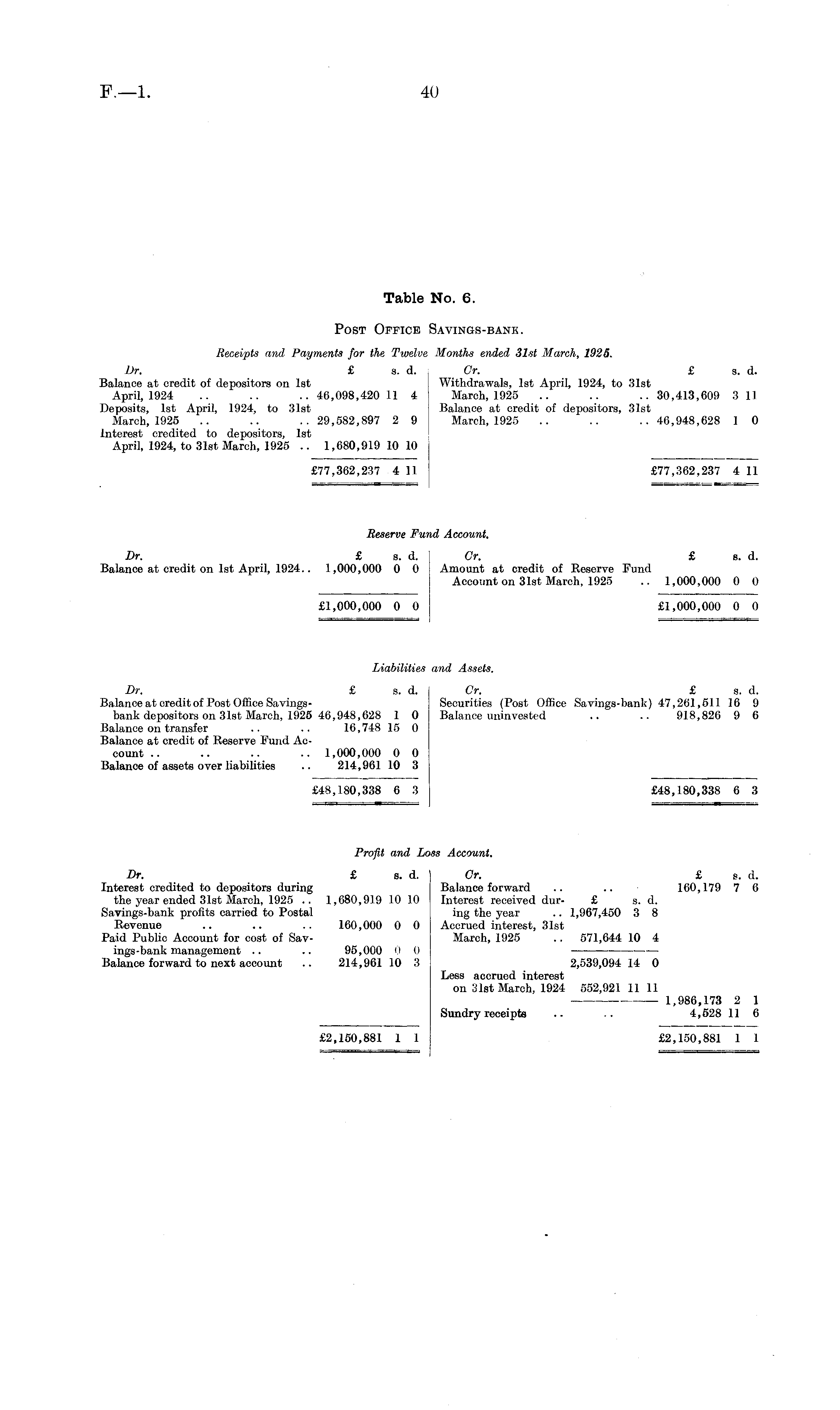 Table No. 6. Post Office Savings-bank. Receipts and Payments for the Twelve Months ended 31st March, 1925. Dr. £ s. d. Cr. £ s. d. Balance at credit of depositors on Ist Withdrawals, Ist April, 1924, to 31st April, 1924 .. .. .. 46,098,420 11 4 March, 1925 .. .. .. 30,413,609 311 Deposits, Ist April, 1924, to 31st Balance at credit of depositors, 31st March, 1925 .. .. .. 29,582,897 2 9 March, 1925 .. .. .. 46,948,628 1 0 Interest credited to depositors, Ist April, 1924, to 31st March, 1925 .. 1,680,919 10 10 £77,362,237 4 11 £77,362,237 4 11 Reserve Fund Account. Dr. £ s. d. Cr. £ s. d. Balance at credit on Ist April, 1924.. 1,000,000 0 0 Amount at credit of Reserve Fund Account on 31st March, 1925 .. 1,000,000 0 0 £1,000,000 0 0 £1,000,000 0 0 Liabilities and Assets. Dr. £ s. d. Cr. £ s. d. Balance at credit of Post Office Sayings- Securities (Post Office Savings-hank) 47,261,511 16 9 hank depositors on 31st March, 1925 46,948,628 1 0 Balance uninvested .. .. 918,826 9 6 Balance on transfer .. .. 16,748 15 0 Balance at credit of Reserve Fund Account .. .. .. 1,000,000 0 0 Balance of assets over liabilities .. 214,961 10 3 £48,180,338 6 3 £48,180,338 6 3 Profit and Loss Account. Dr. £ s. d. Cr. £ e. d. Interest credited to depositors during Balance forward .. .. 160,179 7 6 the year ended 31st March, 1925 .. 1,680,919 10 10 Interest received dur- £ s. d. Savings-bank profits carried to Postal ing the year .. 1,967,450 3 8 Revenue .. .. .. 160,000 0 0 Accrued interest, 31st Paid Public Account for cost of Sav- March, 1925 .. 571,644 10 4 ings-bank management .. .. 95,000 0 0 — Balance forward to next account .. 214,961 10 3 2,539,094 14 0 Less accrued interest on 31st March, 1924 552,921 11 11 1,986,173 2 1 Sundry receipts .. .. 4,528 11 6 £2,150,881 1 1 £2,150,881 1 1