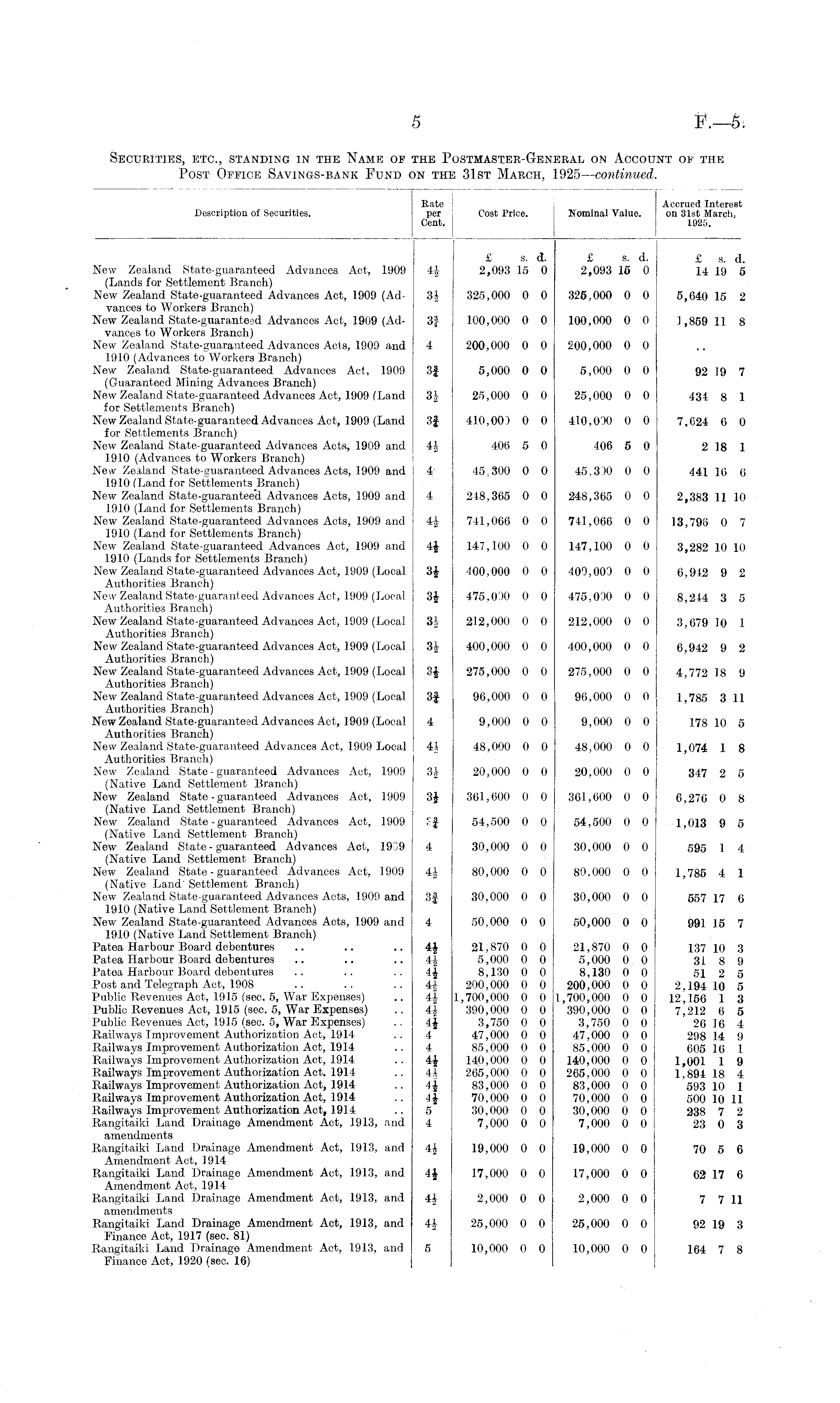 Rate I Accrued Interest Description of Securities. per Cost Price. Nominal Value. on 31st March, Cent. 1925. £ s. d. £ s. d. £ s. d. New Zealand State-guaranteed Advances Act, 1909 4J 2,093 15 0 2,093 16 0 14 19 5 (Lands for Settlement Branch) New Zealand State-guaranteed Advances Act, 1909 (Ad- 3J 325,000 0 0 326,000 0 0 5,640 15 2 vances to Workers Branch) New Zealand State-guaranteed Advances Act, 1909 (Ad- 3f 100,000 0 0 100,000 0 0 1,859 11 8 vances to Workers Branch) New Zealand State-guaranteed Advances Acts, 1909 and 4 200,000 0 0 200,000 0 0 1910 (Advances to Workers Branch) New Zealand State-guaranteed Advances Act, .1909 3f 5,000 0 0 5,000 0 0 92 19 7 (Guaranteed Mining Advances Branch) New Zealand State-guaranteed Advances Act, 1909 (Land 3} 25,000 0 0 25,000 0 0 434 8 1 for Settlements Branch) New Zealand State-guaranteed Advances Act, 1909 (Land 3f 410,003 0 0 410,000 0 0 7,624 6 0 for Settlements Branch) New Zealand State-guaranteed Advances Acts, 1909 and 4J 406 5 0 406 5 0 2 18 1 1910 (Advances to Workers Branch) New Zealand State-guaranteed Advances Acts, 1909 and 4 45,300 0 0 45,3)0 0 0 441 16 6 1910 (Land for Settlements Branch) New Zealand State-guarantee'd Advances Acts, 1909 and 4 248,365 0 0 248,365 0 0 2,383 11 10 1910 (Land for Settlements Branch) New Zealand State-guaranteed Advances Acts, 1909 and 4-J 741,066 0 0 741,066 0 0 13,796 0 7 1910 (Land for Settlements Branch) New Zealand State-guaranteed Advances Act, 1909 and 4£ 147,100 0 0 147,100 0 0 3,282 10 10 1910 (Lands for Settlements Branch) New Zealand State-guaranteed Advances Act, 1909 (Local 3£ 400,000 0 0 409,003 0 0 6,912 9 2 Authorities Branch) New Zealand State-guaranteed Advances Act, 19.09 (Local 3J 475,000 0 0 475,000 0 0 8,244 3 5 Authorities Branch) New Zealand State-guaranteed Advances Act, 1909 (Local 3 J 212,000 0 0 212,000 0 0 3,679 10 1 Authorities Branch) New Zealand State-guaranteed Advances Act, 1909 (Local 3J 400,000 0 0 400,000 0 0 6,942 9 2 Authorities Branch) New Zealand State-guaranteed Advances Act, 1909 (Local 3J 275,000 0 0 275,000 0 0 4,772 18 9 Authorities Branch) New Zealand State-guaranteed Advances Act, 1909 (Local 3§ 96,000 0 0 96,000 0 0 1,785 3 11 Authorities Branch) New Zealand State-guaranteed Advances Act, 1909 (Local 4 9,000 0 0 9,000 0 0 178 10 5 Authorities Branch) New Zealand State-guaranteed. Advances Act, 1909 Local 41 48,000 0 0 48,000 0 0 1,074 1 8 Authorities Branch) New Zealand State - guaranteed Advances Act, 1909 3i 20,000 0 0 20,000 0 0 347 2 5 (Native Land Settlement Branch) New Zealand State - guaranteed Advances Act, 1909 3J 361,600 0 0 361,600 0 0 6,276 0 8 (Native Land Settlement Branch) New Zealand State - guaranteed Advances Act, 1909 ef 54,500 0 0 54,500 0 0 1,013 9 5 (Native Land Settlement Branch) New Zealand State - guaranteed Advances Act, 1909 4 30,000 0 0 30,000 0 0 595 1 4 (Native Land Settlement Branch) New Zealand State - guaranteed Advances Act, 1909 4J 80,000 0 0 80,000 0 0 1,785 4 1 (Native Land' Settlement Branch) New Zealand State-guaranteed Advances Acts, 1909 and 3J 30,000 0 0 30,000 0 0 557 17 6 1910 (Native Land Settlement Branch) New Zealand State-guaranteed Advances Acts, 1909 and 4 50,000 0 0 50,000 0 0 991 15 7 1910 (Native Land Settlement Branch) Patea Harbour Board debentures .. .. .. 4J 21,870 0 0 21,870 0 0 137 10 3 Patea Harbour Board debentures .. .. .. 4| 5,000 0 0 5,000 0 0 31 8 9 Patea Harbour Board debentures .. .. .. 4| 8,130 0 0 8,130 0 0 51 2 5 Post and Telegraph Act, 1908 .. .. .. 4i 200,000 0 0 200,000 0 0 2,194 10 5 Public Revenues Act, 1915 (sec. 5, War Expenses) .. 4| 1,700,000 0 0 1,700,000 0 0 12,156 1 3 Public Revenues Act, 1915 (sec. 5, War Expenses) .. 4| 390,000 0 0 390,000 0 0 7,212 6 5 Public Revenues Act, 1915 (sec. 5, War Expenses) .. 3,750 0 0 3,750 0 0 26 16 4 Railways Improvement Authorization Act, 1914 .. 4 47,000 0 0 47,000 0 0 298 14 9 Railways Improvement Authorization Act, 1914 .. 4 85,000 0 0 85,000 0 0 605 16 1 Railways Improvement Authorization Act, 1914 .. 4J 140,000 0 0 140,000 0 0 1,001 1 9 Railways Improvement Authorization Act. 1914 .. 4-1 265,000 0 0 265,000 0 0 1,894 18 4 Railways Improvement Authorization Act, 1914 .. 4| 83,000 0 0 83,000 0 0 593 10 1 Railways Improvement Authorization Act, 1914 .. 70,000 0 0 70,000 0 0 500 10 11 Railways Improvement Authorization Act, 1914 .. 5 30,000 0 0 30,000 0 0 238 7 2 Rangitaiki Land Drainage Amendment Act, 1913, and 4 7,000 0 0 7,000 0 0 23 0 3 amendments Rangitaiki Land Drainage Amendment Act, 1913, and 4£ 19,000 0 0 19,000 0 0 70 5 6 Amendment Act, 1914 Rangitaiki Land Drainage Amendment Act, 1913, and 4£ 17,000 0 0 17,000 0 0 62 17 6 Amendment Act, 1914 Rangitaiki Land Drainage Amendment Act, 1913, and 4i 2,000 0 0 2,000 0 0 7 7 11 amendments Rangitaiki Land Drainage Amendment Act, 1913, and 4-i 25,000 0 0 25,000 0 0 92 19 3 Finance Act, 1917 (sec. 81) Rangitaiki Land Drainage Amendment Act, 1913, and 5 10,000 0 0 10,000 0 0 164 7 8 Finance Act, 1920 (sec. 16)