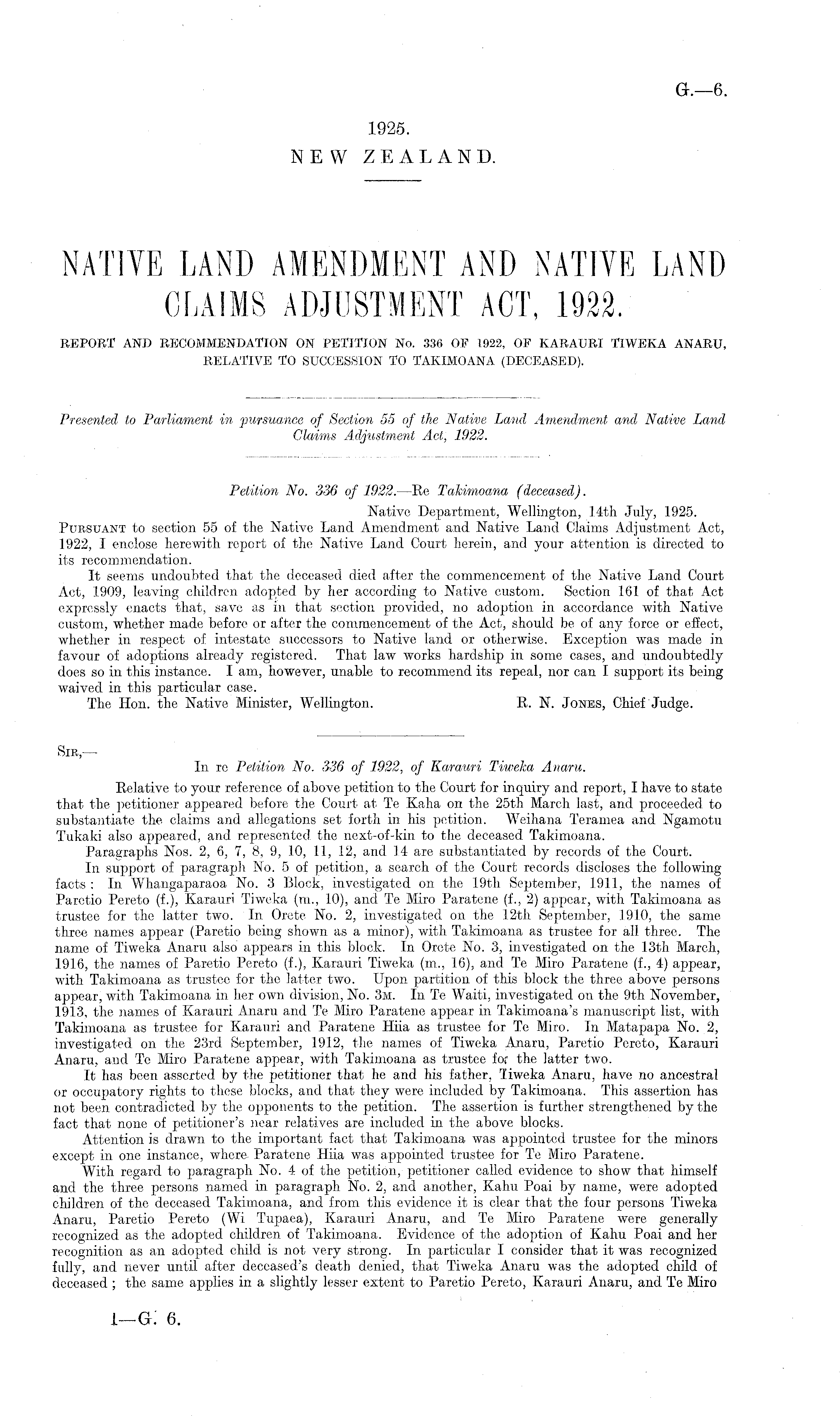 NATIVE LAND AMENDMENT AND NATIVE LAND CLAIMS ADJUSTMENT ACT, 1922. REPORT AND RECOMMENDATION ON PETITION No. 336 OF 1922, OF KARAURI TIWEKA ANARU, RELATIVE TO SUCCESSION TO TAKIMOANA (DECEASED).