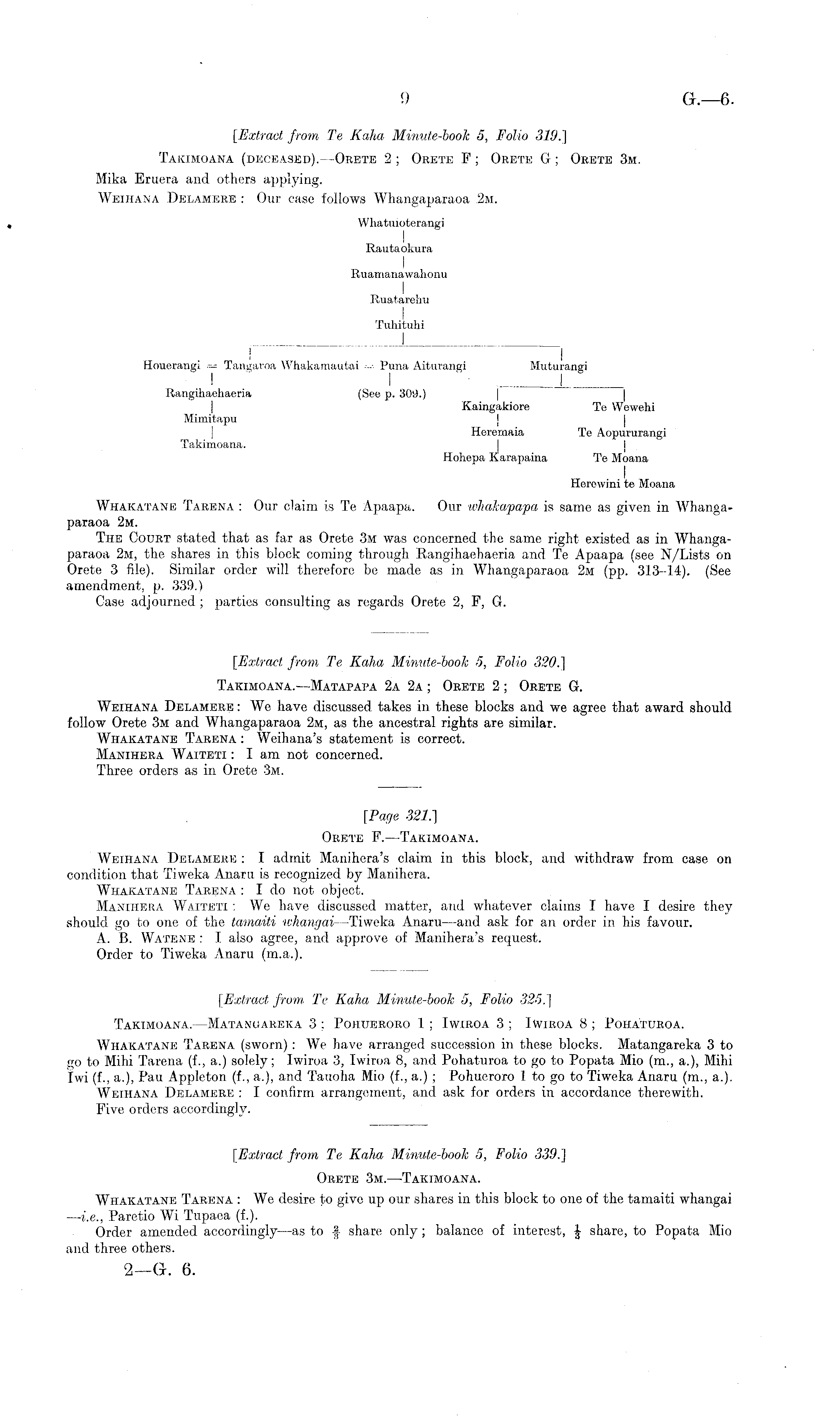 [.Extract from Te Kaha Minute-book 5, Folio 319.] Takimoana (deceased). —Orete 2 ; Orete F ; Orete G; Orete 3m. Mika Eruera and others applying. Weihana Delamere : Our case follows Whangaparaoa 2m. W hatuioterangi i Rautaokura i Ruamanawahonu i Ruatarehu i Tuhituhi I ! I Houerangi = Tangaroa Whakamautai --- Puna Aiturangi Muturangi Rangihaehaeria (See p. 309.) Kaingakiore Te Wewehi Mimitapu Hereraaia Te Aopururangi Takimoana. Hohepa Karapaina Te Moana I Herowini te Moana Whakatane Tarena : Our claim is Te Apaapa. Our whakapapa is same as given in Whangaparaoa 2m. The Court stated that as far as Orete 3m was concerned the same right existed as in Whangaparaoa 2m, the shares in this block coming through Rangihaehaeria and Te Apaapa (see N/Lists on Orete 3 file). Similar order will therefore be made as in Whangaparaoa 2m (pp. 313-14). (See amendment, p. 339.) Case adjourned ; parties consulting as regards Orete 2, F, G. [Extract from Te Kaha Minute-book 5, Folio 320.] Takimoana. —Matapapa 2a 2a ; Orete 2 ; Orete G. Weihana Delamere : We have discussed takes in these blocks and we agree that award should follow Orete 3m and Whangaparaoa 2m, as the ancestral rights are similar. Whakatane Tarena : Weihana's statement is correct. Manihera Waiteti : I am not concerned. Three orders as in Orete 3m. [Page 321.] Orete F.—Takimoana. Weihana Delamere : I admit Manihera's claim in this block, and withdraw from case on condition that Tiweka Anaru is recognized by Manihera. Whakatane Tarena : I do not object. Manihera Waiteti : We have discussed matter, and whatever claims I have I desire they should go to one of the tamaiti whangai —Tiweka Anaru —and ask for an order in his favour. A. B. Watene : I also agree, and approve of Manihera's request. Order to Tiweka Anaru (m.a.). [Extract from Te Kaha Minute-book 5, Folio 325.] Takimoana.* —Matangareka 3 ; Pohijeroro 1 ; Iwiroa 3 ; Iwiroa 8 ; Pohaturoa. Whakatane Tarena (sworn) : We have arranged succession in these blocks. Matangareka 3to go to Mihi Tarena (f., a.) solely; Iwiroa 3, Iwiroa 8, and Pohaturoa to go to Popata Mio (m., a.), Mihi Iwi (f., a.), Pau Appleton (f., a.), and Tauoha Mio (f., a.) ; Pohueroro 1 to go to Tiweka Anaru (m., a.). Weihana Delamere : I confirm arrangement, and ask for orders in accordance therewith. Five orders accordingly. [Extract from Te Kaha Minute-book 5, Folio 339.] Orete 3m.—Takimoana. Whakatane Tarena : We desire to give up our shares in this block to one of the tamaiti whangai —i.e., Paretio Wi Tupaea (f.). Order amended accordingly —as to share only; balance of interest, | share, to Popata Mio and three others.