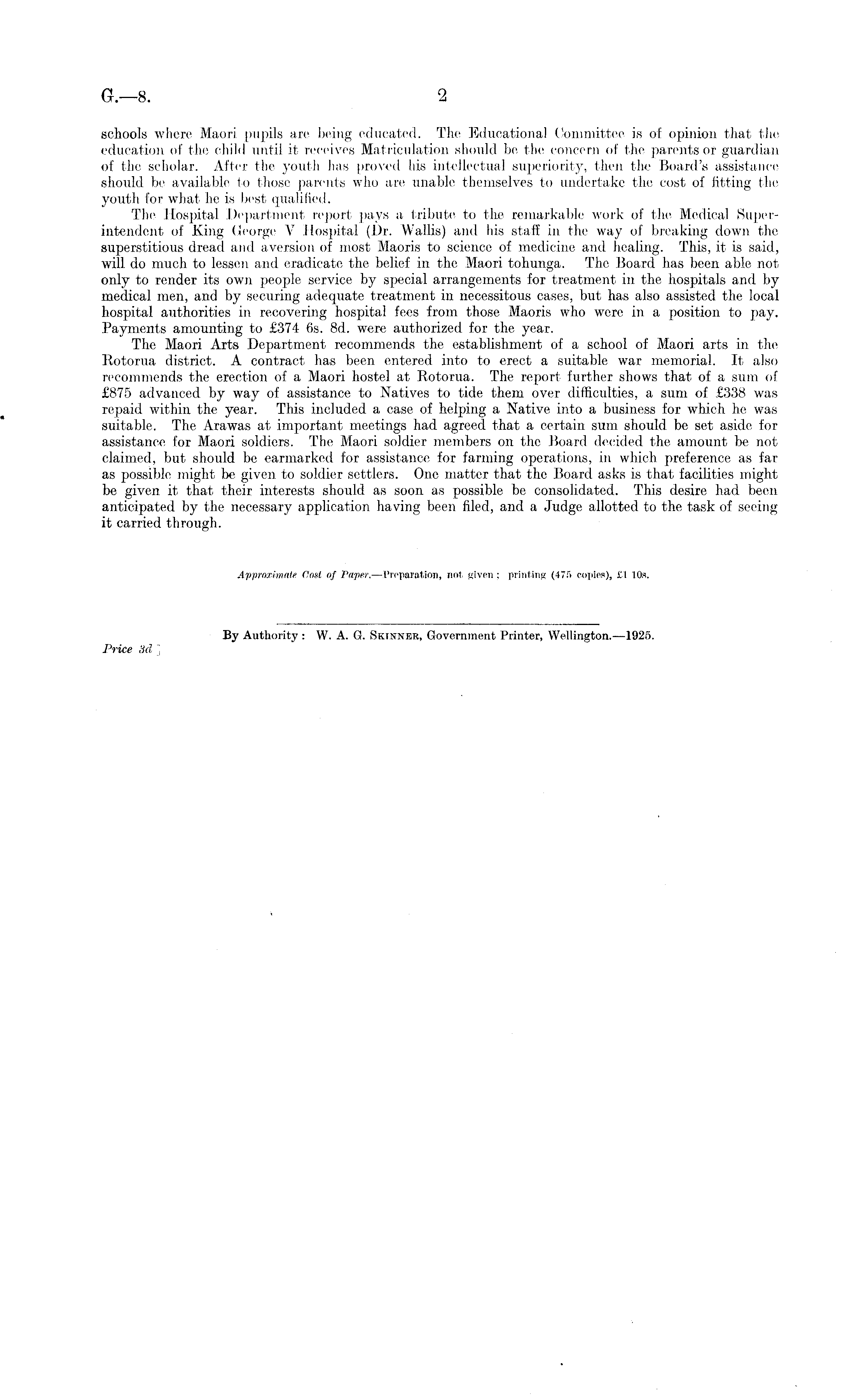schools where Maori pupils are being educated. The Educational Committee is of opinion that the education of the child until it receives Matriculation should be the concern of the parents or guardian of the scholar. After the youth has proved his intellectual superiority, then the Board's assistance should be available to those parents who are unable themselves to undertake the cost of fitting the youth for what he is best qualified. The Hospital Department report pays a tribute to the remarkable work of the Medical Superintendent of King George V Hospital (Dr. Wallis) and his staff in the way of breaking down the superstitious dread and aversion of most Maoris to science of medicine and healing. This, it is said, will do much to lessen and eradicate the belief in the Maori tohunga. The Board has been able not only to render its own people service by special arrangements for treatment in the hospitals and by medical men, and by securing adequate treatment in necessitous cases, but has also assisted the local hospital authorities in recovering hospital fees from those Maoris who were in a position to pay. Payments amounting to £374 6s. Bd. were authorized for the year. The Maori Arts Department recommends the establishment of a school of Maori arts in the Rotorua district. A contract has been entered into to erect a suitable war memorial. It also recommends the erection of a Maori hostel at Rotorua. The report further shows that of a sum of £875 advanced by way of assistance to Natives to tide them over difficulties, a sum of £338 was repaid within the year. This included a case of helping a Native into a business for which he was suitable. The Arawas at important meetings had agreed that a certain sum should be set aside for assistance for Maori soldiers. The Maori soldier members on the Board decided the amount be not claimed, but should be earmarked for assistance for farming operations, in which preference as far as possible might be given to soldier settlers. One matter that the Board asks is that facilities might be given it that their interests should as soon as possible be consolidated. This desire had been anticipated by the necessary application having been filed, and a Judge allotted to the task of seeing it carried through.