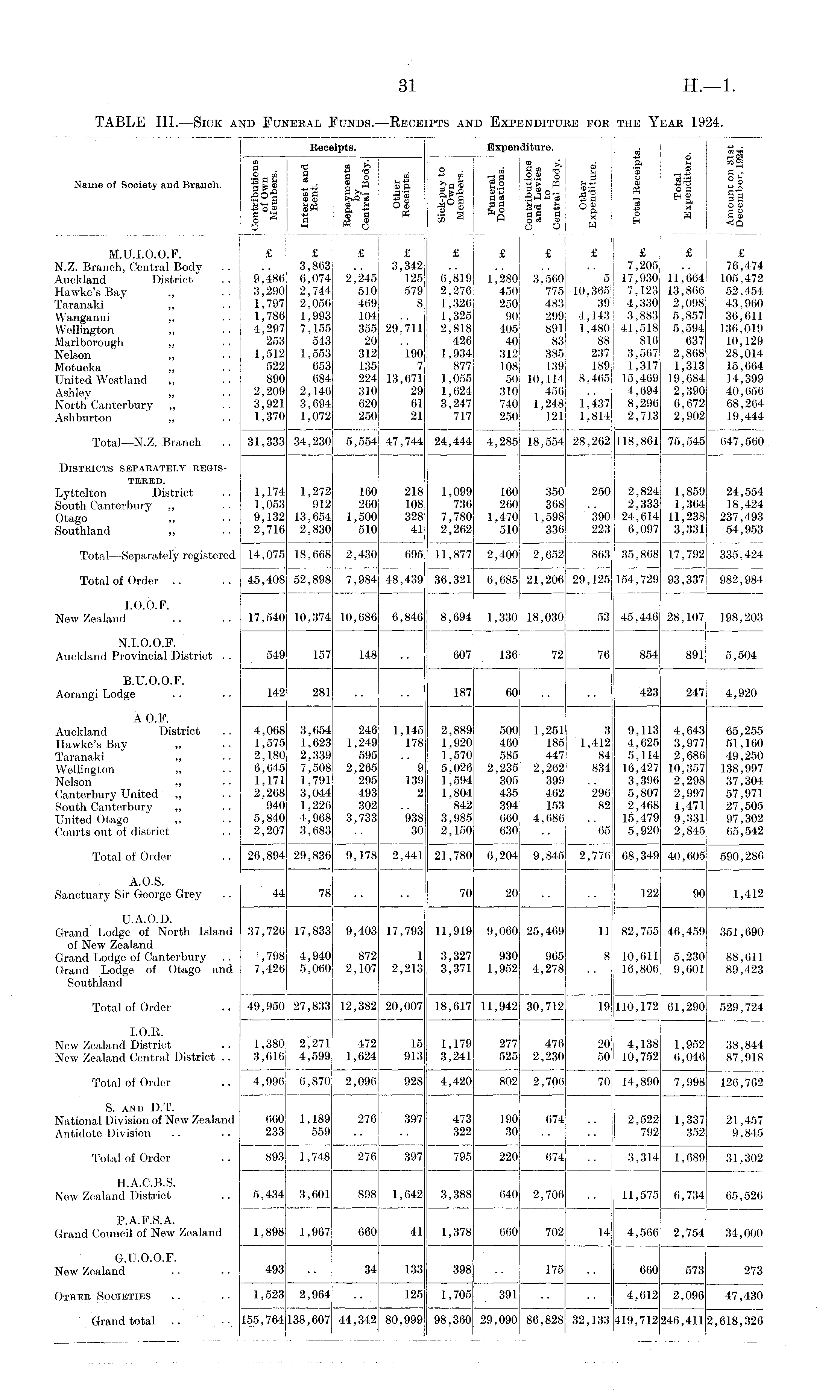TABLE III.—Sick and Funeral Funds. —Receipts and Expenditure for the Year 1924.