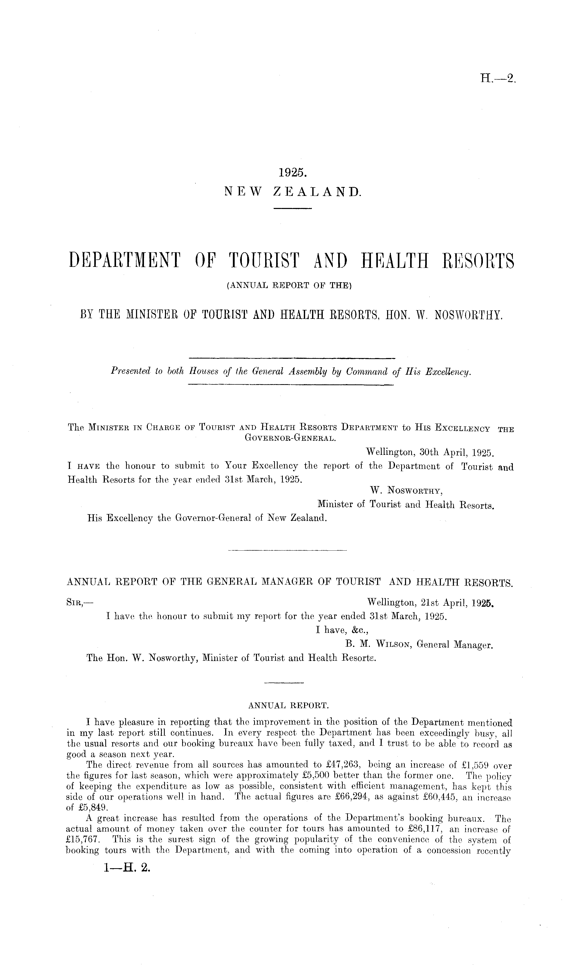 ANNUAL REPORT OF THE GENERAL MANAGER OF TOURIST AND HEALTH RESORTS. Sir, — Wellington, 21st April, 1925. I have the honour to submit my report for the year ended 31st March, 1925. I have, &c., B. M. Wilson, General Manager. The Hon. W. Nosworthy, Minister of Tourist and Health Resorts. ANNUAL REPORT. I have pleasure in reporting that the improvement in the position of the Department mentioned in my last report still continues. In every respect the Department has been exceedingly busy, all the usual resorts and our booking bureaux have been fully taxed, and I trust to be able to record as good a season next year. The direct revenue from all sources has amounted to £47,263, being an increase of £1,559 over the figures for last season, which were approximately £5,500 better than the former one. The policy of keeping the expenditure as low as possible, consistent with efficient management, has kept this side of our operations well in hand. The actual figures are £66,294, as against £60,445, an increase of £5,849. A great increase has resulted from the operations of the Department's booking bureaux. The actual amount of money taken over the counter for tours has amounted to £86,117, an increase of £15,767. This is the surest sign of the growing popularity of the convenience of the system of booking tours with the Department, and with the coming into operation of a concession recently