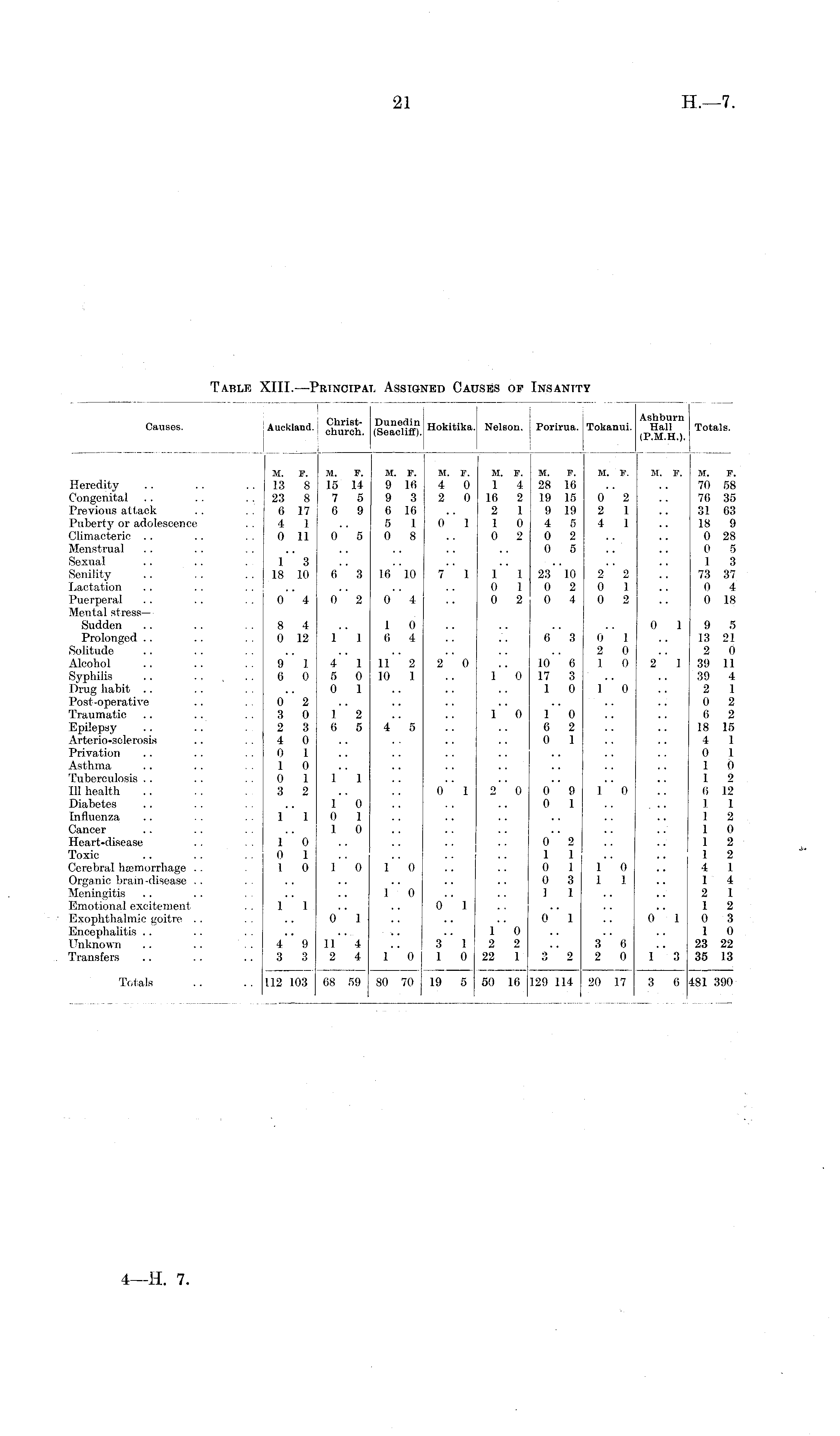 „ I I I I Causes. Auckland, (Seacliff? Hokitika.j Nelson. Porirua. Tokanui. JT all Totals. M. F. M. F. M. F. M. F. M. F. M. F. M. F. M. F. M. F. Heredity .. .. .. 13 8 15 14 9 lfi 4 0 1 4 28 16 .. .. 70 58 Congenital . . .. . . 23 8 7 5 9 3 2 0 16 2 19 15 0 2 .. 76 35 Previous attack .. 6 17 6 9 6 16 .. 2 1 9 19 2 1 .. 31 63 Puberty or adolescence ..41 .. 51 01 1045 41 .. 18 9 Climacteric .. .. .. 0 11 05 08 .. 02 02 .. .. 0 28 Menstrual .. .. .. .. .. .. .. .. 05 .. .. 0 5 Sexual .. .. . 13 .. .. .. .. .. .. .. 13 Senility .. .. 18 10 6 3 16 10 7 1 1 1 23 10 2 2 .. 73 37 Lactation .. .. .. .. .. .. .. 010201 .. 04 Puerperal .. .. .. 04020 4 .. 020402 .. 0 18 Mental stress — Sudden .. .. ..84 .. 10 .. .. .. .. 019 5 Prolonged.. .. 0 12 1 1 6 4 .. .. 6 3 0 1 .. 13 21 Solitude .. .. .. .. .. .. .. .. 20 .. 20 Alcohol . . . . .9 1 4 1 11 2 2 0 .. 10 6 1 0 2 1 39 11 Syphilis .. ... . . 6 0 5 0 10 1 .. 1 0 17 3 .. .. 39 4 Drug habit .. .. .. 01 .. .. .. 1010 .. 21 Post-operative .. 02 .. .. .. .. .. .. .. 02 Traumatic .. .. ..3012 .. .. 1010 .. .. 62 Epilepsy .. .. 2 3 6 5 4 5 .. .. 6 2 .. .. 18 15 Arteriosclerosis .. ..40 .. .. .. .. 01 .. .. 41 Privation .. .. ..01 .. .. .. .. .. .. .. 01 Asthma .. .. 10 .. .. .. .. .. .. .. 10 Tuberculosis .. .. . 0111 .. .. .. .. .. .. 12 111 health .. .. 32 .. .. 01200910 .. 6 12 Diabetes .. .. . .. 10 .. .. .. 01 .. .. 11 Influenza .. .. .110 1 .. .. .. .. .. .. 12 Cancer .. . . .. 10 .. .. .. .. .. .. 10 Heart-disease .. .10 .. .. .. .. 02 .. .. 12 Toxic .. .. ..01 .. .. .. .. 11 .. .. 12 Cerebral hemorrhage .. 101010 .. .. 0110 .. 41 Organic brain -disease .. .. .. .. .. .. .. 03 11 .. 14 Meningitis .. .. .. .. 10 .. .. 11 .. .. 21 Emotional excitement .. 11.. .. 0 1 .. .. .. .. 12 Exophthalmic goitre .. . . .. 0 1 .. .. .. 0 1 .. 0 10 3 Encephalitis .. .. .. .. .. .. .. 10 .. .. .. 10 Unknown .. .. 4 9 11 4 .. 3 1 2 2 .. 3 6 .. 23 22 Transfers .. .. .. 3 3 2 4 1 0 1 0 22 1 3 2 2 0 1 3 35 13 Totals .. ..112 103 68 59 80 70 19 5 50 16 129 114 20 17 3 6 481 390