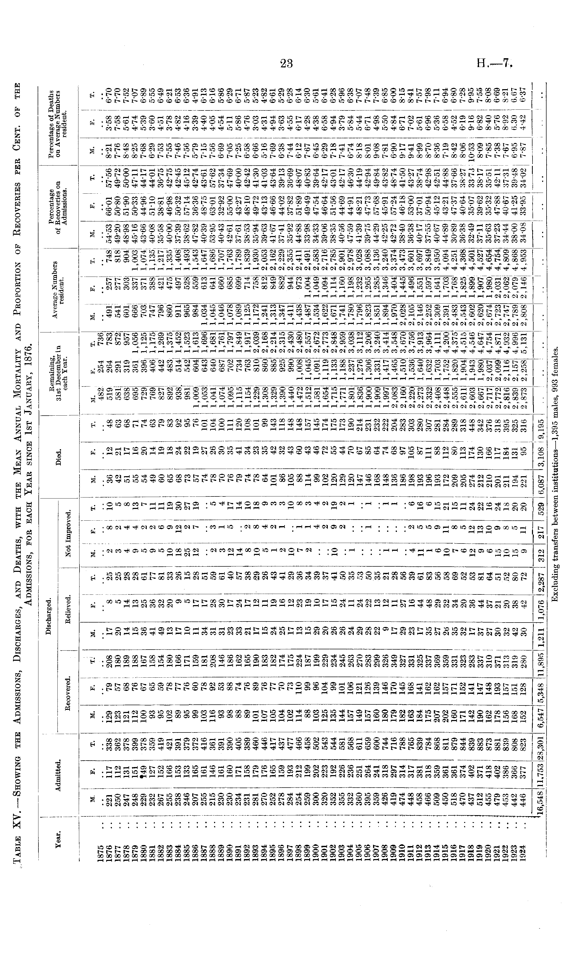 1 I ' I j Discharged. Remaining, Average Numbers Percentage Percentage oi Deaths Year. \ Admitted. : : Died. 31st December in ) rSSrimt of Becoveries on on Average Numbers I -o „ , , , each Year. Admissions. resident. Recovered. Believed. Not Improved. M. F. T. M. F. T. M. F. T. M. ! F. T. M. F. T. M. I F. T. M. i F. T. M. F. T. M. F. T. 1875 .. j S 482 i 254 736 .. 1876 .. | 221 117 338 129 79 208 17 8 25 2 i 8 10 36 12 48 519' 264 783 491 257 748 54-53 66'01 57-56 8*21 3'58 6'70 1877 ..I 250 112 362 123 57 180 20 5 25 3 2 5 42 21 63 581 291 872 541! 277 818 49*20 50'80 49-72 7'76 7-58 7'70 1878 .. 247 131 378 121 68 189 14 14 28 4 4 8 51 17 68 638 319 957 601 303 904 48-98 51-90 50-00 8-48 5'61 7'52 1879 .. 248 151 399 112 76 188 15 13 28 9 4 13 55 16 71 695 361 1,056 666 337 1,003 45-16 50-33 47-11 8-25 4-74 7-07 1880 .. 229 T49 378 100 67 167 36 25 61 5 2 7 54 20 74 729 396j 1,125 703| 371 1,074 43-66 44-96 44-17 7*68 5-39 6-89 1881 .. 232 127 359 93 65 158 41 36 *77 9 2 11 49 14 63 769 406! 1,175 747 388 1,135 40-08 51-10 44-01 6-29 3-60 5-55 1882 .. 267 152 419 95 59 154 49 32 81 5 6 11 60 19 79 827 442! 1,269 796 ! 421 1,217 35-58 38-81 36-75 7-53 4-51 6-49 1883 .. 255 166 421 102 78 180 13 20 33 10 9 19 65 18 83 892 483! 1,375 860 475 1,335 40*00 46-98 42-75 7*55 3-78 6'21 1884 .. I 238 153 391 89 77 166 17 9 26 18 12 30 68 24 92 938. 514! 1,452 911 497 1,408 37'39 50'32 42-45 7*46 4-82 6'53 1885 .. . 246 133 379 95 76 171 10 5 15 25 2 27 73 22 95 981 r 542 1,523 965 528 1,493 38*62 57-14 45-12 7*56 4-16 6-36 1886 .. j 207 165 372 99 60 159 11 17 28 12 7 19 57 19 76 1,009 604 1,613 984 559 1,543 47*82 36-36 42*74 5*79 3*39 4*91 1887 .. j 255 161 416 103 78 181 34 17 51 74 27 101 1,053 643 1,696 1,034 613 1,647 40*39 48*75 43*61 7*15 4*40 6*13 1888 .. I 215 146 361 116 92 208 31 28 59 2 3 5 78 26 104 1,041 640 1,681 1,045 641 1,686 53*95 63*01 57*62 7*56 4*05 6-16 1889 .. 230 161 391 93 53 146 31 30 61 3 1 4 70 30 100 1,074 687 1,761 1,046 660 1,707 40-43 32*92 37*34 6*69 4*54 5*86 1890 .. ! 230 160 390 98 88 186 23 17 40 12 5 17 76 35 111 1,095 702 1,797 1,078 685 1,763 42*61 55*00 47*69 7*05 5-11 6-29 1891 .. 234 171 405 88 74 162 33 24 57 14 .. 14 79 41 I 120 1,115 734 1,849 1,089 699 1,789 37-61 43-27 40-00 7*25 5-86 6-71 1892 .. ! 231 158 389 89 76 165 21 17 38 8 2 10 74 34 108 1,154 763 1,917 1,125 714 1,839 38*53 48*10 42*42 6*58 4*76 5*87 1893 .. 281 179 460 101 89 190 17 12 29 10 8 18 78 23 | 101 1,229 810 2,039 1,172 758 1,930 35*94 49*72 41*30 6*66 3*03 5*23 1894 .. 270 176 446 107 76 183 15 11 26 5 4 9 64 35 j 99 1,308 860 2,168 1,241 812 2,053 39*63 43*13 41*03 5*16 4*31 4*82 1895 ,. ! 252 165 417 105 77 182 24 19 43 1 2 3 101 42 ! 143 1,329 885 2,214 1,313 849 2,162 41*67 46*66 43*64 7*69 4*94 6*61 1896 ..I 278 159 437 104 70 174 25 16 41 2 1 3 86 32 118 1,390 925 2,315 1,347 882 2,229 37*41 44*02 39*13 6*38 3*63 5*29 1897 .. 284 193 477 102 73 175 17 12 29 10 . • 10 105 43 148 1,440 990 2,430 1,411 944 2,355 35*92 37*82 36*69 7*44 4-55 6'28 1898 .. 254 212 466 114 110 224 13 23 '36 7 1 8 88 60 148 1,472 1,008 2,480 1,438 973 2,411 44-88 51-89 48-07 6-12 6-17 6-14 1899 .. 259 199 458 88 99 187 15 19 34 2 1 3 114 43 157 1,512 1,045 2,557 1,487 1,004 2,491 33*98 49*49 40*83 7*67 4*28 6*30 1900 .. 300 202 502 103 96 199 29 10 39 4 4 99 46 145 1,581 1,091 2,672 1,534 1,049 2,583 34*33 47*54 39*64 6*45 4*38 5*61 1901 .. j 320 223 543 125 104 229 20 17 37 2 2 102 72 174 1,654 1,119 2,773 1,622 1,094 2,716 39*06 46*64 42*17 6*29 6*58 6*41 1902 ..I 352 192 544 135 99 234 26 15 41 10 9 19 120 55 175 1,715 1,133 2,848 1,671 1,114 2,785 38*35 51*56 43*01 7*18 4*94 6*28 1903 .. j 355 226 581 144 101 245 26 24 50 2 2 129 44 173 1,771 1,188 2,959 1,741 1,160 2,901 40*56 44*69 42*17 7*41 3*79 5*96 1904 .. 332 236 568 157 106 263 24 11 35 1 1 120 70 190 1,801 1,237 3,038 1,780 1,198 2,978 47*59 44*91 46*30 6*74 5*84 6*38 1905 .. 360 251 611 149 121 270 29 24 53 147 67 214 1,836 1,276 3,112 1,796 1,232 3,028 41*39 48*21 44*19 8*18 5*44 7-07 1906 .. 395 264 659 157 126 283 28 22 50 1 1 146 85 231 1,900 1,306 3,206 1,823 1,265 3,088 39-75 47'73 42-94 8'01 6-71 7-48 1907 .. 359 241 600 160 139 299 22 13 35 168 64 232 1,909 1,331 3,240 1,851 1,285 3,136 44-29 57-68 49'84 9-08 4-98 7*39 1908 .. 426 318 744 180 146 326 9 12 21 1 .. 1 148 74 222 1,997 1,417 3,414 1,894 1,346 3,240 42*25 45*91 43*82 7*81 5*50 6*85 1909 .. 419 297 716 179 170 349 17 11 28 1 1 136 68 204 2,083 1,465 3,548 1,970 1,404 3,374 42*72 57*24 48*74 6*90 4*84 6*00 1910 .. 474 314 788 182 145 327 29 27 56 .. .. .. 186 97 283 2,160 1,510 3,670 2,028 1,445 3,473 38*40 46*18 41*50 9*17 6-71 8-15 1911 .. 448 317 765 163 168 331 23 16 39 4 2 6 198 105 303 2,220 1,536 3,756 2,105 1,496 3,601 36*38 53*00 43*27 9*41 7*02 8*41 1912 .. 458 381 839 184 141 325 17 44 61 11 5 16 193 87 280 2,273 1,640 3,913 2,146 1,551 3,697 40*17 37*01 38*74 8*99 5*61 7*57 1913 .. 466 318 784 175 162 337 35 48 83 1 5 6 196 111 307 2,332 1,632 3,964 2,252 1,597 3,849 37*55 50-94 42-98 8-70 6*96 7*98 1914 .. 509 359 868 207 162 369 27 29 56 6 9 15 193 88 281 2,408 1,703 4,111 2,309 1,641 3,950 40-67 45-12 42-51 8-36 5-36 7-11 1915 .. 450 361 811 202 157 359 26 32 58 10 11 21 172 112 284 2,448 1,752 4,200 2,391 1,703 4,094 44-89 43-21 44-88 7'19 6'58 6*94 1916 .. 518 361 879 160 171 331 ! 35 34 69 7 8 15 209 80 289 2,555 1,820 4,375 2,483 1,768 4,251 30*89 47*37 37*66 8*42 4*52 6*80 1917 .. 470 374 [ 844 171 152 323 j 32 20 52 6 5 11 205 113 ! 318 2,611 1,904 4,515 2,543 1,825 4,368 36*38 40*64 38*27 8*06 6*19 7*28 1918 .. 437 402! 839 142 141 283 17 36 53 12 12 24 274 174 448 2,603 1,943 4,546{ 2,602 1,89914,501 32*49 35*07 33 73 10*53 9*16 9*95 1919 .. 512 371 ! 883 190 147 337 37 44 81 9 13 22 212 130 342 2,667 1,980 4,647} 2,620 l,907i 4,527 37*11 39*62 38*17 8*09 6*82 7*55 1920 .. 455 418 I 873 162 148 310 27 37 64 6 10 16 210 166 376 2,717 2,037 4,754 2,674 1,980! 4,654 35*63 35*32 35*51 7*85 8*40 8*08 1921 ■ 479 402 881 178 193 371 30 21 