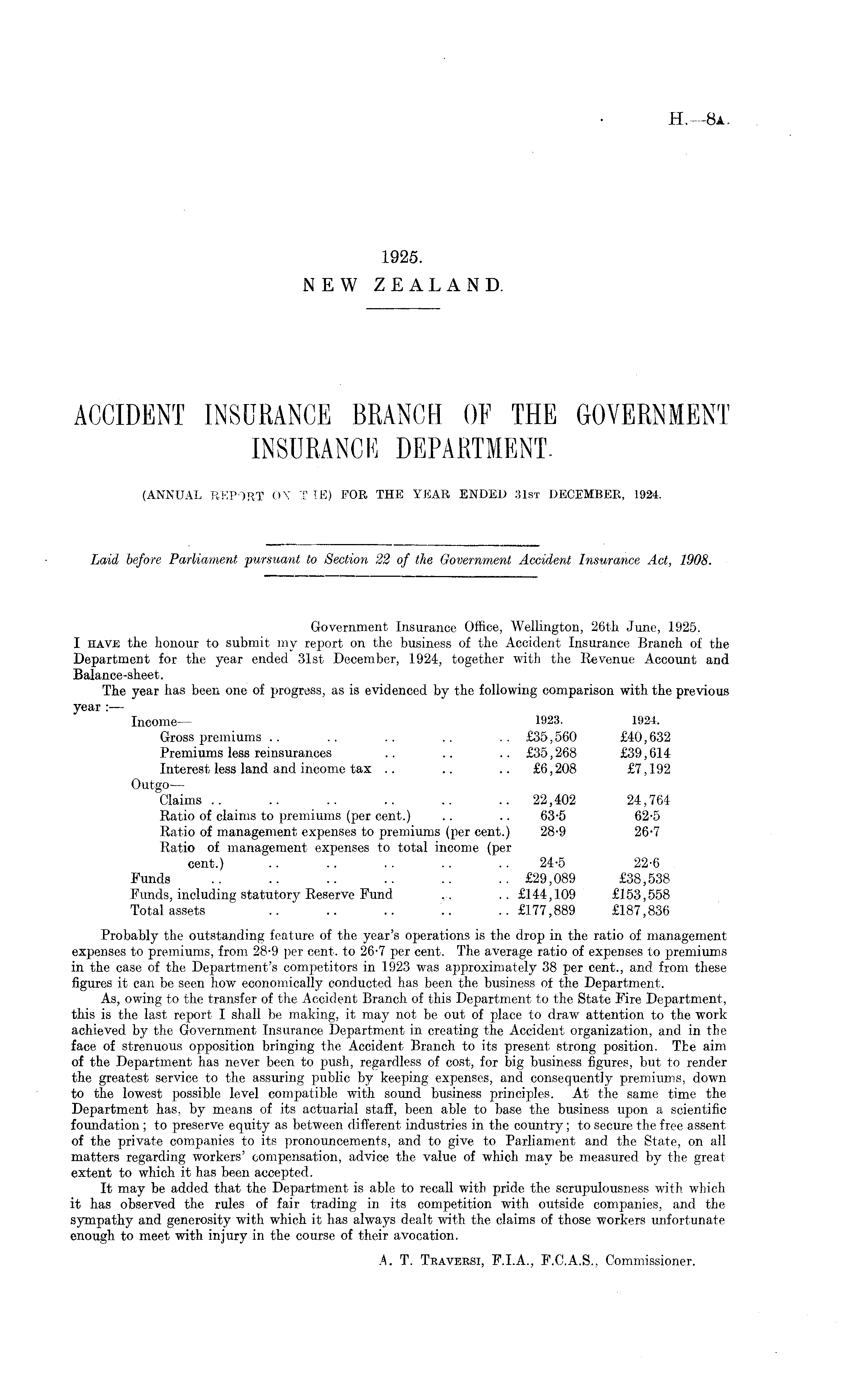 Government Insurance Office, Wellington, 26th June, 1925. I have the honour to submit my report on the business of the Accident Insurance Branch of the Department for the year ended 31st December, 1924, together with the Revenue Account and Balance-sheet. The year has been one of progress, as is evidenced by the following comparison with the previous year : — Income — 1923. 1924. Gross premiums .. .. .. .. .. £35,560 £40,632 Premiums less reinsurances .. .. .. £35,268 £39,614 Interest less land and income tax .. .. .. £6,208 £7,192 Outgo — Claims .. .. .. .. .. .. 22,402 24,764 Ratio of claims to premiums (per cent.) .. .. 63-5 62-5 Ratio of management expenses to premiums (per cent.) 28-9 26-7 Ratio of management expenses to total income (per cent.) .. .. .. .. .. 24-5 22-6 Funds .. .. .. .. .. .. £29,089 £38,538 Funds, including statutory Reserve Fund v . .. £144,109 £153,558 Total assets .. .. .. .. ..£177,889 £187,836 Probably the outstanding feature of the year's operations is the drop in the ratio of management expenses to premiums, from 28-9 per cent, to 26-7 per cent. The average ratio of expenses to premiums in the case of the Department's competitors in 1923 was approximately 38 per cent., and from these figures it can be seen how economically conducted has been the business of the Department. As, owing to the transfer of the Accident Branch of this Department to the State Fire Department, this is the last report I shall be making, it may not be out of place to draw attention to the work achieved by the Government Insurance Department in creating the Accident organization, and in the face of strenuous opposition bringing the Accident Branch to its present strong position. The aim of the Department has never been to push, regardless of cost, for big business figures, but to render the greatest service to the assuring public by keeping expenses, and consequently premiums, down to the lowest possible level compatible with sound business principles. At the same time the Department has, by means of its actuarial staff, been able to base the business upon a scientific foundation ; to preserve equity as between different industries in the country; to secure the free assent of the private companies to its pronouncements, and to give to Parliament and the State, on all matters regarding workers' compensation, advice the value of which may be measured by the great extent to which it has been accepted. It may be added that the Department is able to recall with pride the scrupulousness with which it has observed the rules of fair trading in its competition with outside companies, and the sympathy and generosity with which it has always dealt with the claims of those workers unfortunate enough to meet with injury in the course of their avocation. A. T. Traversi, F.1.A., F.C.A.S., Commissioner.