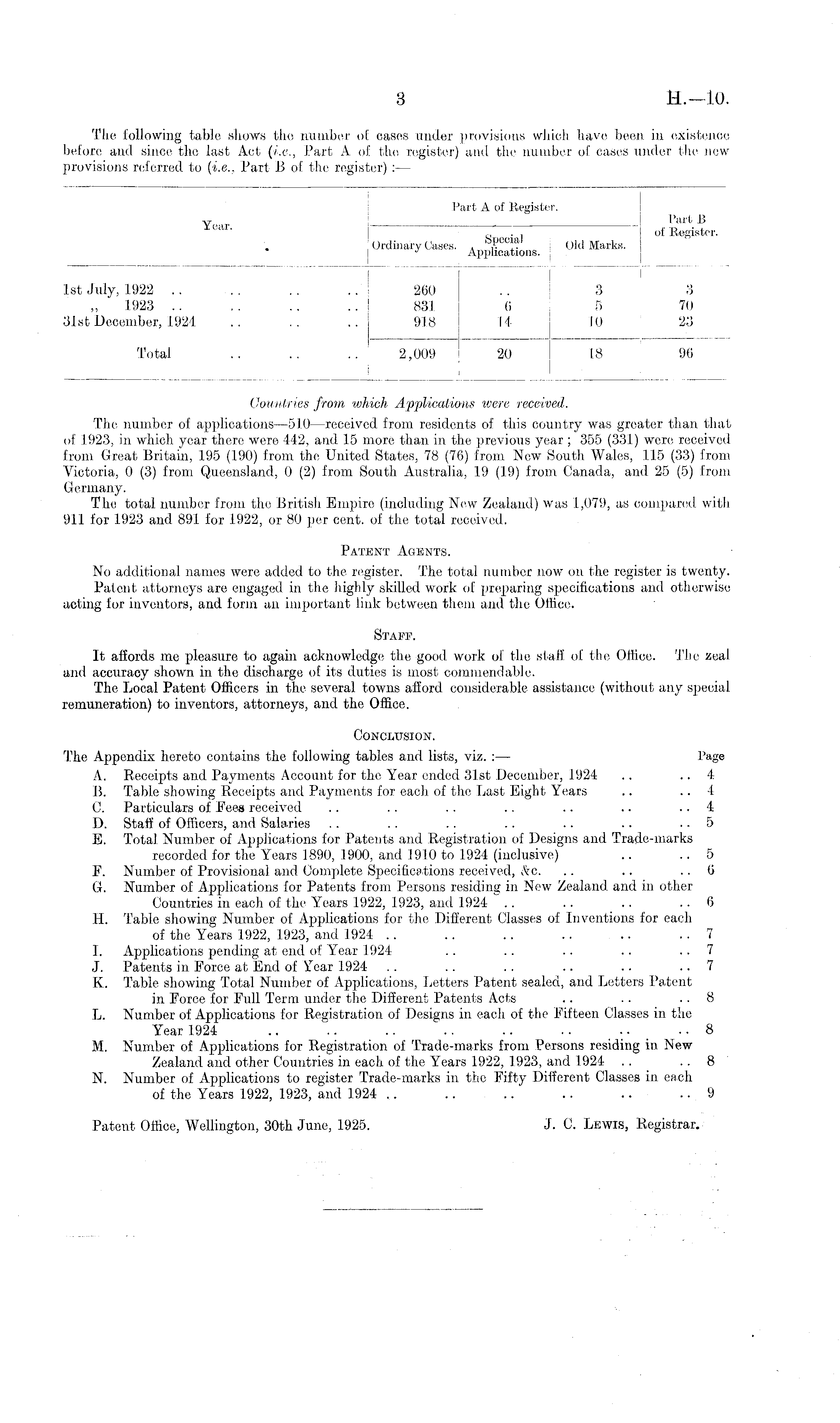 The number of applications —510 —received from residents of this country was greater than that of 1923, in which year there were 442, and 15 more than in the previous year ; 355 (331) were received from Great Britain, 195 (190) from the United States, 78 (76) from New South Wales, 115 (33) from Victoria, 0 (3) from Queensland, 0 (2) from South Australia, 19 (19) from Canada, and 25 (5) from Germany. The total number from the British Empire (including New Zealand) was 1,079, as compared with 911 for 1923 and 891 for 1922, or 80 per cent, of the total received. Patent Agents. No additional names were added to the register. The total number now on the register is twenty. Patent attorneys are engaged in the highly skilled work of preparing specifications and otherwise acting for inventors, and form an important link between them and the Office. Staff. It affords me pleasure to again acknowledge the good work of the staff of the Office. The zeal and accuracy shown in the discharge of its duties is most commendable. The Local Patent Officers in the several towns afford considerable assistance (without any special remuneration) to inventors, attorneys, and the Office. Conclusion. The Appendix hereto contains the following tables and lists, viz. Page A. Receipts and Payments Account for the Year ended 31st December, 1924 .. 4 B. Table showing Receipts and Payments for each of the Last Eight Years .. 4 C. Particulars of Fees received .. .. .. .. .. .. .. 4 D. Staff of Officers, and Salaries .. .. .. .. .. .. .. 5 E. Total Number of Applications for Patents and Registration of Designs and Trade-marks recorded for the Years 1890, 1900, and 1910 to 1924 (inclusive) .. .. 5 F. Number of Provisional and Complete Specifications received, &c. .. .. 6 G. Number of Applications for Patents from Persons residing in New Zealand and in other Countries in each of the Years 1922, 1923, and 1924 .. .. .. 6 H. Table showing Number of Applications for the Different Classes of Inventions for each of the Years 1922, 1923, and 1924 .. .. .. .. .. .. 7 I. Applications pending at end of Year 1924 .. .. .. .. 7 J. Patents in Force at End of Year 1924 .. .. .. .. .. 7 K. Table showing Total Number of Applications, Letters Patent sealed, and Letters Patent in Force for Full Term under the Different Patents Acts .. . . .. 8 L. Number of Applications for Registration of Designs in each of the Fifteen Classes in the Year 1924 .. .. .. .. .. .. • • 8 M. Number of Applications for Registration of Trade-marks from Persons residing in New Zealand and other Countries in each of the Years 1922, 1923, and 1924 .. ..8 N. Number of Applications to register Trade-marks in the Fifty Different Classes in each of the Years 1922, 1923, and 1924 .. .. .. .. .. .. 9 Patent Office, Wellington, 30th June, 1925. J. C. Lewis, Registrar.