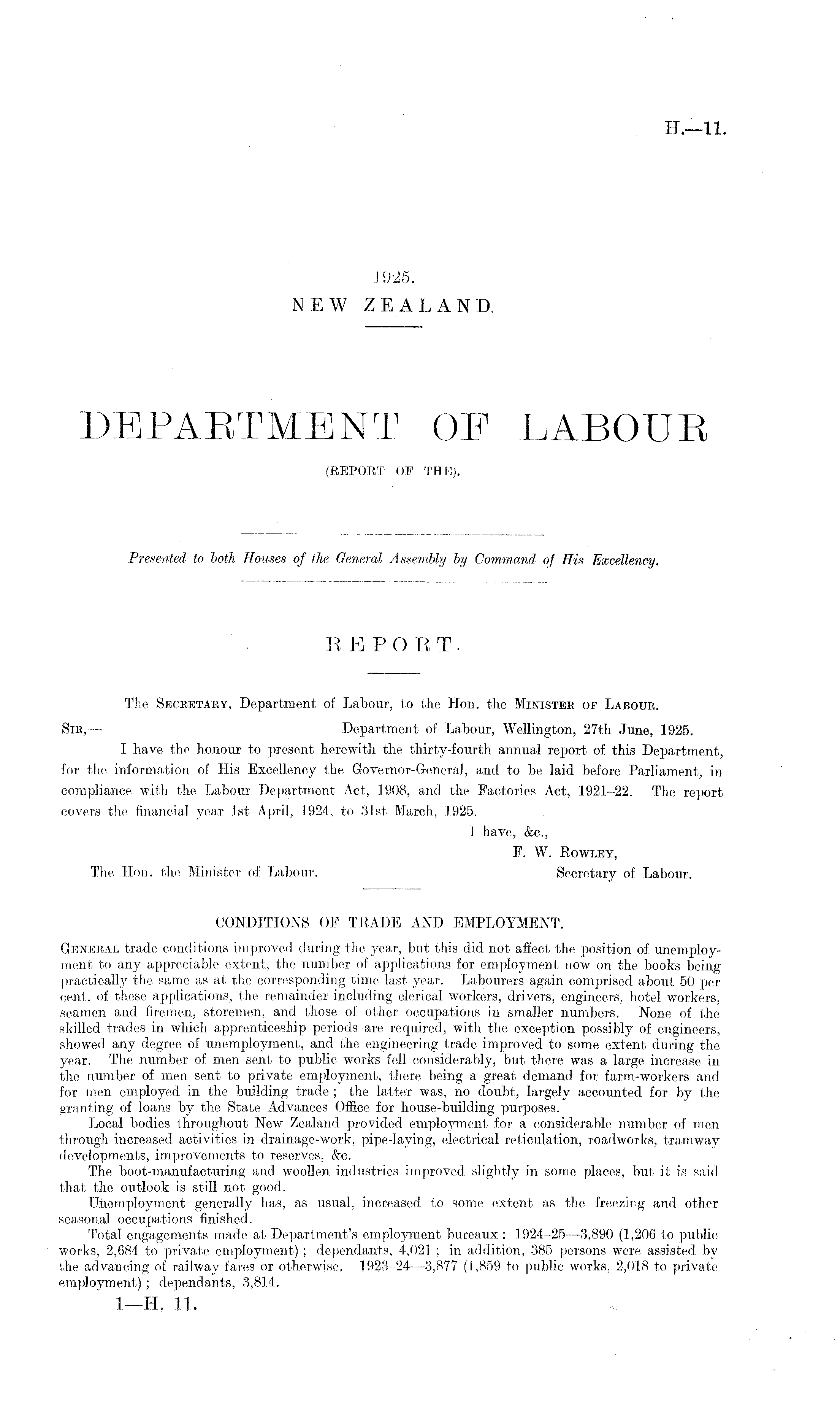 KEPO R T . The Secretary, Department of Labour, to the Hod. the Minister of Labour. Sir, — Department of Labour, Wellington, 27th June, 1925. I have the honour to present herewith the thirty-fourth annual report of this Department, for the information of His Excellency the Governor-General, and to be laid before Parliament, in compliance with the Labour Department Act, 1908, and the Factories Act, 1921-22. The report covers the financial year Ist April, 1924, to 31st March, 1925. 1 have, &c., F. W. Rowley, The Hon. the Minister of Labour. Secretary of Labour. CONDITIONS OF TRADE AND EMPLOYMENT. General trade conditions improved during the year, but this did not affect the position of unemployment to any appreciable extent, the number of applications for employment now on the books being practically the same as at the corresponding time last year. Labourers again comprised about 50 per cent, of these applications, the remainder including clerical workers, drivers, engineers, hotel workers, seamen and firemen, storemen, and those of other occupations in smaller numbers. None of the skilled trades in which apprenticeship periods are required, with the exception possibly of engineers, showed any degree of unemployment, and the engineering trade improved to some extent during the year. The number of men sent to public works fell considerably, but there was a large increase in the number of men sent to private employment, there being a great demand for farm-workers and for men employed in the building trade ; the latter was, no doubt, largely accounted for by the granting of loans by the State Advances Office for house-building purposes. Local bodies throughout New Zealand provided employment for a considerable number of men through increased activities in drainage-work, pipe-laying, electrical reticulation, roadworks, tramway developments, improvements to reserves, &c. The boot-manufacturing and woollen industries improved slightly in some places, but it is said that the outlook is still not good. Unemployment generally has, as usual, increased to some extent as the freezing and other seasonal occupations finished. Total engagements made at Department's employment bureaux : 1924-25 —3,890 (1,206 to public works, 2,684 to private employment) ; dependants, 4,021 ; in addition, 385 persons were assisted, by the advancing of railway fares or otherwise. 1923-24 —3,877 (1,859 to public works, 2,018 to private employment); dependants, 3,814.