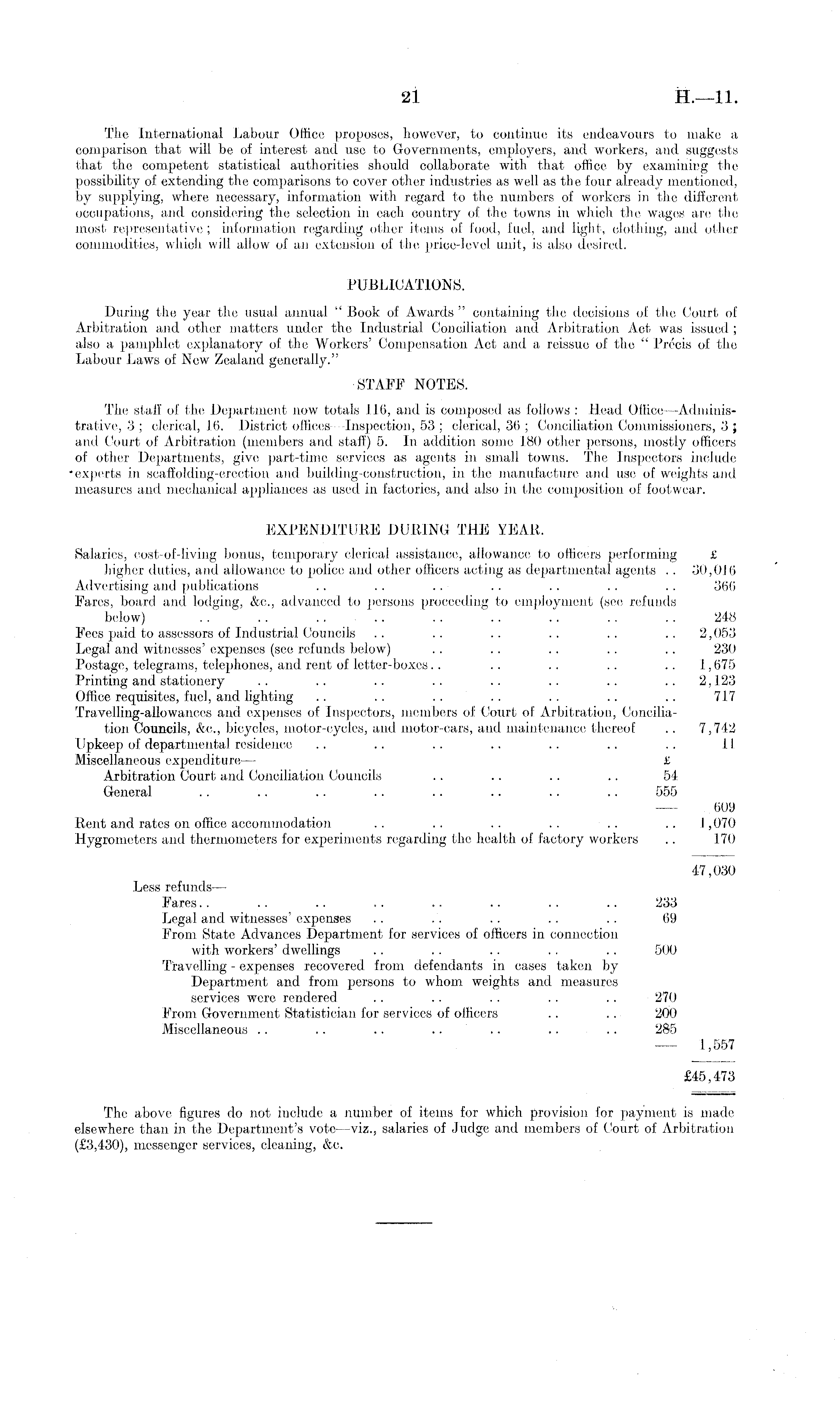 Tlie International Labour Office proposes, however, to continue its endeavours to make a comparison that will be of interest and use to Governments, employers, and workers, and suggests that the competent statistical authorities should collaborate with that office by examining the possibility of extending the comparisons to cover other industries as well as the four already mentioned, by supplying, where necessary, information with regard to the numbers of workers in the different occupations, and considering the selection in each country of the towns in which the wages are the most representative; information regarding other items of food, fuel, and light, clothing, and other commodities, which will allow of an extension of the price-level unit, is also desired. PUBLICATIONS. During the year the usual annual " Book of Awards " containing the decisions of the Court of Arbitration and other matters under the Industrial Conciliation and Arbitration Act was issued ; also a pamphlet explanatory of the Workers' Compensation Act and a reissue of the " Precis of the Labour Laws of New Zealand generally." STAFF NOTES. The staff of the Department now totals 116, and is composed as follows : Head Office —Administrative, 3 ; clerical, 16. District offices—lnspection, 53 ; clerical, 36 ; Conciliation Commissioners, 3 ; anil Court of Arbitration (members and staff) 5. In addition some 180 other persons, mostly officers of other Departments, give part-time services as agents in small towns. The Inspectors include experts in scaffolding-erection and building-construction, in the manufacture and use of weights and measures and mechanical appliances as used in factories, and also in the composition of footwear. EXPENDITURE DURING THE YEAR. Salaries, cost-of-living bonus, temporary clerical assistance, allowance to officers performing £ higher duties, and allowance to police and other officers acting as departmental agents . . 30,016 Advertising and publications .. . . .. .. . . .. .. 366 Fares, board and lodging, &c., advanced to persons proceeding to employment (see refunds below) . . . . .. .. . . .. .. .. .. 248 Fees paid to assessors of Industrial Councils .. .. .. .. .. .. 2,053 Legal and witnesses' expenses (see refunds below) . . .. .. .. .. 230 Postage, telegrams, telephones, and rent of letter-boxes .. .. .. .. .. 1,675 Printing and stationery .. .. .. .. .. .. .. .. 2,123 Office requisites, fuel, and lighting .. .. .. .. .. .. .. 717 Travelling-allowances and expenses of Inspectors, members of Court of Arbitration, Conciliation Councils, &c., bicycles, motor-cycles, and motor-cars, and maintenance thereof .. 7,742 Upkeep of departmental residence .. .. .. .. .. .. .. 11 Miscellaneous expenditure — £ Arbitration Court and Conciliation Councils .. .. .. .. 54 General . . .. .. .. .. .. .. .. 555 609 Rent and rates on office accommodation .. .. . . . . .. .. 1,070 Hygrometers and thermometers for experiments regarding the health of factory workers .. 170 47,030 Less refunds — Fares.. .. .. .. .. .. . . .. 233 Legal and witnesses' expenses . . .. .. .. . . 69 From State Advances Department for services of officers in connection with workers' dwellings .. . . .. .. .. 500 Travelling - expenses recovered from defendants in cases taken by Department and from persons to whom weights and measures services were rendered . . .. . . .. .. 270 From Government Statistician for services of officers .. .. 200 Miscellaneous .. .. .. .. .. .. .. 285 1,557 £45,473 The above figures do not include a number of items for which provision for payment is made elsewhere than in the Department's vote —viz., salaries of Judge and members of Court of Arbitration (£3,430), messenger services, cleaning, &c.