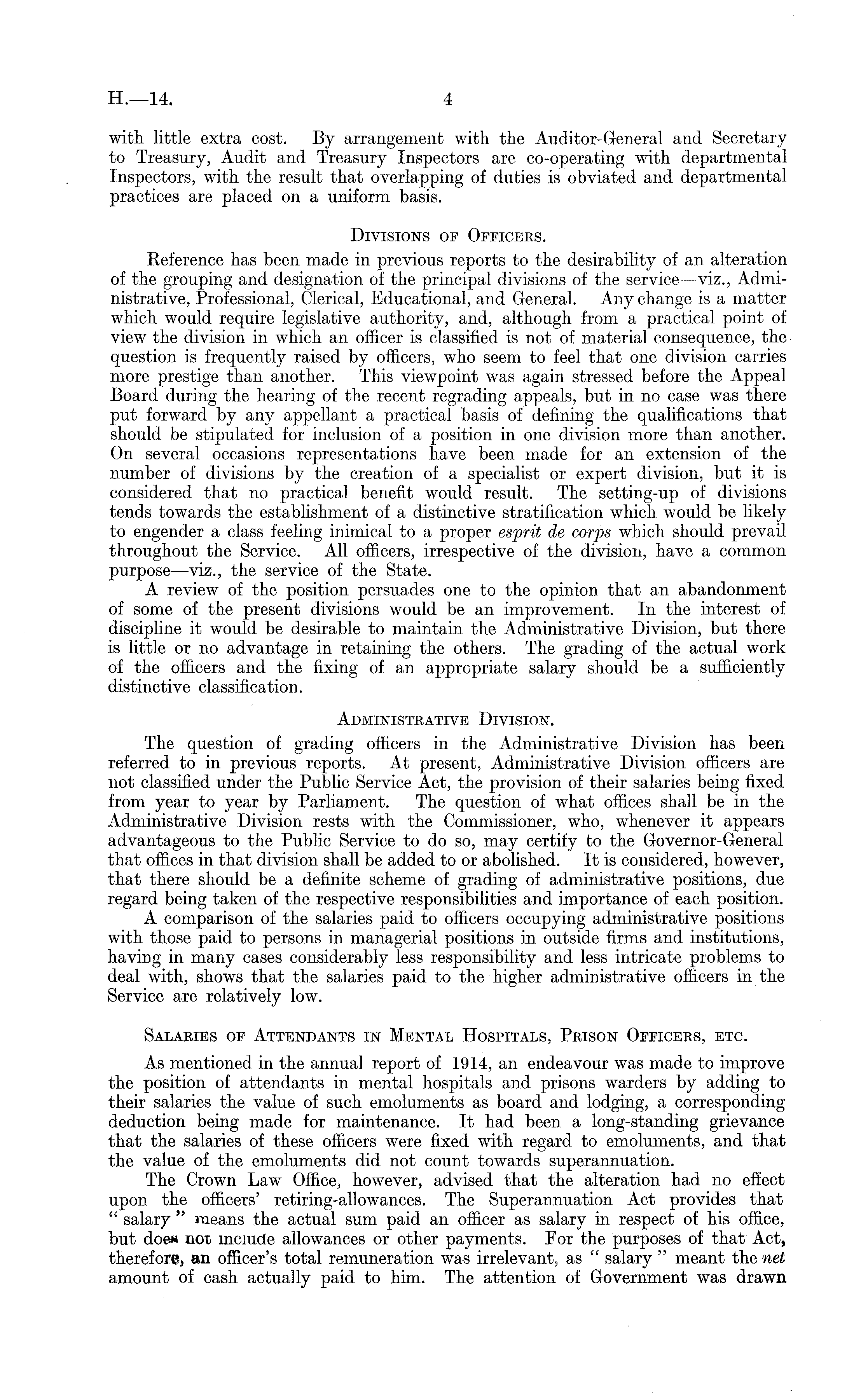with, little extra cost. By arrangement with the Auditor-General and Secretary to Treasury, Audit and Treasury Inspectors are co-operating with departmental Inspectors, with the result that overlapping of duties is obviated and departmental practices are placed on a uniform basis. Divisions op Officers. Reference has been made in previous reports to the desirability of an alteration of the grouping and designation of the principal divisions of the service -viz., Administrative, Professional, Clerical, Educational, and General. Any change is a matter which would require legislative authority, and, although from a practical point of view the division in which an officer is classified is not of material consequence, the question is frequently raised by officers, who seem to feel that one division carries more prestige than another. This viewpoint was again stressed before the Appeal Board during the hearing of the recent regrading appeals, but in no case was there put forward by any appellant a practical basis of defining the qualifications that should be stipulated for inclusion of a position in one division more than another. On several occasions representations have been made for an extension of the number of divisions by the creation of a specialist or expert division, but it is considered that no practical benefit would result. The setting-up of divisions tends towards the establishment of a distinctive stratification which would be likely to engender a class feeling inimical to a proper esprit de corps which should prevail throughout the Service. All officers, irrespective of the division, have a common purpose —viz., the service of the State. A review of the position persuades one to the opinion that an abandonment of some of the present divisions would be an improvement. In the interest of discipline it would be desirable to maintain the Administrative Division, but there is little or no advantage in retaining the others. The grading of the actual work of the officers and the fixing of an appropriate salary should be a sufficiently distinctive classification. Administrative Division. The question of grading officers in the Administrative Division has been referred to in previous reports. At present, Administrative Division officers are not classified under the Public Service Act, the provision of their salaries being fixed from year to year by Parliament. The question of what offices shall be in the Administrative Division rests with the Commissioner, who, whenever it appears advantageous to the Public Service to do so, may certify to the Governor-General that offices in that division shall be added to or abolished. It is considered, however, that there should be a definite scheme of grading of administrative positions, due regard being taken of the respective responsibilities and importance of each position. A comparison of the salaries paid to officers occupying administrative positions with those paid to persons in managerial positions in outside firms and institutions, having in many cases considerably less responsibility and less intricate problems to deal with, shows that the salaries paid to the higher administrative officers in the Service are relatively low. Salaries of Attendants in Mental Hospitals, Prison Officers, etc. As mentioned in the annual report of 1914, an endeavour was made to improve the position of attendants in mental hospitals and prisons warders by adding to their salaries the value of such emoluments as board and lodging, a corresponding deduction being made for maintenance. It had been a long-standing grievance that the salaries of these officers were fixed with regard to emoluments, and that the value of the emoluments did not count towards superannuation. The Crown Law Office, however, advised that the alteration had no effect upon the officers' retiring-allowances. The Superannuation Act provides that " salary " means the actual sum paid an officer as salary in respect of his office, but doe* not include allowances or other payments. For the purposes of that Act, therefore, an officer's total remuneration was irrelevant, as " salary " meant the net amount of cash actually paid to him. The attention of Government was drawn