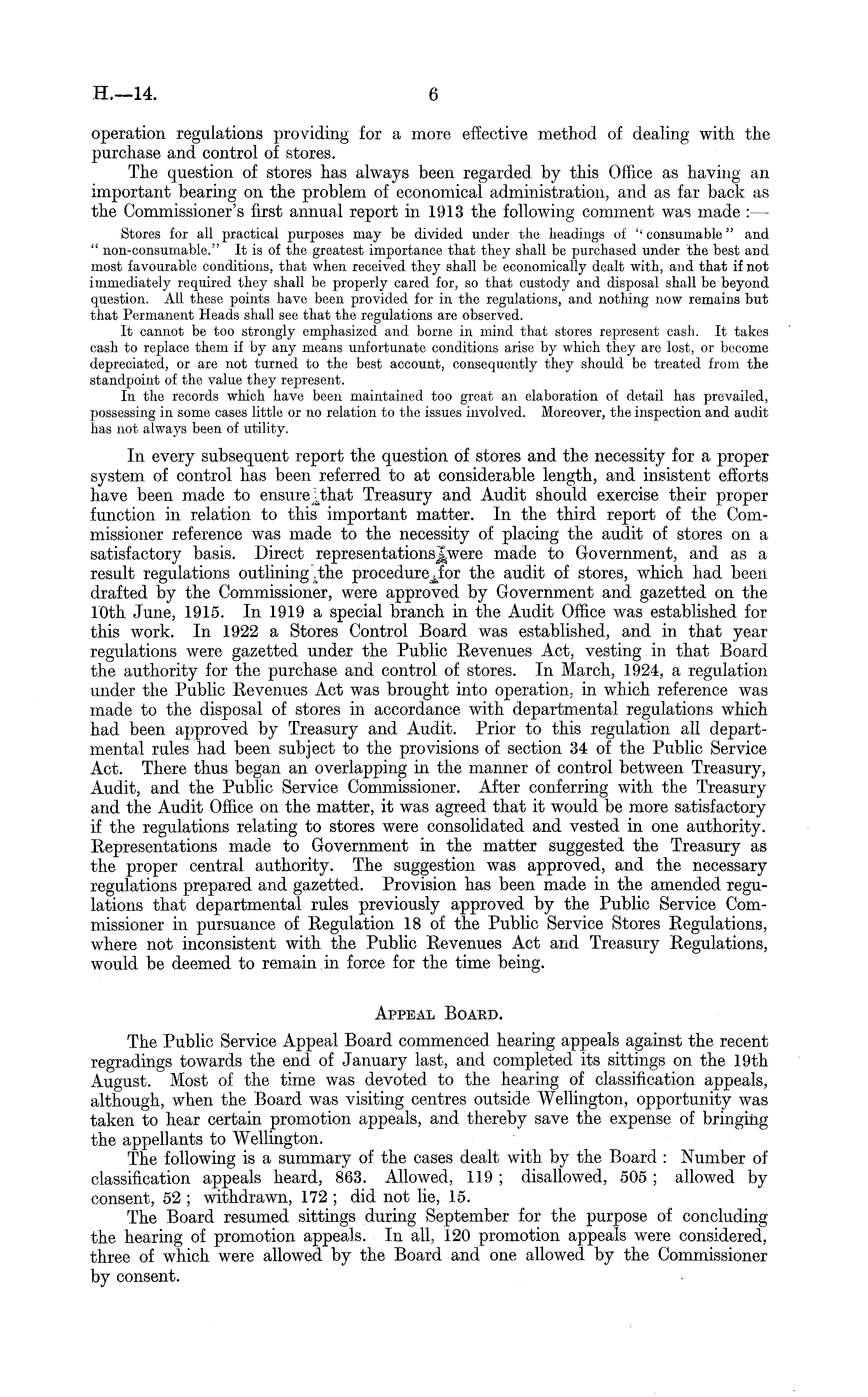 operation regulations providing for a more effective method of dealing with the purchase and control of stores. The question of stores has always been regarded by this Office as having an important bearing on the problem of economical administration, and as far back as the Commissioner's first annual report in 1913 the following comment was made :— Stores for all practical purposes may be divided under the headings of '' consumable" and " non-consumable." It is of the greatest importance that they shall be purchased under the best and most favourable conditions, that when received they shall be economically dealt with, and that if not immediately required they shall be properly cared for, so that custody and disposal shall be beyond question. All these points have been provided for in the regulations, and nothing now remains but that Permanent Heads shall see that the regulations are observed. It cannot be too strongly emphasized and borne in mind that stores represent cash. It takes cash to replace them if by any means unfortunate conditions arise by which they are lost, or become depreciated, or are not turned to the best account, consequently they should be treated from the standpoint of the value they represent. In the records which have been maintained too great an elaboration of detail has prevailed, possessing in some cases little or no relation to the issues involved. Moreover, the inspection and audit has not always been of utility. In every subsequent report the question of stores and the necessity for a proper system of control has been referred to at considerable length, and insistent efforts have been made to ensure Treasury and Audit should exercise their proper function in relation to this important matter. In the third report of the Commissioner reference was made to the necessity of placing the audit of stores on a satisfactory basis. Direct representationsJwere made to Government, and as a result regulations outlining the procedure A for the audit of stores, which had been drafted by the Commissioner, were approved by Government and gazetted on the 10th June, 1915. In 1919 a special branch in the Audit Office was established for this work. In 1922 a Stores Control Board was established, and in that year regulations were gazetted under the Public Revenues Act, vesting in that Board the authority for the purchase and control of stores. In March, 1924, a regulation under the Public Revenues Act was brought into operation, in which reference was made to the disposal of stores in accordance with departmental regulations which had been approved by Treasury and Audit. Prior to this regulation all departmental rules had been subject to the provisions of section 34 of the Public Service Act. There thus began an overlapping in the manner of control between Treasury, Audit, and the Public Service Commissioner. After conferring with the Treasury and the Audit Office on the matter, it was agreed that it would be more satisfactory if the regulations relating to stores were consolidated and vested in one authority. Representations made to Government in the matter suggested the Treasury as the proper central authority. The suggestion was approved, and the necessary regulations prepared and gazetted. Provision has been made in the amended regulations that departmental rules previously approved by the Public Service Commissioner in pursuance of Regulation 18 of the Public Service Stores Regulations, where not inconsistent with the Public Revenues Act and Treasury Regulations, would be deemed to remain in force for the time being. Appeal Board. The Public Service Appeal Board commenced hearing appeals against the recent regradings towards the end of January last, and completed its sittings on the 19th August. Most of the time was devoted to the hearing of classification appeals, although, when the Board was visiting centres outside Wellington, opportunity was taken to hear certain promotion appeals, and thereby save the expense of bringing the appellants to Wellington. The following is a summary of the cases dealt with by the Board : Number of classification appeals heard, 863. Allowed, 119 ; disallowed, 505 ; allowed by consent, 52 ; withdrawn, 172 ; did not lie, 15. The Board resumed sittings during September for the purpose of concluding the hearing of promotion appeals. In all, 120 promotion appeals were considered, three of which were allowed by the Board and one allowed by the Commissioner by consent.