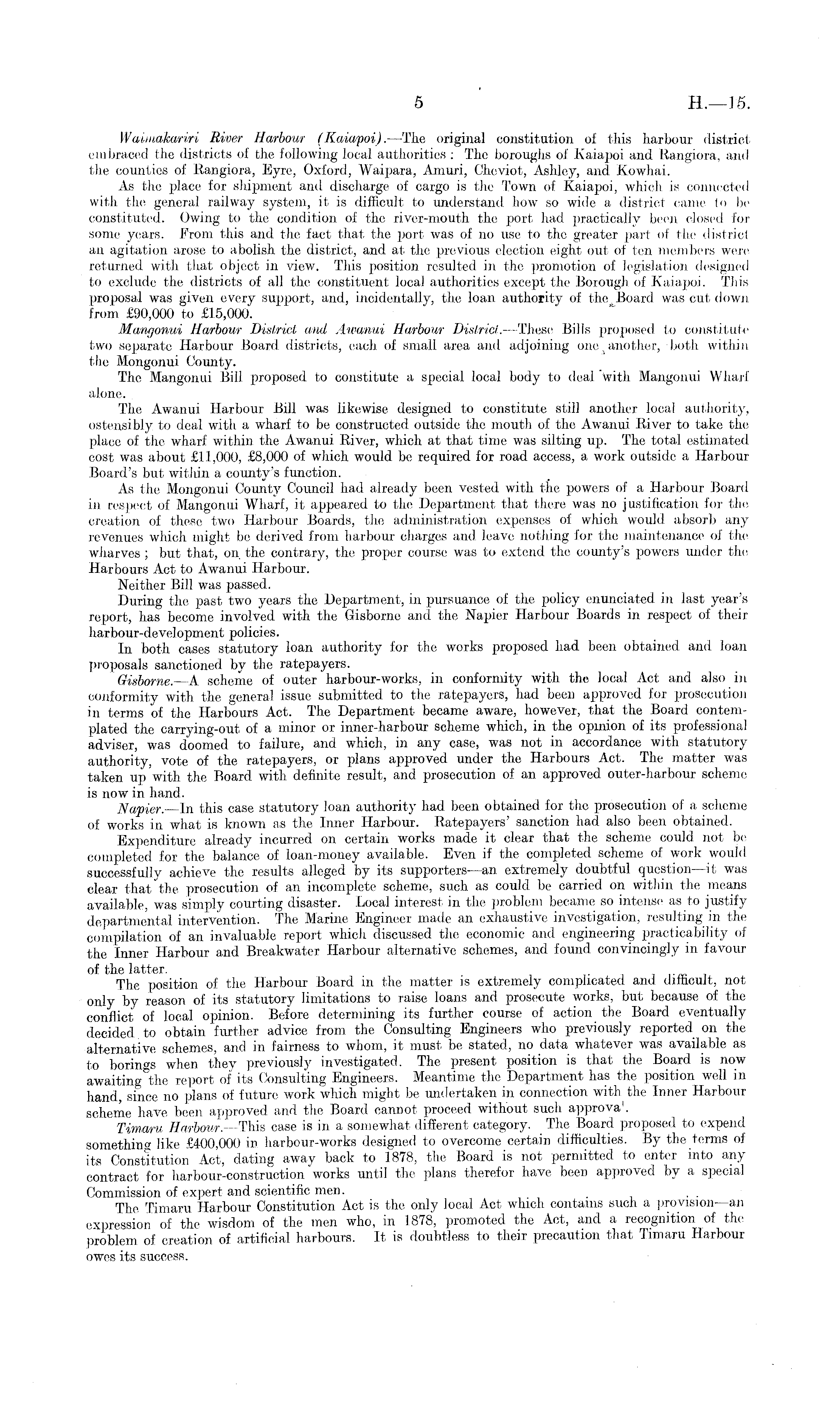 Waimakariri River Harbour (Kaiapoi). —The original constitution oi this harbour district embraced the districts of the following local authorities : The boroughs of Kaiapoi and Rangiora, and the counties of Rangiora, Eyre, Oxford, Waipara, Aniuri, Cheviot, Ashley, and Kowhai. As the place for shipment and discharge of cargo is the Town of Kaiapoi, which is connected with the general railway system, it is difficult to understand how so wide a district came to be constituted. Owing to the condition of the river-mouth the port had practically been closed for some years. From this and the fact that the port was of no use to the greater part of the district an agitation arose to abolish the district, and at the previous election eight out of ten members were returned with that object in view. This position resulted in the promotion of legislation designed to exclude the districts of all the constituent local authorities except the Borough of Kaiapoi. This proposal was given every support, and, incidentally, the loan authority of the Board was cut down from £90,000 to £15,000. Mangonui Harbour District and Atoanui Harbour District. —These Bills proposed to constitute two separate Harbour Board districts, each of small area and adjoining one s another, both within the Mongonui County. The Mangonui Bill proposed to constitute a special local body to deal With Mangonui Wharf alone. . The Awaiiui Harbour Bill was likewise designed to constitute still another local authority, ostensibly to deal with a wharf to be constructed outside the mouth of the Awanui River to take the place of the wharf within the Awanui River, which at that time was silting up. The total estimated cost was about £11,000, £8,000 of which would be required for road access, a work outside a Harbour Board's but within a county's function. As the Mongonui County Council had already been vested with the powers of a Harbour Board in respect of Mangonui Wharf, it appeared to the Department that there was no justification for the creation of these two Harbour Boards, the administration expenses of which would absorb any revenues which might be derived from harbour charges and leave nothing for the maintenance of the wharves ; but that, on. the contrary, the proper course was to extend the county's powers under the Harbours Act to Awanui Harbour. Neither Bill was passed. During the past two years the Department, in pursuance of the policy enunciated in last year's report, has become involved with the Gisborne and the Napier Harbour Boards in respect of their harbour-development policies. In both cases statutory loan authority for the works proposed had been obtained and loan proposals sanctioned by the ratepayers. Gisborne. —A scheme of outer harbour-works, in conformity with the local Act and also in conformity with the general issue submitted to the ratepayers, had been approved for prosecution in terms of the Harbours Act. The Department' became aware, however, that the Board contemplated the carrying-out of a minor or inner-harbour scheme which, in the opinion of its professional adviser, was doomed to failure, and which, in any case, was not in accordance with statutory authority, vote of the ratepayers, or plans approved under the Harbours Act. The matter was taken up with the Board with definite result, and prosecution of an approved outer-harbour scheme is now in hand. Napier.—ln this case statutory loan authority had been obtained for the prosecution of a scheme of works in what is known as the Inner Harbour. Ratepayers' sanction had also been obtained. Expenditure already incurred on certain works made it clear that the scheme could not be completed for the balance of loan-money available. Even if the completed scheme of work would successfully achieve the results alleged by its supporters—an extremely doubtful question—it was clear that the prosecution of an incomplete scheme, such as could, be carried on within the means available, was simply courting disaster. Local interest in the problem became so intense as to justify departmental intervention. The Marine Engineer made an exhaustive investigation, resulting in the compilation of an invaluable report which discussed the economic and engineering practicability of the Inner Harbour and Breakwater Harbour alternative schemes, and found convincingly in favour of the latter. . ~ „ The position of the Harbour Board in the matter is extremely complicated and difficult, not only by reason of its statutory limitations to raise loans and prosecute works, but because of the conflict of local opinion. Before determining its further course of action the Board eventually decided to obtain further advice from the Consulting Engineers who previously reported on the alternative schemes, and in fairness to whom, it must be stated, no data whatever was available as to borings when they previously investigated. The present position is that the Board is now awaiting°the report of its Consulting Engineers. Meantime the Department has the position well in hand, since no plans of future work which might be undertaken in connection with the Inner Harbour scheme have been approved and the Board cannot- proceed without such approva 1 . Timaru Harbour.— This case is in a somewhat different category. The Board proposed to expend something like £400,000 in harbour-works designed to overcome certain difficulties. By the terms of its Constitution Act, dating away back to 1878, the Board is not permitted to enter into any contract for harbour-construction works until the plans therefor have been approved by a special Commission of expert and scientific men. The Timaru Harbour Constitution Act is the only local Act which contains such a provision—an expression of the wisdom of the men who, in 1878, promoted the Act, and a recognition of the problem of creation of artificial harbours. It is doubtless to their precaution that Timaru Harbour owes its success.