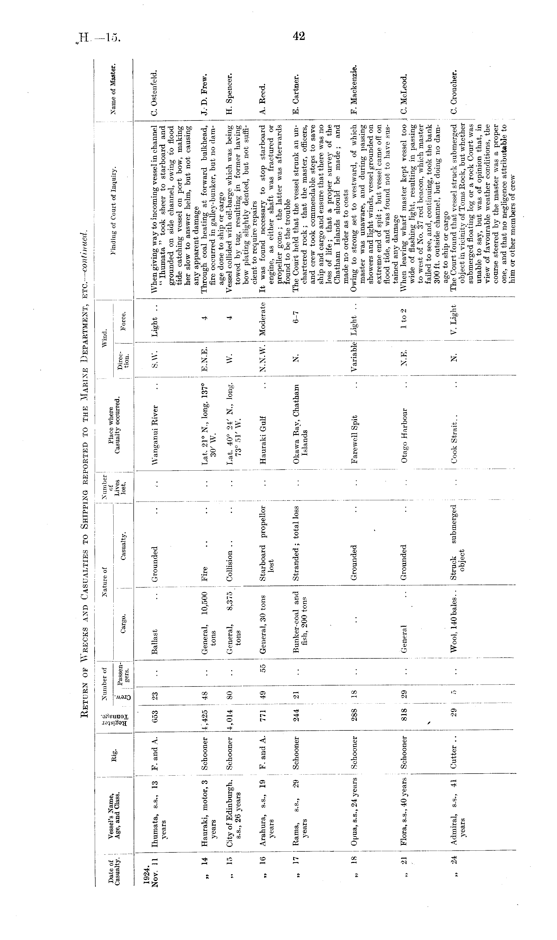 1 • i I I I ! I I £ ® Number of j Nature of Number' Wind. Date of Vessel's Name, R . «g j of Place where Finding of Court of Inquiry. Name of Master. Casualty. Age, and Class. ° Lives Casualty occurred. n;™j | gers | Carg0 - i Casualty. lost. | | Force. j I 1924. ! Nov. 11 Ihumata, s.s.. 13 F. and A. 653 23 .. Ballast .. Grounded .. .. Wanganui River .. I S.W. Light .. When giving way to incoming vessel in channel C. Ostenfeld. years j " Ihumata" took sheer to starboard and grounded on side channel, owing to flood tide catching vessel on port bow, making her slow to answer helm, but not causing any apparent damage „ 14 Hauraki, motor, 3 ; Schooner 4,425 48 .. General, 10,500 Fire .. .. i .. Lat. 21° N., long. 137° j E.N.E. 4 Through coal heating at forward bulkhead, J.D.Frew, years tons 30' W. fire occurred in galley-bunker, but no damage done to ship or cargo „ 15 City of Edinburgh, Schooner 4,014 80 .. General, 8,375 Collision .. .. .. Lat. 40° 24' N., long. ; W. 4 Vessel collided with oil-barge which was being H.Spencer, s.s., 26 years tons 73° 51/ W. towed by tug, resulting in former having bow plating slightly dented, but not sufficient to require repairs „ 16 Arahura, s.s., 19 F. and A. 771 49 55 General, 30 tons Starboard propellor .. Hauraki Gulf .. N.N.W. Moderate It was found necessary to stop starboard A. Reed. years lost j j engine, as either shaft was fractured or propeller gone ; the latter was afterwards found to be the trouble „ 17 Rama, s.s., 29 Schooner 244 21 .. Bunker-coal and Stranded; total loss i .. Okawa Bay, Chatham N. 6-7 The Court held that the vessel strunk an un- E. Cartner. years fish, 200 tons j ' Islands chartered rock; that the master, officers, j j and crew took commendable steps to save ship and cargo and ensure that there was no | loss of life; that a proper survey of the Chatham Islands should be made; and made no order as to costs „ 18 Opua, s.s., 24 years Schooner 288 18 .. Grounded .. •• Farewell Spit .. | Variable Light .. Owing to strong set to westward, of which F.Mackenzie. master was unaware, and during passing showers and light winds, vessel grounded on extreme end of spit; but vessel came off on flood tide, and was found not to have sustained any damage „ 21 i Flora, s.s., 40 years Schooner 818 i 29 .. General .. Grounded .. .. Otago Harbour .. I N.E. 1 to 2 When leaving wharf master kept vessel too 0. McLeod. I • ! wide of flashing light, resulting in passing to west of No. 37 red beacon, which master n j failed to see, and, continuing, took the bank 300 ft. outside channel, but doing no damage to ship or cargo „ 24 Admiral, s.s., 41 Cutter.. 29 5 .. Wool, 140 bales. . Struck submerged .. Cook Strait.. .. N. V. Light The Court found that vessel struck submerged C. Croucher. years object object in vicinity of Toms Rock, but whether submerged floating log or a rock Court was unable to say, but was of opinion that, in view of favourable weather conditions, the course steered by the master was a proper one, and that no negligence attributable to him or other members of crew