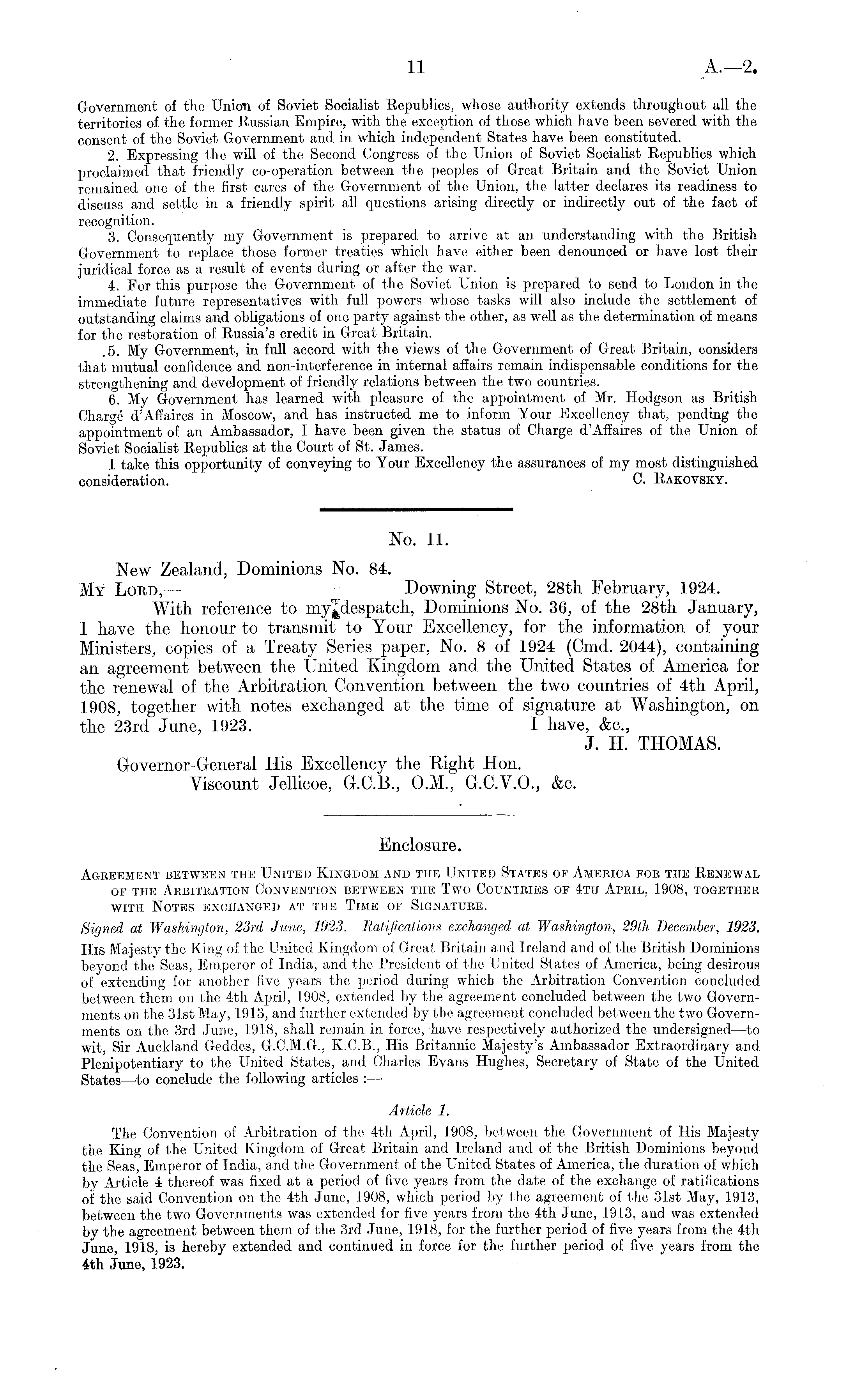No. 11. New Zealand, Dominions No. 84. My Lord, — Downing Street, 28th February, 1924. With reference to my Dominions No. 36, of the 28th January, I have the honour to transmit to Your Excellency, for the information of your Ministers, copies of a Treaty Series paper, No. 8 of 1924 (Cmd. 2044), containing an agreement between the United Kingdom and the United States of America for the renewal of the Arbitration Convention between the two countries of 4th April, 1908, together with notes exchanged at the time of signature at Washington, on the 23rd June, 1923. I have, &c., J. H. THOMAS. Governor-General His Excellency the Right Hon. Viscount Jellicoe, G.C.8., 0.M., G.C.V.0., &c.