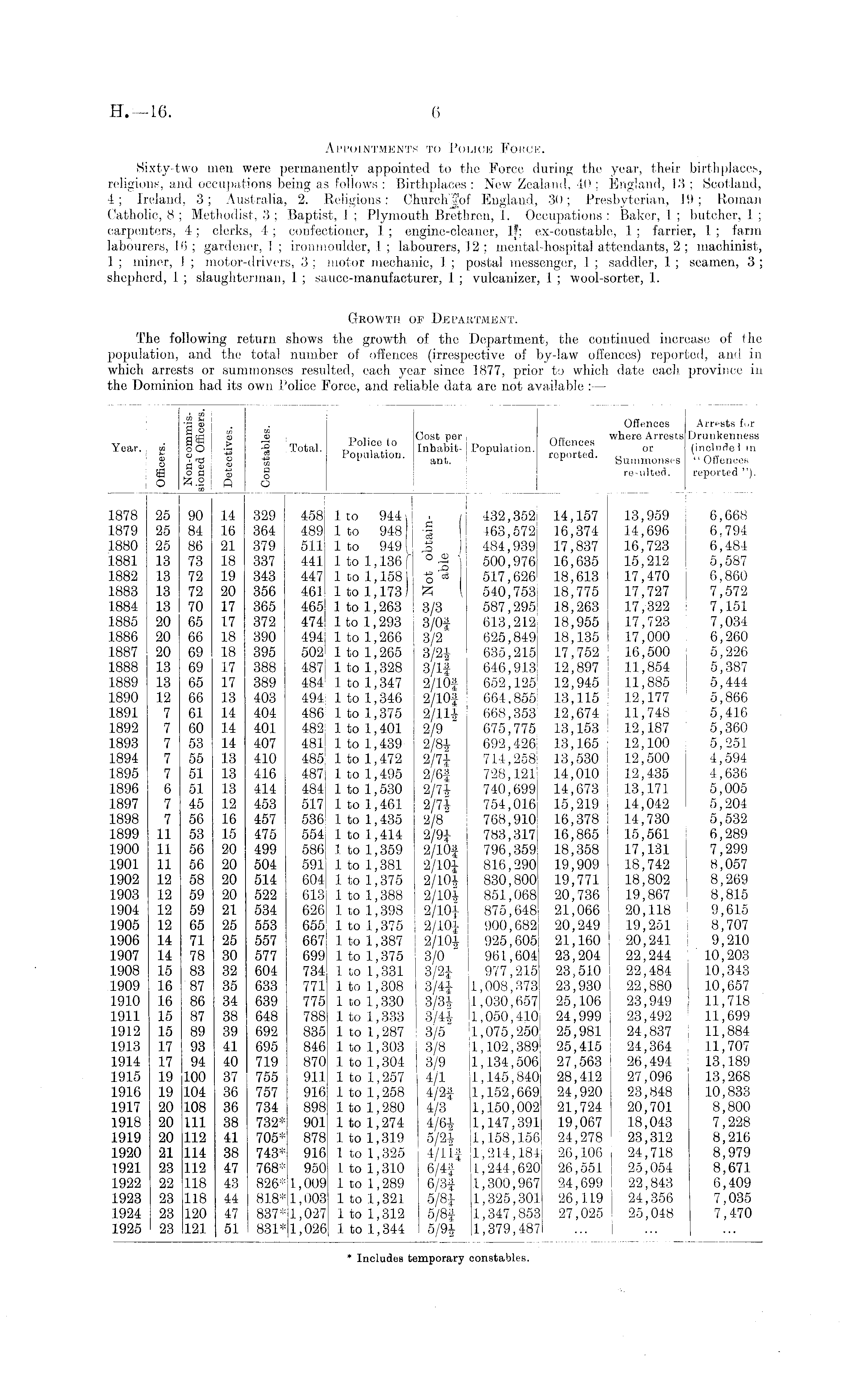 Appointments to Police Force. Sixty-two men were permanently appointed to the Force during the year, their birthplaces, religions, and occupations being as follows : Birthplaces : New Zealand, 40 ; England, 13 ; Scotland, 4; Ireland, 3; Australia, 2. Religions: Church j|of England, 30; Presbyterian, 19 ; Roman Catholic, 8 ; Methodist, 3 ; Baptist, 1 ; Plymouth Brethren, 1. Occupations : Baker, 1 ; butcher, 1 ; carpenters, 4; clerks, 4; confectioner, 1 ; engine-cleaner, If; ex-constable, 1 ; farrier, 1 ; farm labourers, 16 ; gardener, 1 ; ironnioulder, 1 ; labourers, 12 ; mental-hospital attendants, 2 ; machinist, 1 ; miner, J ; motor-drivers, 3 ; motor mechanic, 1 ; postal messenger, 1 ; saddler, 1 ; seamen, 3 ; shepherd, 1 ; slaughterman, 1 ; sauce-manufacturer, 1 ; vulcanizer, 1 ; wool-sorter, 1. Growth of Department. The following return shows the growth of the Department, the continued increase of the population, and the total number of offences (irrespective of by-law offences) reported, and in which arrests or summonses resulted, each year since 1877, prior to which date each province in the Dominion had its own Police Force, and reliable data are not available :—