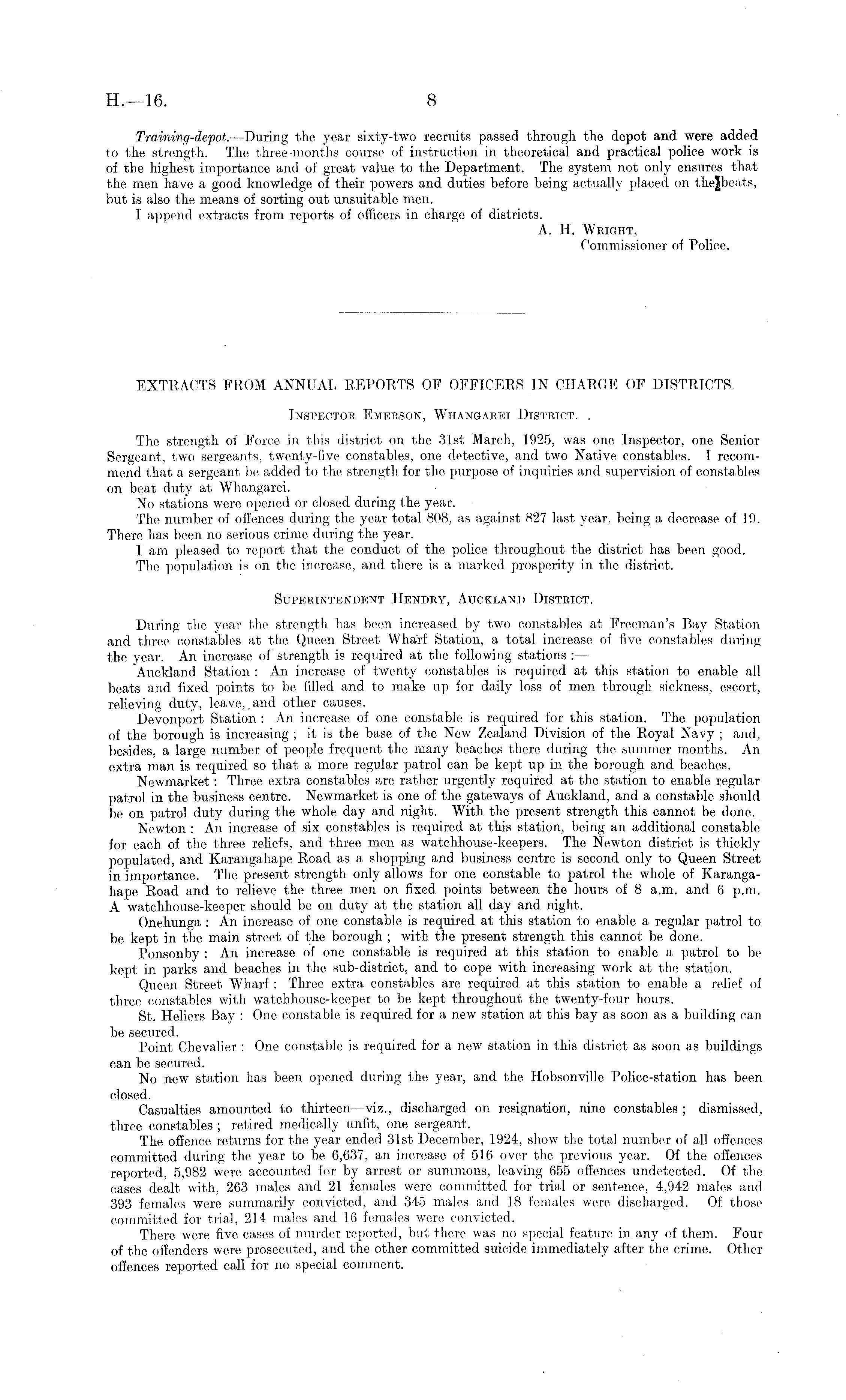 EXTRACTS FROM ANNUAL REPORTS OF OFFICERS IN CHARGE OF DISTRICTS. Inspector Emerson, Whangarei District. , The strength of Force in this district on the 31st March, 1925, was one Inspector, one Senior Sergeant, two sergeants, twenty-five constables, one detective, and two Native constables. 1 recommend that a sergeant be added to the strength for the purpose of inquiries and supervision of constables on beat duty at Wliangarei. No stations were opened or closed during the year. The number of offences during the year total 808, as against 827 last year, being a decrease of 19. Tli ere has been no serious crime during the year. I am pleased to report that the conduct of the police throughout the district has been good. The population is on the increase, and there is a marked prosperity in the district. Superintendent Hendry, Auckland District. During the year the strength has been increased by two constables at Freeman's Bay Station and three constables at the Queen Street Wharf Station, a total increase of five constables during the year. An increase of strength is required at the following stations : — Auckland Station : An increase of twenty constables is required at this station to enable all beats and fixed points to be filled and to make up for daily loss of men through sickness, escort, relieving duty, leave,.and other causes. Devonport Station : An increase of one constable is required for this station. The population of the borough is increasing ; it is the base of the New Zealand Division of the Royal Navy ; and, besides, a large number of people frequent the many beaches there during the summer months. An extra man is required so that a more regular patrol can be kept up in the borough and beaches. Newmarket: Three extra constables are rather urgently required at the station to enable regular patrol in the business centre. Newmarket is one of the gateways of Auckland, and a constable should be on patrol duty during the whole day and night. With the present strength this cannot be done. Newton : An increase of six constables is required at this station, being an additional constable for each of the three reliefs, and three men as watchhouse-keepers. The Newton district is thickly populated, and Karangahape Road as a shopping and business centre is second only to Queen Street in importance. The present strength only allows for one constable to patrol the whole of Karangahape Road and to relieve the three men on fixed points between the hours of 8 a.m. and 6 p.m. A watchhouse-keeper should be on duty at the station all day and night. Onehunga : An increase of one constable is required at this station to enable a regular patrol to be kept in the main street of the borough ; with the present strength this cannot be done. Ponsonby : An increase of one constable is required at this station to enable a patrol to be kept in parks and beaches in the sub-district, and to cope with increasing work at the station. Queen Street Wharf : Three extra constables are required at this station to enable a relief of three constables with watchhouse-keeper to be kept throughout the twenty-four hours. St. Heliers Bay : One constable is required for a new station at this bay as soon as a building can be secured. Point Chevalier : One constable is required for a new station in this district as soon as buildings can be secured. No new station has been opened during the year, and the Hobsonville Police-station has been closed. Casualties amounted to thirteen —viz., discharged on resignation, nine constables ; dismissed, three constables ; retired medically unfit, one sergeant. The offence returns for the year ended 31st December, 1924, show the total number of all offences committed during the year to be 6,637, an increase of 516 over the previous year. Of the offences reported, 5,982 were accounted for by arrest or summons, leaving 655 offences undetected. Of the cases dealt with, 263 males and 21 females were committed for trial or sentence, 4,94-2 males and 393 females were summarily convicted, and 345 males and 18 females were discharged. Of those committed for trial, 214 males and 16 females were convicted. There were five cases of murder reported, but there was no special feature in any of them. Four of the offenders were prosecuted, and the other committed suicide immediately after the crime. Other offences reported call for no special comment.