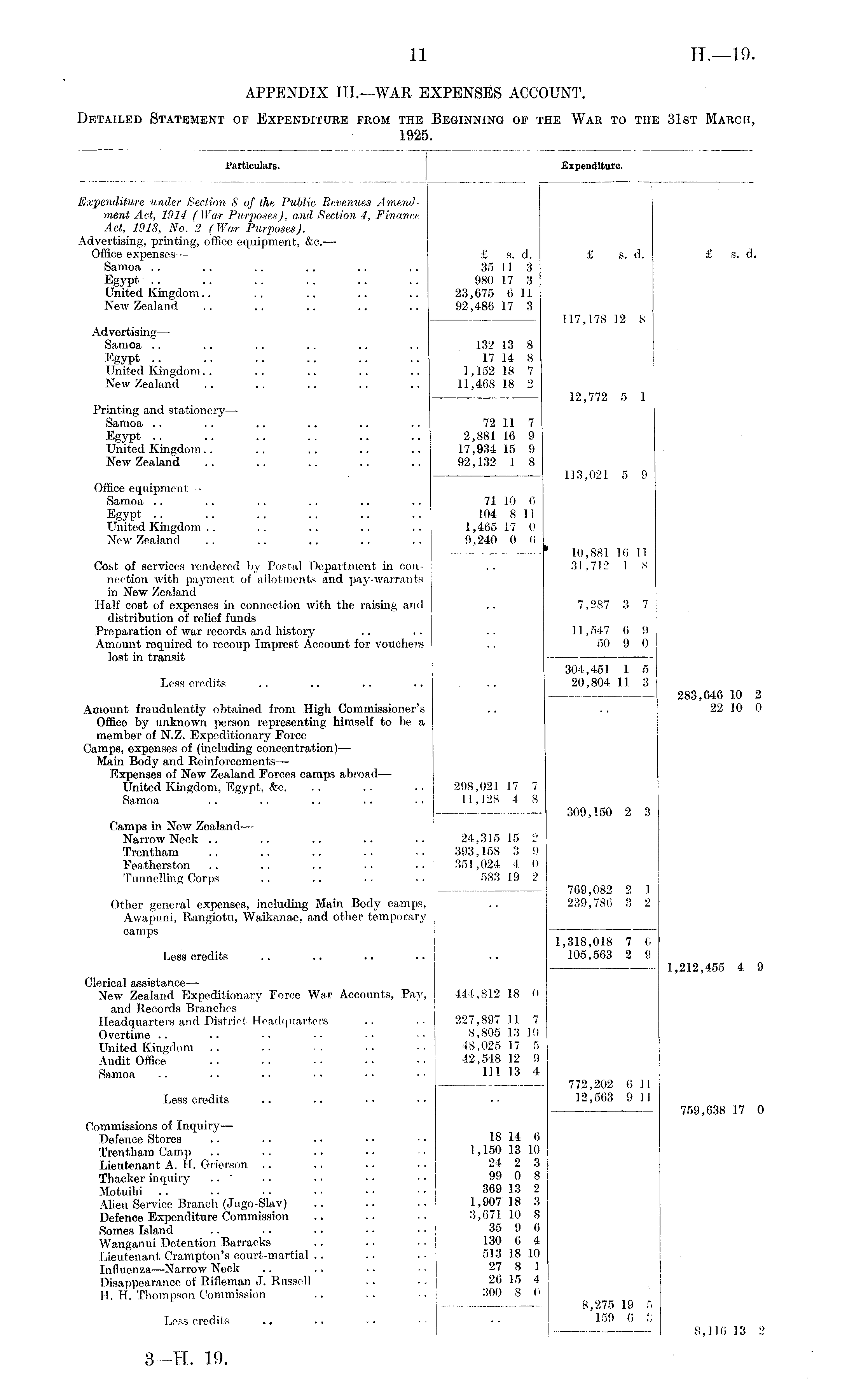 Particulars. Expenditure. Expenditure under Section 8 of the Public Revenues Amendment Act, 1914 (War Purposes), and, Section 4, Finance Act, 1918, No. 2 (War Purposes). Advertising, printing, office equipment, &c.— Office expenses— £ s. d. £ s. d. £ s. d. Samoa .. .. .. .. .. .. 35 11 3 Egypt .. .. .. .. .. .. 980 17 3 United Kingdom.. .. .. .. .. 23,675611 New Zealand .. .. .. .. .. 92,486 17 3 — 117,178 12 8 Advertising— Samoa .. .. .. .. .. .. 132 13 8 Egypt .. .. .. .. .. .. 17 14 8 United Kingdom.. .. .. .. .. 1,152 18 7 New Zealand .. .. .. .. .. 11,468 18 2 12,772 5 1 Printing and stationery —- Samoa .. .. .. .. .. .. 72 11 7 Egypt .. .. .. .. .. .. 2,881 16 9 United Kingdom.. .. .. .. .. 17,934 15 9 New Zealand .. .. .. .. .. 92,132 1 8 113,021 5 9 Office equipment— Samoa .. .. .. .. .. .. 71 10 6 Egypt .. .. .. .. .. .. 104 8 11 United Kingdom .. .. .. .. .. 1,465 17 0 New Zealand .. .. .. .. .. 9,240 0 6 ' 10,881 16 11 Cost of services rendered by Postal Department in con- .. 31,712 1 8 nection with payment of allotments and pay-warrants in New Zealand Half cost of expenses in connection with the raising and .. 7,287 3 7 distribution of relief funds Preparation of war records and history .. .. .. 11,547 6 9 Amount required to recoup Imprest Account for vouchers .. 50 9 0 lost in transit ——— 304,451 1 5 Less credits .. .. .. .. .. 20,804 11 3 283,646 10 2 Amount fraudulently obtained from High Commissioner's .. .. 22 10 0 Office by unknown person representing himself to be a member of N.Z. Expeditionary Force Camps, expenses of (including concentration) — Main Body and ReinforcementsExpenses of New Zealand Forces camps abroad— United Kingdom, Egypt, <fec. .. .. .. 298,021 17 7 Samoa .. .. .. .. •• 11,128 4 8 309,150 2 3 Camps in New Zealand— Narrow Neck .. .. .. .. 24,315 15 2 Trentham .. .. .. .. .. 393,158 3 9 Featherston .. .. .. .. .. 351,024 4 0 Tunnelling Corps .. .. .. . • 583 19 2 : 769,082 2 1 Other general expenses, including Main Body camps, .. 239,786 3 2 Awapuni, Rangiotu, Waikanae, and other temporary camps 1,318,018 7 6 Less credits .. .. .. • ■ .. 105,563 2 9 — 1,212,455 4 9 Clerical assistance — New Zealand Expeditionary Force War Accounts, Pay, 444,812 18 0 and Records Brandies Headquarters and District Headquarters .. .. 227,897 11 7 Overtime .. .. •• •• •• •• I 8,805 13 10 United Kingdom .. .. .. •• j 48,025 17 5 Audit Office .. .. •• •• 42,548 12 9 Samoa .. .. .. •• •• 111 13 4 772,202 6 11 Less credits .. .. .. • • • ■ 12,563 9 1 ] 759,638 17 0 Commissions of Inquiry— Defence Stores .. . • • ■ • • • ■ 18 14 6 Trentham Camp .. .. .. .. •• 1,150 13 10 Lieutenant A. H. Grierson .. .. • • • • 24 2 3 Thacker inquiry .. ' .. .. • • • • 99 0 8 Motuilii .. • ■ • • • • • • • • 13 2 Alien Service Branch (Jugo-Slav) .. .. . • 1,907 18 3 Defence Expenditure Commission .. .. -. 3,671 10 8 Somes Island .. ■. • • ■ • • • 35 9 6 Wanganui Detention Barracks .. • • ■ • 130 6 4 Lieutenant Crampton's court-martial .. .. . - 513 18 10 Influenza —Narrow Neck .. .. .. ■ ■ 27 8 1 Disappearance of Rifleman J. Russell .. • • 26 15 4 H. H. Thompson Commission .. .. - - ! 300 8 0 ' i 8,275 19 r, Less credits .. .. •• I •• 15'' " " | | 8,116 13 2