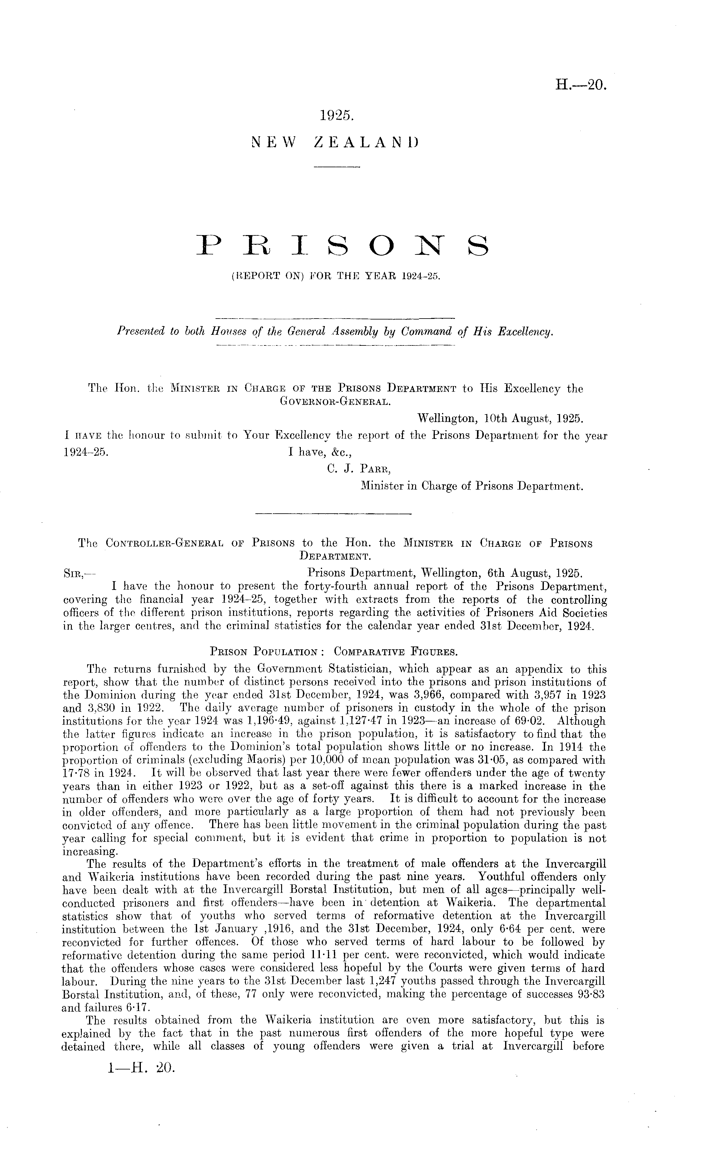 The Controller-General of Prisons to the Hon. the Minister in Charge op Prisons Department. Sir, — Prisons Department, Wellington, 6th August, 1925. I have the honour to present the forty-fourth annual report of the Prisons Department, covering the financial year 1924-25, together with extracts from the reports of the controlling officers of the different prison institutions, reports regarding the. activities of Prisoners Aid Societies in the larger centres, and the criminal statistics for the calendar year ended 31st December, 1924. Prison Population : Comparative Figures. The returns furnished by the Government Statistician, which appear as an appendix to this report, show that the number of distinct persons received into the prisons and prison institutions of the Dominion during the year ended 31st December, 1924, was 3,966, compared with 3,957 in 1923 and 3,830 in 1922. The daily average number of prisoners in custody in the whole of the prison institutions for the year 1924 was 1,196-49, against 1,127-47 in 1923 —an increase of 69-02. Although the latter figures indicate an increase in the prison population, it is satisfactory to find that the proportion of offenders to the Dominion's total population shows little or no increase. In 1914 the proportion of criminals (excluding Maoris) per 10,000 of mean population was 31-05, as compared with 17-78 in 1924. It will be observed that last year there were fewer offenders under the age of twenty years than in either 1923 or 1922, but as a set-off against this there is a marked increase in the number of offenders who were over the age of forty years. It is difficult to account for the increase in older offenders, and more particularly as a large proportion of them had not previously been convicted of any offence. There has been little movement in the criminal population during the past year calling for special comment, but it is evident that crime in proportion to population is not increasing. The results of the Department's efforts in the treatment of male offenders at the Invercargill and Waikeria institutions have been recorded during the past nine years. Youthful offenders only have been dealt with at the Invercargill Borstal Institution, but men of all ages —principally wellconducted prisoners and first offenders —have been in detention at Waikeria. The departmental statistics show that of youths who served terms of reformative detention at the Invercargill institution between the Ist January ,1916, and the 31st December, 1924, only 6-64 per cent, were reconvicted for further offences. Of those who served terms of hard labour to be followed by reformative detention during the same period 11-11 per cent, were reconvicted, which would indicate that the offenders whose cases were considered less hopeful by the Courts were given terms of hard labour. During the nine years to the 31st December last 1,247 youths passed through the Invercargill Borstal Institution, and, of these, 77 only were reconvicted, making the percentage of successes 93-83 and failures 6-17. The results obtained from the Waikeria institution are even more satisfactory, but this is explained by the fact that in the past numerous first offenders of the more hopeful type were detained there, while all classes of young offenders were given a trial at Invercargill before