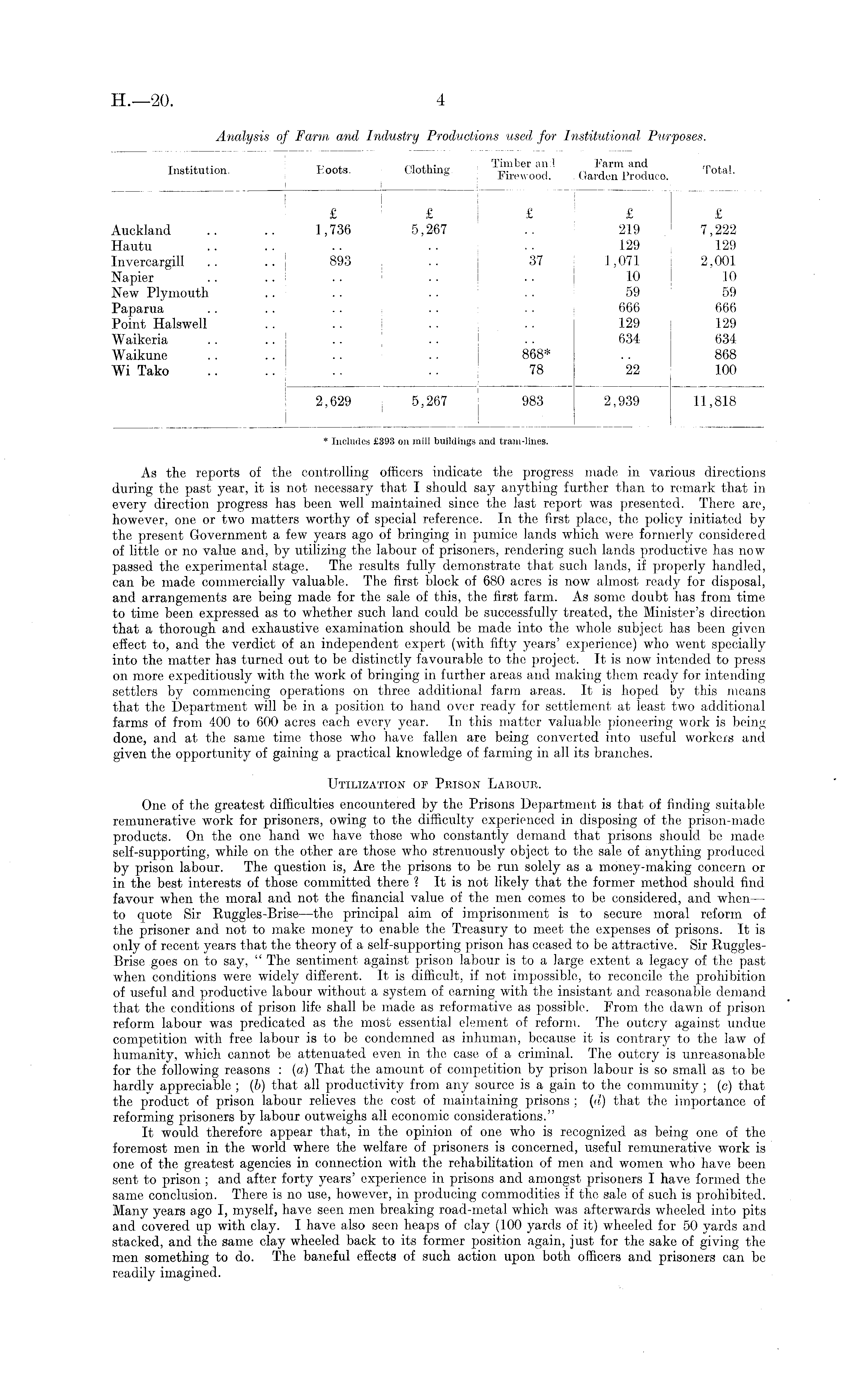 As the reports of the controlling officers indicate the progress made in various directions during the past year, it is not necessary that I should say anything further than to remark that in every direction progress has been well maintained since the last report was presented. There are, however, one or two matters worthy of special reference. In the first place, the policy initiated by the present Government a few years ago of bringing in pumice lands which were formerly considered of little or no value and, by utilizing the labour of prisoners, rendering such lands productive has now passed the experimental stage. The results fully demonstrate that such lands, if properly handled, can be made commercially valuable. The first block of 680 acres is now almost ready for disposal, and arrangements are being made for the sale of this, the first farm. As some doubt has from time to time been expressed as to whether such land could be successfully treated, the Minister's direction that a thorough and exhaustive examination should be made into the whole subject has been given effect to, and the verdict of an independent expert (with fifty years' experience) who went specially into the matter has turned out to be distinctly favourable to the project. It is now intended to press on more expeditiously with the work of bringing in further areas and making them ready for intending settlers by commencing operations on three additional farm areas. It is hoped by this means that the Department will be in a position to hand over ready for settlement at least two additional farms of from 400 to 600 acres each every year. In this matter valuable pioneering work is being done, and at the same time those who have fallen are being converted into useful workers and given the opportunity of gaining a practical knowledge of farming in all its branches. Utilization op Prison Labour. One of the greatest difficulties encountered by the Prisons Department is that of finding suitable remunerative work for prisoners, owing to the difficulty experienced in disposing of the prison-made products. On the one hand we have those who constantly demand that prisons should be made self-supporting, while on the other are those who strenuously object to the sale of anything produced by prison labour. The question is, Are the prisons to be run solely as a money-making concern or in the best interests of those committed there ? It is not likely that the former method should find favour when the moral and not the financial value of the men conies to be considered, and when — to quote Sir Ruggles-Brise —the principal aim of imprisonment is to secure moral reform of the prisoner and not to make money to enable the Treasury to meet the expenses of prisons. It is only of recent years that the theory of a self-supporting prison has ceased to be attractive. Sir RugglesBrise goes on to say, " The sentiment against prison labour is to a large extent a legacy of the past when conditions were widely different. It is difficult, if not impossible, to reconcile the prohibition of useful and productive labour without a system of earning with the insistant and reasonable demand that the conditions of prison life shall be made as reformative as possible. From the dawn of prison reform labour was predicated as the most essential element of reform. The outcry against undue competition with free labour is to be condemned as inhuman, because it is contrary to the law of humanity, which cannot be attenuated even in the case of a criminal. The outcry is unreasonable for the following reasons : (a) That the amount of competition by prison labour is so small as to be hardly appreciable ; (h) that all productivity from any source is a gain to the community ; (c) that the product of prison labour relieves the cost of maintaining prisons ; (a) that the importance of reforming prisoners by labour outweighs all economic considerations." It would therefore appear that, in the opinion of one who is recognized as being one of the foremost men in the world where the welfare of prisoners is concerned, useful remunerative work is one of the greatest agencies in connection with the rehabilitation of men and women who have been sent to prison ; and after forty years' experience in prisons and amongst prisoners I have formed the same conclusion. There is no use, however, in producing commodities if the sale of such is prohibited. Many years ago I, myself, have seen men breaking roacl-metal which was afterwards wheeled into pits and covered up with clay. I have also seen heaps of clay (100 yards of it) wheeled for 50 yards and stacked, and the same clay wheeled back to its former position again, just for the sake of giving the men something to do. The baneful effects of such action upon both officers and prisoners can be readily imagined.