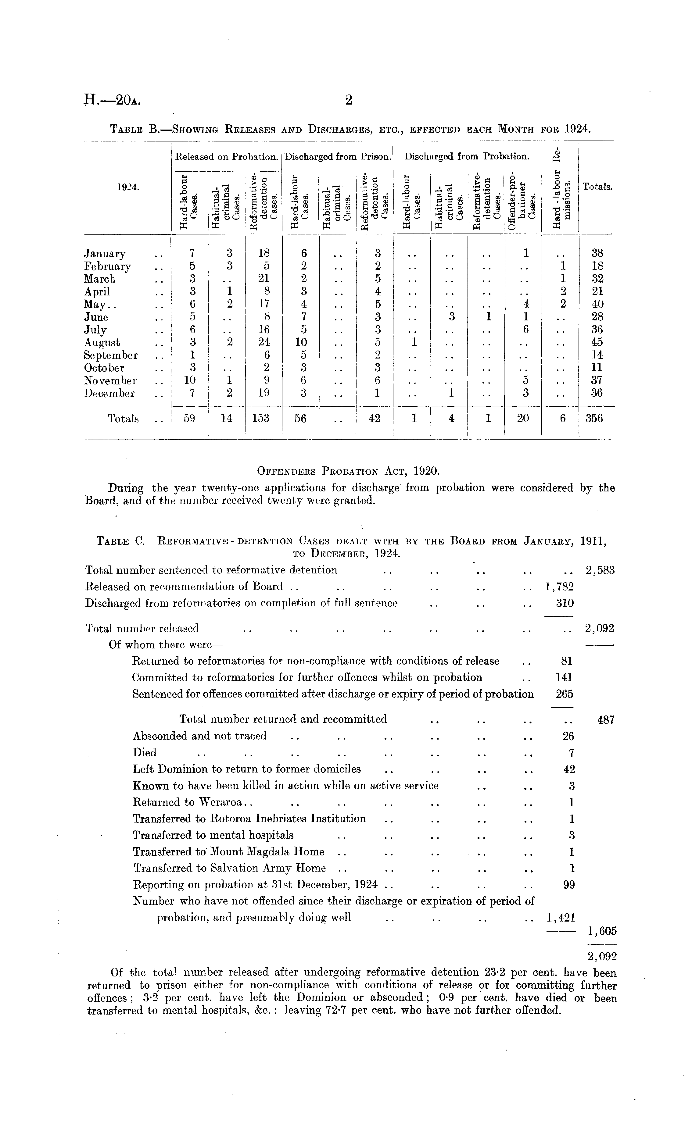 Offenders Probation Act, 1920. During the year twenty-one applications for discharge from probation were considered by the Board, and of the number received twenty were granted. Table C. —Reformative - detention Cases dealt with by the Board from January, 1911, to December, 1924. Total number sentenced to reformative detention .. .. .. .. .. 2,583 Released on recommendation of Board .. .. .. .. .. ..1,782 Discharged from reformatories on completion of full sentence .. .. .. 310 Total number released .. .. .. .. .. .. .. .. 2,092 Of whom there were — Returned to reformatories for non-compliance with conditions of release .. 81 Committed to reformatories for further offences whilst on probation .. 141 Sentenced for offences committed after discharge or expiry of period of probation 265 Total number returned and recommitted .. .. .. .. 487 Absconded and not traced .. .. .. .. .. .. 26 Died .. . . .. .. .. .. .. .. 7 Left Dominion to return to former domiciles .. .. .. .. 42 Known to have been killed in action while on active service .. .. 3 Returned to Weraroa.. .. .. .. .. .. .. 1 Transferred to Rotoroa Inebriates Institution .. .. .. .. 1 Transferred to mental hospitals .. .. .. .. .. 3 Transferred to Mount Magdala Home .. .. .. .. .. 1 Transferred to Salvation Army Home .. .. .. .. .. 1 Reporting on probation at 31st December, 1924 .. .. .. .. 99 Number who have not offended since their discharge or expiration of period of probation, and presumably doing well .. .. .. .. 1,421 1,605 2,092 Of the total number released after undergoing reformative detention 23-2 per cent, have been returned to prison either for non-compliance with conditions of release or for committing further offences ; 3-2 per cent, have left the Dominion or absconded ; 0-9 per cent, have died or been transferred to mental hospitals, &c. : leaving 72-7 per cent, who have not further offended.