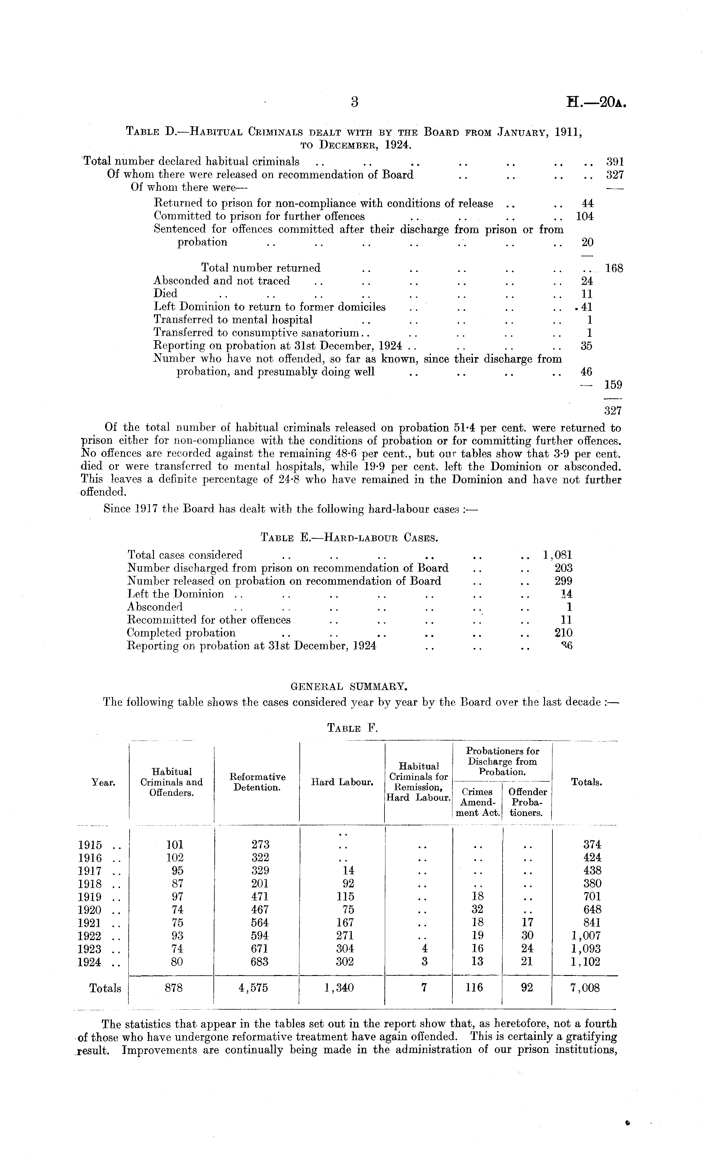 Table D. —Habitual Criminals dealt with by the Board from January, 1911, to December, 1924. Total number declared habitual criminals .. .. .. .. .. .. .. 391 Of whom there were released on recommendation of Board .. .. .. .. 327 Of whom there were — — Returned to prison for non-compliance with conditions of release .. .. 44 Committed to prison for further offences .. .. .. .. 104 Sentenced for offences committed after their discharge from prison or from probation .. .. .. .. .. .. 20 Total number returned .. .. .. .. .. 168 Absconded and not traced .. .. .. .. .. 24 Died .. .. .. .. .. .. .. 11 Left Dominion to return to former domiciles .. .. .. ... 41 Transferred to mental hospital .. .. .. . . .. 1 Transferred to consumptive sanatorium.. . . . . .. .. 1 Reporting on probation at 31st December, 1924 .. .. . . 35 Number who have not offended, so far as known, since their discharge from probation, and presumably doing well .. .. .. 46 — 159 327 Of the total number of habitual criminals released on probation 51-4 per cent, were returned to prison either for non-compliance with the conditions of probation or for committing further offences. No offences are recorded against the remaining 48-6 per cent., but our tables show that 3-9 per cent, died or were transferred to mental hospitals, while 19-9 per cent, left the Dominion or absconded. This leaves a definite percentage of 24-8 who have remained in the Dominion and have not further offended. Since 1917 the Board has dealt with the following hard-labour cases :—■ Table B. —Hard-labour Cases. Total cases considered .. .. .. .. .. .. 1,081 Number discharged from prison on recommendation of Board .. .. 203 Number released on probation on recommendation of Board .. .. 299 Left the Dominion .. .. .. .. .. .. .. M Absconded . . . . .. .. .. .. .. 1 Recommitted for other offences .. .. .. .. .. 11 Completed probation .. . . .. .. .. .. 210 Reporting on probation at 31st December, 1924 .. .. .. GENERAL SUMMARY. The following table shows the oases considered year by year by the Board over the last decade :—