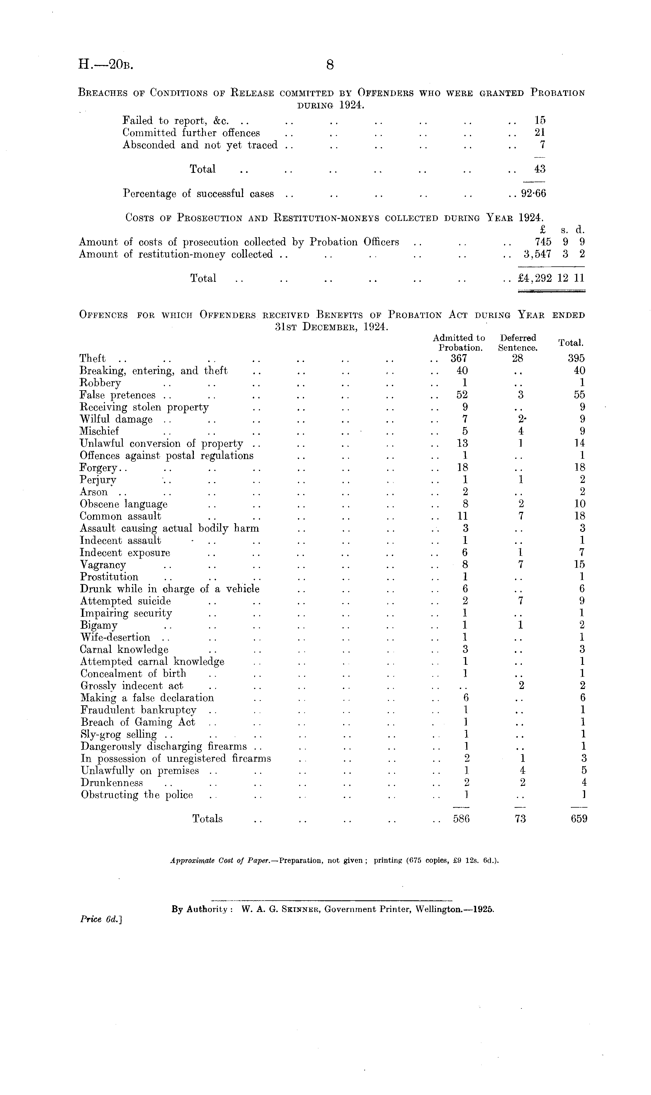 Breaches or Conditions of Release committed by Offenders who were granted Probation during 1924. Failed to report, &c. .. .. .. .. .. .. 15 Committed further offences .. .. .. .. .. 21 Absconded and not yet traced .. .. .. .. .. .. 7 Total .. .. .. .. .. .. 43 Percentage of successful cases .. .. .. .. . . .. 92-66 Costs of Proseoution and Restitution-moneys collected during Year 1924. £ s. d. Amount of costs of prosecution collected by Probation Officers .. . . .. 745 9 9 Amount of restitution-money collected .. . . . . . . .. 3,547 3 2 Total .. .. .. .. .. .. ..£4,292 12 11 Offences for which Offenders received Benefits of Probation Act during Year ended 31st December, 1924. Admitted to Deferred T, . Probation. Sentence. °a ' Theft .. .. .. .. .. .. .. .. 367 28 395 Breaking, entering, and theft .. .. .. . . 40 .. 40 Robbery .. .. .. .. .. .. .. 1 .. 1 False pretences .. . . .. .. . . .. 52 3 55 Receiving stolen property .. .. . . .. 9 .. 9 Wilful damage .. .. .. .. .. .. 7 2- 9 Mischief .. .. .. .. .. .. ..5 4 9 Unlawful conversion of property .. .. .. .. 13 i 14 Offences against postal regulations . . . . .. 1 .. 1 Forgery.. .. .. .. .. .. .. ..18 .. 18 Perjury .. .. . . . . . . . 1 1 2 Arson .. . . . . . . .. . . . . 2 .. 2 Obscene language . . .. . . . . . . 8 2 10 Common assault .. .. .. .. . . 11 7 18 Assault causing actual bodily harm .. . . . . 3 . . 3 Indecent assault - .. . . . . . . . . 1 .. 1 Indecent exposure .. .. .. .. .. ..6 1 7 Vagrancy .. .. . . .. .. .. 8 7 15 Prostitution .. .. .. . . .. .. . . 1 .. 1 Drunk while in charge of a vehicle .. .. . . 6 .. 6 Attempted suicide .. .. .. .. .. ..2 7 9 Impairing security .. . . .. . . .. . . 1 .. I Bigamy .. .. .. .. .. .. ..1 1 2 Wife-desertion .. . . . . . . . . .. 1 .. 1 Carnal knowledge .. . . . . . . 3 .. 3 Attempted carnal knowledge . . . . . . . 1 .. 1 Concealment of birth . . . . . . .. . . 1 .. 1 Grossly indecent act .. .. . . . . . . .... 2 2 Making a false declaration . . . . . . . . 6 .. 6 Fraudulent bankruptcy .. . . .. . . .. . . 1 .. 1 Breach of Gaming Act . . . . . . . . . . . 1 .. 1 Sly-grog selling . . .... . . .. .. . . 1 .. 1 Dangerously discharging firearms .. . . . . .. 1 .. 1 In possession of unregistered firearms . . . . . . 2 1 3 Unlawfully on premises . . .. .. .. .. 1 4 5 Drunkenness .. .. .. .. .. .. ..2 2 4 Obstructing the police . . .. . .. . . 1 . . 1 Totals .. .. .. .. .. 586 73 659