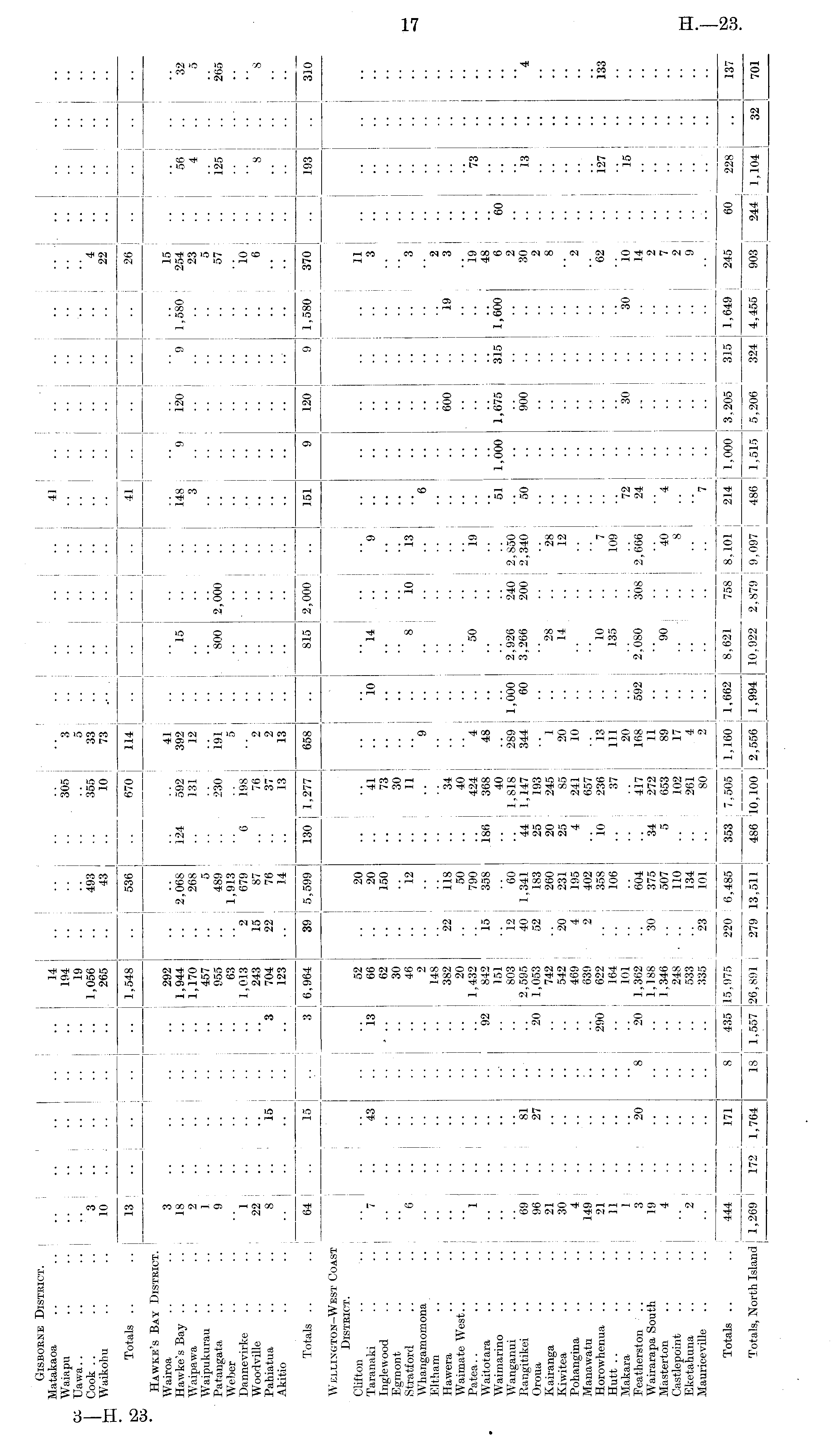 Gisbokne District. j [ j ! [ | Matakaoa .. .. .. .. .. .. .. 14 .. .. .. .. .. .. .. .. .. 41 .. .. .. .. ...... Waiapu .. .. .. .. .. .. .. 194 .. .. .. 305 3 .. .. .... Uawa.. .. .. .. .. .. .. .. 19 .. .. .. .. 5 .. .. Cook .. .. .. 3 .. .. .. .. 1,056 .. 493 j .. 355 33 .. .. .. .. .. .. .. .. .. | 4 Waikohu .. .. 10 .... .. .. 265 .. 43 .. 10 73 ... ...... .. .. .. .. .. ! 22 ; ; I Totals .. : 13; .. I .. .. .. 1,548 .. 536 .. 670 114 .. j .. j .. 41 .. .. .. .. j 26 Hawkb's Bay District. Wairoa .. .. 3 .. .. .. .. 292 .. .. . . . . 41 .. .. .. .. .. .. . . •. .. 15 Hawke'sBay .. .. 18 1,944 .. 2,068 124 592 392 I 15 .. .. 148 9 120 9 1,580 254 .. 56 .. 32 Waipawa .. .. 2 .. .. .. .. 1,170 .. 268 .. 131 12 .. .. .. 3 .. .. .. .. 23 .. 4 .. 5 Waipukurau .. .. 1 .. .. .. .. 457 .. 5 .. .. .... .. .. .. .. .. .. .. .. 5 Patangata .. .. 9 .. .. .. .. j 955 .. 489 j 230 191 j ... 800 .2,000 .. .. .. .. .. .. 57 j 125 .. 265 Weber .. .. .. .. .. .. | 63 .. 1,913 \ .. 5 .. .. •• •• •• •• •• •• •• .. .. ... Dannevirke .. .. 1 .. .. .. .. 1,013 2 679 6 198 .. .. .. ' .. j .. .. .. .. .. .. 10 I Woodville .. .. 22 .. .. j .. .. 243 15 87 .. ; 76 2 .. .. 6 .. 8 .. 8 Pahiatua .. .. 8 .. 15 .. 3 704 22 76 .. 37 2 Akitio .. .. .. | 123 .. | 14 .. 13 13 .. .. Totals .. .. 64 I 15 .. 3 ! 6,964 39 ; 5,599 130 1,277 658 .. 815 2,000 .. 151 9 120 9 1,580 370 .. 193 .. 310 ' ' • 1 I I Wellington-West Coast District. Clifton .. .. j •• I 52 .. 20 .. j 11 Taranaki .. .. | 7 .. 43 ... 13 J 66 .. 20 .. j 41 .. 10 14 9 .. .. .. .. .. 3 | Inglewood .. .. j .. .. .. j 62 .. 150 .. 73 .. .. .. .. .. .. .. .. ■. .. Egmont .. .. .. .. .. .... 30 .. .. .. 30 Stratford .. .. 6 j .. 46 .. 12 .. 11 .. .. 8 10 13 3 Wha-ngamomona .. .. .. .. .. .. 2 .. .. .. .. 9 .. .. .. .. 6 Eltham .. 148 2 Hawera .. .. .. .. j 382 22 ] 118 .. 34 .. .. .. .. .. .. .. 600 .. 19 3 Waimate West.. .. ' .. .. .. i 20 i 50 • • 40 .. .. .. .... Patea.. .. .. ) 1 .. 1,432 .. 790 124 4 .. 50 .. 19 j 19 .. 73 Waitotara .. .. .. .. .. .. 92 842 15 358 186 368 48 .. .. .. . . .. .. .. .. .. 48 Waimarino .. .. .. .. .. •• .. 151 .. .. j 40 .. •• •• .. .. 51 1,000 1,675 315 1,600 6 60 Wanganui .. 803 12 60 .. 1,818 289 1,000 2,926 240 I 2,850 2 Rangitikei .. .. 69 .. 81 .. .. 2,595 40 1,341 44 1,147 344 60 3,266 200:2,340 50 .. 900 .. .. 30 .. 13 .. 4 Oroua .. .. 96 .. 27 .. 20 1,053 52 183 25 193 .. .. .. .. i .. .. .. .. .. 2 Kairanga .. .. 21 742 .. 260 20 245 1 .. 28 .. ! 28 8 Kiwitea .. .. 30 542 20 231 25 85 20 .. 14 .. ! 12 Pohangina .. .. 4 .. .. .. .. 469 4 195 4 241 10 .. .. .. .. .. .. .. .. .. 2 Manawatu .. .. 149 .. .. . .. 639 2 402 .. 657 .. .. .. I Horowhenua .. .. 21 .. .. .. 290 622 .. 358 10 236 13 .. 10 .. ! 7 .. .. .. .. .. 62 .. 127 .. 133 Hutt.. .. .. 11 .. .. .. .. 164 .. 106 .. 37 111 .. 135 109 .. .. .. .. j .. j .. Makara .. .. 1 .. .. .. .. 101 .. .. .. .. 20 .. .. .. .. 72 .. 30 .. 30 10 .. 15 Featherston .. .. j 3| ... 20 8 20 1,362 .. 604 .. 417 168 592 2,080 308 j 2,666 24 .. ... 1 .. I .. : 14 Wairarapa South .. 19 .. .. .. • ■ 1, 188 30 375 34 272 11 .. •• .. .. .. .. .. .. .. 2 Masterton .. .. j 4 .. .. .. .. 1,346 1 • • 507 5 1 653 89 .. 90 .. 40 4 .. j .. 7 I Castlepoint .. .. .. .. .. .. .. 248 ... 110 .. 102 17 .. .. .. 8 .. .. j .. : 2 Eketahana .. .. 2 .. .. .. .. 533 ..134 .. 261 4 .. .. .. .. .. .. .. .. .. 9 ! Mauriceville .. .. .. .. .. .. .. 335 23 101 .. 80 2 .. .. .. .. 7 .. .. .. ...... Totals .. .. 444 .. 171 8 435 15,975 220 6,485 3-53 7,505 ; 1,160 1,662 8,621 758 8,101 214 1,000 3,205 315 1,649 . 245 60 228 .. 137 Totals, North Island 1 1,269 172 1,764 18 : 1,557 26,891 279 13,511 486 10,100 | 2,556 1,994 10,922 2,879 9,097 486 1,515 5,206 324 4,455 903 244 1,104 32 701