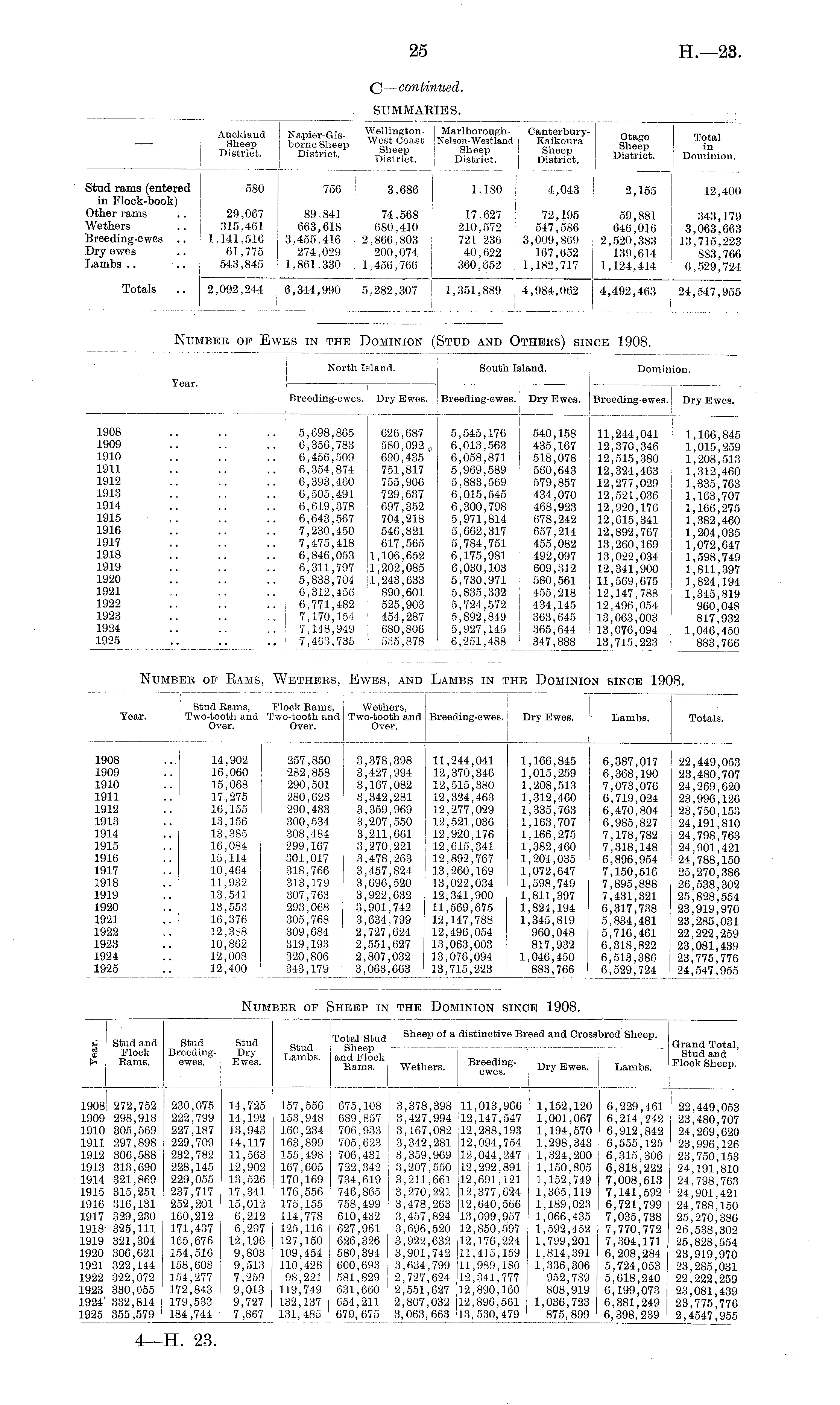 North Island. South Island. Dominion. Year. —< j : Breeding-ewes. Dry Ewes. Breeding-ewes. Dry Ewes. Breeding-ewes.! Dry Ewes. 1908 .. .. .. 5,698,865 626,687 5,545,176 540,158 11,244,041 1,166,845 1909 .. .. .. 6,356,783 580,092, 6,013,563 435,167 12,370,346 1,015,259 1910 .. .. .. 6,456,509 690,435 6,058,871 518,078 12,515,380 1,208,513 1911 .. .. .. 6,354,874 751,817 5,969,589 560,643 12,324,463 1,312,460 1912 .. .. .. 6,393,460 755,906 5,883,569 579,857 12,277,029 1,335,763 1913 .. .. 6,505,491 729,637 6,015,545 434,070 12,521,036 1,163 707 1914 .. .. .. 6,619,378 697,352 6,300,798 468,923 12,920,176 1,166,275 1915 .. .. .. 6,643,567 704,218 5,971,814 678,242 12,615,341 1,382,460 1916 .. .. .. 7,230,450 546,821 5,662,317 657,214 12,892,767 1,204,035 1917 .. .. .. 7,475,418 617,565 5,784,751 455,082 13,260,169 1,072,647 1918 .. .. .. 6,846,053 1,106,652 6,175,981 492,097 13,022,034 1,598,749 1919 .. .. .. 6,311,797 1,202,085 6,030,103 609,312 12,341,900 1,811,397 1920 .. .. .. 5,838,704 1,243,633 5,730,971 580,561 11,569,675 1,824,194 1921 .. .. .. 6,312,456 890,601 5,835,332 455,218 12,147,788 1,345,819 1922 .. .. .. 6,771,482 525,903 5,724,572 434,145 12,496,054 960,048 1923 .. .. .. 7,170,154 454,287 5,892,849 363.645 13,063,003 817,932 1924 .. .. .. 7,148,949 680,806 5,927,145 365,644 13,076,094 1,046,450 1925 .. .. .. 7,463,735 535,878 6,251,488 347,888 13,715,223 883,766