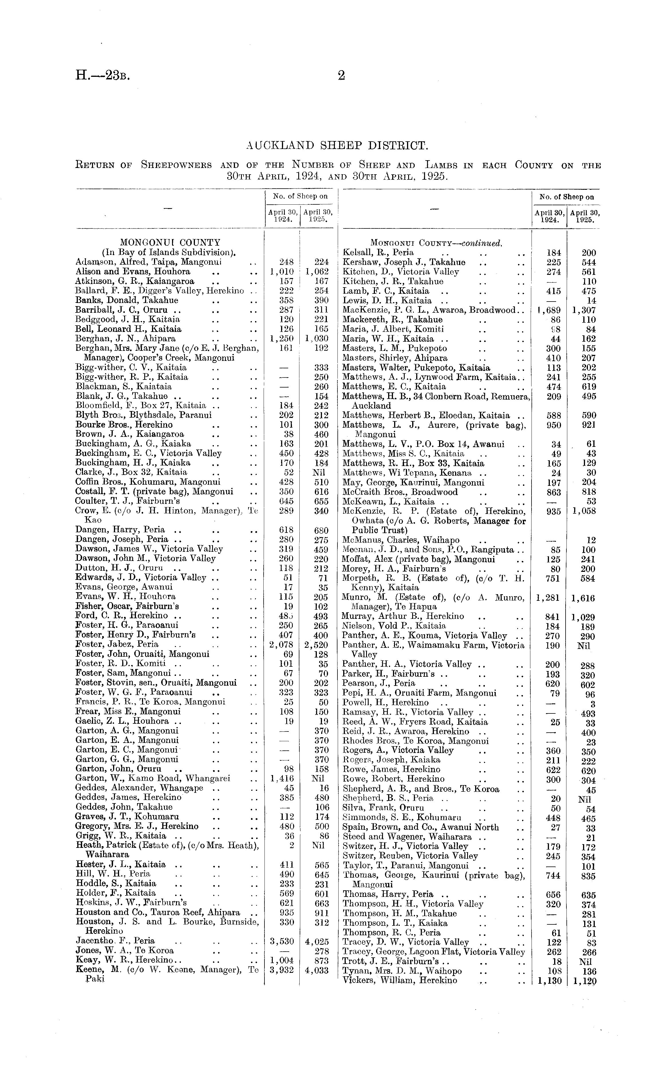 No. of Sheep on April 30, April BO, 1924. 1925. MONGONU1 COUNTY (In Bay of Islands Subdivision). Adamson, Alfred, Taipa, Mangonui .. 248 224 Alison and Evans, Honhora .. .. 1,010 1,062 Atkinson, 6. R., Kaiangaroa .. .. 157 167 Ballard, F. E., Digger's Valley, Herekino .. 222 254 Banks, Donald, Takahue .. .. 358 390 Barriball, J. C., Oruru .. .. .. 287 311 Bedggood, J. H., Kaitaia .. .. 120 221 Bell, Leonard H., Kaitaia ,. .. 126 165 Berghan, J. N., Ahipara .. .. 1,250 1,030 Berghan, Mrs. Mary Jane (c/o E. J. Berghan, 161 102 Manager), Cooper's Creek, Mangonui Bigg-wither, C. V., Kaitaia .. .. — 333 Bigg-wither, R. P., Kaitaia .. .. — 250 Blaekman, S., Kaiataia .. .. — 260 Blank, J. G., Takahue .. .. .. — 154 Bloomfiekl, F., Box 27, Kaitaia .. . . 184 242 Blyth Bros., Blythsdale, Paranui .. 202 212 Bourke Bros., Herekino .. .. 101 300 Brown, J. A., Kaiangaroa .. .. 38 460 Buckingham, A. G., Kaiaka .. .. 163 201 Buckingham, E. C., Victoria Valley .. 450 428 Buckingham, H. J., Kaiaka .. .. 170 184 Clarke, J., Box 32, Kaitaia .. .. 52 Nil Coffin Bros., Kohumaru, Mangonui .. 428 510 Costall, F. T. (private bag), Mangonui .. 350 616 Coulter, T. J., Fairburn's .. .. 645 655 Crow, E. (c/o J. H. Hinton, Manager), Te 289 340 Kao Dangen, Harry, Peria .. .. .. 618 680 Dangen, Joseph, Peria .. .. .. 280 275 Dawson, James W., Victoria Valley .. 319 459 Dawson, John M., Victoria Valley .. 260 220 Dutton, H. J., Oruru .. .. .. 118 212 Edwards, J. D., Victoria Valley .. .. 51 71 Evans, George, Awanui . . . . 17 35 Evans, W. H., Houhora .. . . 115 205 Fisher, Oscar, Fairburn's .. .. 19 102 Ford, C. R., Herekino .. .. .. 48j 493 Foster, H. G-., Paraoanui .. .. 250 265 Foster, Henry D., Fairburn'c .. .. 407 400 Foster, Jabez, Peria .. .. .. 2,078 2,520 Foster, John, Oruaiti, Mangonui .. 69 128 Foster, R. D., Komiti .. .. . . 101 35 Foster, Sam, Mangonui .. .. .. 67 70 Foster, Stovin, sen., Oruaiti, Mangonui .. 200 202 Foster, W. G. F., Paraoanui .. . . 323 323 Francis, P. R., Te Koroa, Mangonui . . 25 50 Frear, Miss E., Mangonui .. .. 108 150 Gaelic, Z. L., Houhora .. .. .. 19 19 Garton, A. G., Mangonui .. .. — 370 Garton, E. A., Mangonui .. .. — 370 Garton, E. C., Mangonui .. .. — 370 Garton, G. G., Mangonui .. .. — 370 Garton, John, Oruru .. .. .. 98 158 Garton, W., Kamo Road, Whangarei .. 1,416 Nil Geddes, Alexander, Whangape .. .. 45 16 Geddes, James, Herekino .. .. 385 480 Geddes, John, Takahue .. .. — 106 Graves, J. T., Kohumaru .. .. 112 174 Gregory, Mrs. E. J., Herekino .. .. 480 500 Grigg, W. R., Kaitaia .. .. .. 36 86 Heath, Patrick (Estate of), (c/o Mrs. Heath), 2 Nil Waiharara Hester, J. L., Kaitaia .. .. .. 411 565 Hill, W. H., Peria .. .. . . 490 645 Hoddle, S., Kaitaia .. .. .. 233 231 Holder, F., Kaitaia .. .. .. 569 601 Hoskins, J. W., Fairburn's . . . . 621 663 Houston and Co., Tauroa Reef, Ahipara .. 935 911 Houston, J. S. and L. Bourke, Burnside, 330 312 Herekino Jacentho-F., Peria .. .. .. 3,530 4,025 Jones, W. A., Te Koroa .. .. — 278 Keay, W. R., Herekino.. .. 1,004 873 Keene, M, (c/o W. Keane, Manager), Te 3,932 4,033 Paki