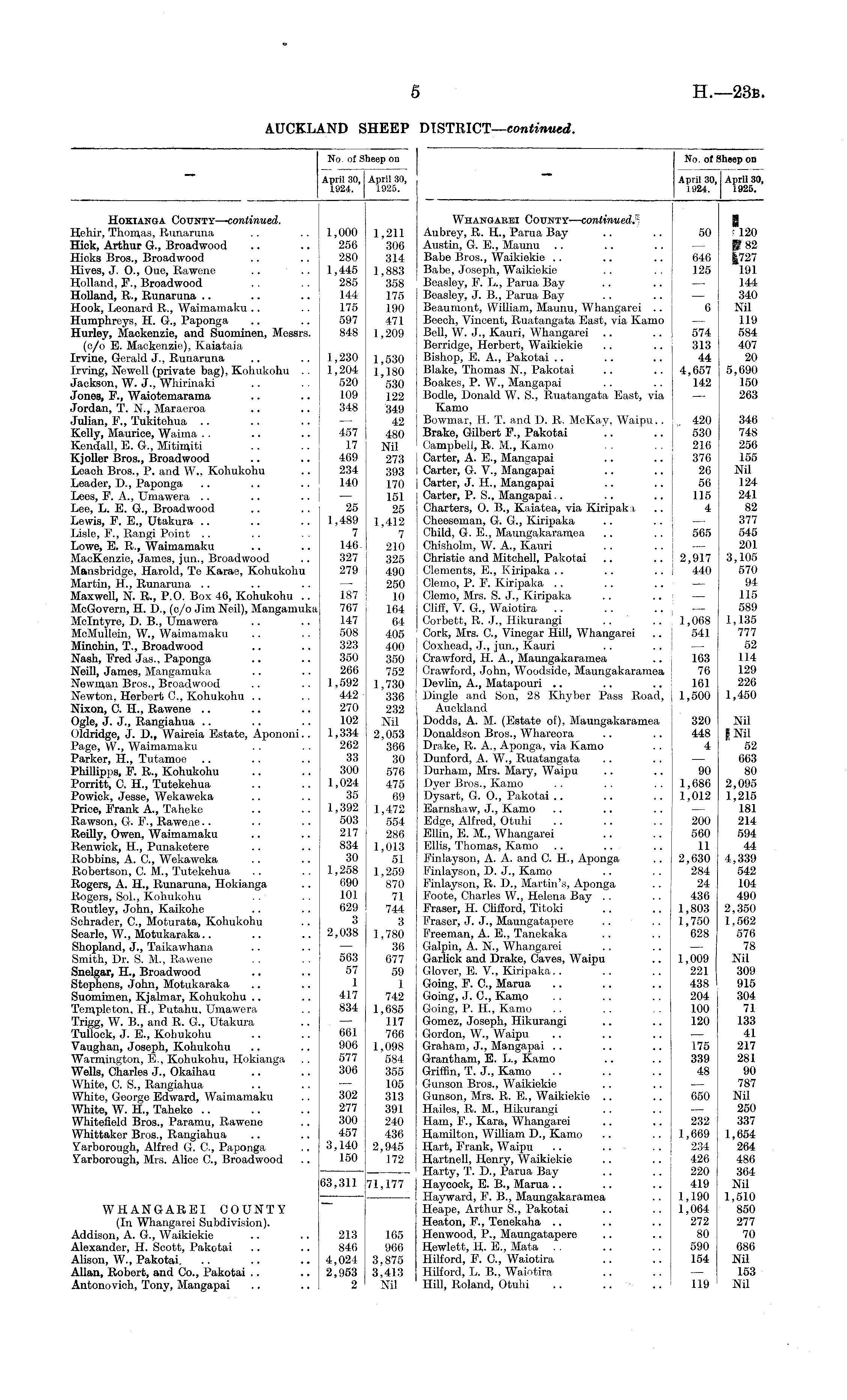 No. of Sheep on April 30, April 30, 1924. 1925. Hokianga County—continued. Hehir, Thomas, Runaruna .. .. 1,000 1,211 Hick, Arthur G., Broadwood .. .. 256 306 Hicks Bros., Broadwood .. .. 280 314 Hives, J. O., Oue, Rawene .. .. 1,445 1,883 Holland, F., Broadwood . . .. 285 358 Holland, R., Runaruna .. .. .. 144 175 Hook, Leonard R., Waimamaku .. .. 175 190 Humphreys, H. 6., Paponga .. .. 597 471 Hurley, Mackenzie, and Suominen, Messrs. 848 1,209 (c/o E. Mackenzie), Kaiataia Irvine, Gerald J., Runaruna .. .. 1,230 1,530 Irving, Newell (private bag), Kohukohu 1,204 1,180 Jackson, W. J., Whirinaki .. . . 520 530 Jones, F., Waiotemarama .. .. 109 122 Jordan, T. N., Maraeroa .. .. 348 349 Julian, F., Tukitehua .. .. .. — 42 Kelly, Maurice, Waima .. .. .. 457 480 Kendall, E. G., Mitimiti • • ■ • 17 Nil Kjoller Bros., Broadwood .. .. 469 273 Leach Bros., P. and W.. Kohukohu .. 234 393 Leader, D., Paponga .. .. .. 140 170 Lees, F. A., Umawera .. .. .. — 151 Lee, L. E. G., Broadwood .. . . 25 25 Lewis, F. E., Utakura .. .. .. 1,489 1,412 Lisle, F., Rangi Point .. .. . . 7 7 Lowe, E. R., Waimamaku .. .. 146 210 MacKenzie, James, jun., Broadwood .. 327 325 Mansbridge, Harold, Te Karae, Kohukohu 279 490 Martin, H., Runaruna .. .. .. — 250 Maxwell, N. R., P.O. Box 46, Kohukohu .. 187 10 McGovern, H. £>., (c/o Jim Neil), Mangamuka 767 164 Mclntyre, D. B., Umawera .. .. 147 64 McMullein, W., Waimamaku .. . . 508 405 Minohin, T., Broadwood .. .. 323 400 Nash, Fred Jas., Paponga .. .. 350 350 Neill, James, Mangamuka .. .. 266 752 Newman Bros., Broadwood .. .. 1,592 1,730 Newton, Herbert C., Kohukohu .. .. 442 336 Nixon, C. H., Rawene .. .. .. 270 232 Ogle, J. J., Rangiahua .. .. .. 102 Nil Oldridge, J. D., Waireia Estate, Apononi.. 1,334 2,053 Page, W., Waimamaku .. . . 262 366 Parker, H., Tutamoe .. .. .. 33 30 Phillipps, F. R., Kohukohu .. .. 300 576 Porritt, C. H., Tutekehua .. .. 1,024 475 Powick, Jesse, Wekaweka .. .. 35 69 Price, Frank A,, Taheke .. .. 1,392 1,472 Rawson, G. F., Rawene.. .. .. 503 554 Reilly, Owen, Waimamaku .. .. 217 286 Renwick, H., Punaketere .. .. 834 1,013 Robbins, A. C., Wekaweka .. .. 30 51 Robertson, C. M., Tutekehua .. .. 1,258 1,259 Rogers, A. H., Runaruna, Hokianga .. 690 870 Rogers, Sol., Kohukohu 101 71 Routley, John, Kaikohe .. .. 629 744 Schrader, C., Moturata, Kohukohu .. 3 3 Searle, W., Motukaraka.. .. .. 2,038 1,780 Shopland, J., Taikawhana .. .. — 36 Smith, Dr. S. M„ Rawene . . . . 563 677 Snelgar, H., Broadwood .. .. 57 59 Stephens, John, Motukaraka .. .. 1 1 Suomimen, Kjalmar, Kohukohu .. .. 417 742 Templeton, H., Putahu, Umawera .. 834 1,685 Trigg, W. B„ and R. G., Utakura .. — 117 Tullock, J. E., Kohukohu .. .. 661 766 Vaughan, Joseph, Kohukohu .. .. 906 1,098 Warmington, E., Kohukohu, Hokianga .. 577 584 Wells, Charles J., Okaihau .. .. 306 355 White, C. S., Rangiahua .. .. — 105 White, George Edward, Waimamaku .. 302 313 White, W. H., Taheke .. .. .. 277 391 Whitefield Bros., Paramu, Rawene .. 300 240 Whittaker Bros., Rangiahua .. .. 457 436 Yarborough, Alfred G. C., Paponga .. 3,140 2,945 Yarborough, Mrs. Alice C., Broadwood .. 150 172 63,311 71,177 W HAN GAREI COUNTY (In Whangarei Subdivision). Addison, A. G., Waikiekie .. .. 213 165 Alexander, H. Scott, Pakotai .. .. 846 966 Alison, W., Pakotai .. .. .. 4,024 3,875 Allan, Robert, and Co., Pakotai .. .. 2,953 3,413 Antonovich, Tony, Mangapai .. .. 2 Nil