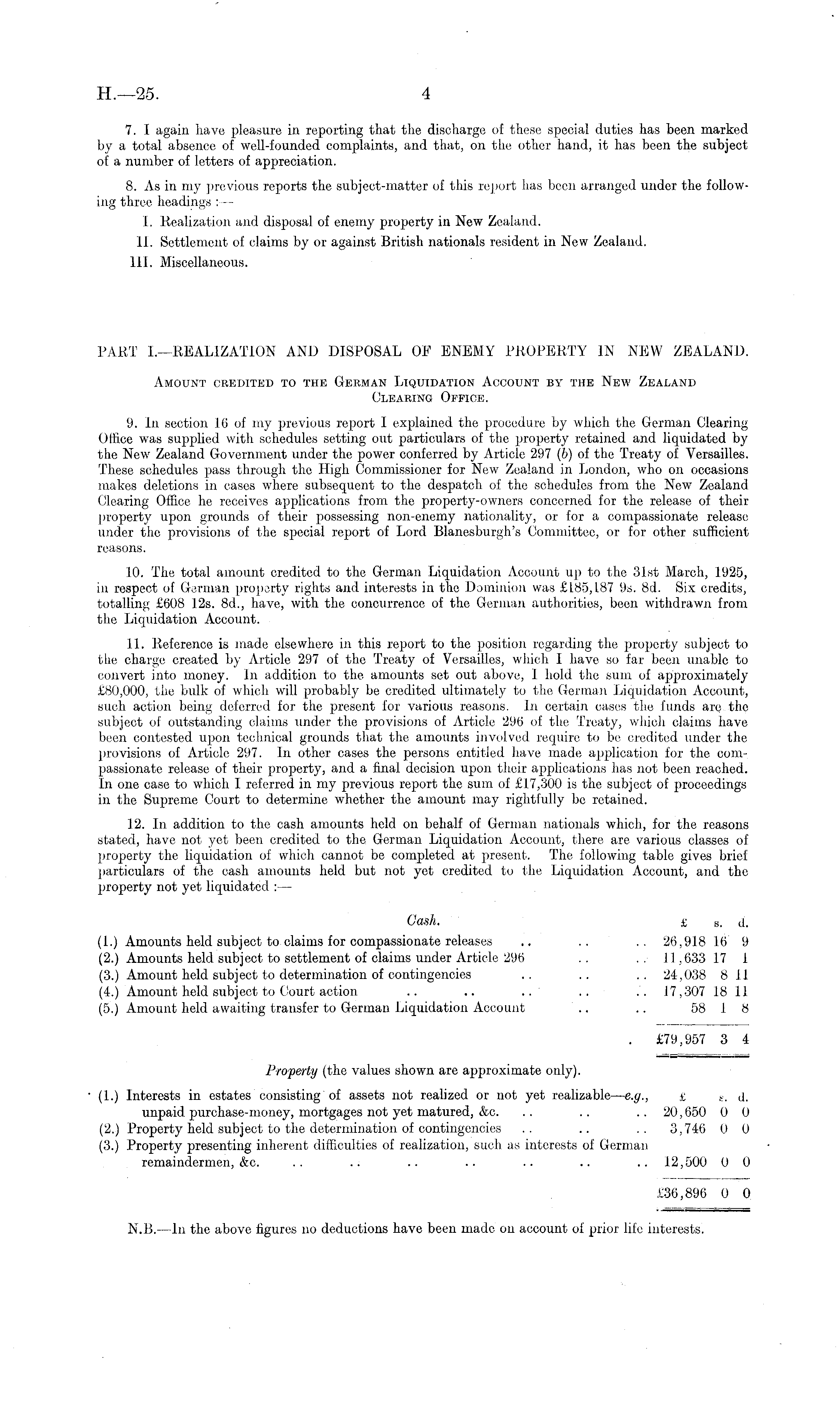 7. I again have pleasure in reporting that the discharge of these special duties has been marked by a total absence of well-founded complaints, and that, on the other hand, it has been the subject of a number of letters of appreciation. 8. As in my previous reports the subject-matter of this report has been arranged under the following three headings : — I. Realization and disposal of enemy property in New Zealand. 11. Settlement of claims by or against British nationals resident in New Zealand. 111. Miscellaneous. PART I.—REALIZATION AND DISPOSAL OF ENEMY PROPERTY IN NEW ZEALAND. Amount credited to the German Liquidation Account by the New Zealand Clearing Office. 9. In section 16 of my previous report I explained the procedure by which the German Clearing Office was supplied with schedules setting out particulars of the property retained and liquidated by the New Zealand Government under the power conferred by Article 297 (b) of the Treaty of Versailles. These schedules pass through the High Commissioner for New Zealand in London, who on occasions makes deletions in cases where subsequent to the despatch of the schedules from the New Zealand Clearing Office he receives applications from the property-owners concerned for the release of their property upon grounds of their possessing non-enemy nationality, or for a compassionate release under the provisions of the special report of Lord Blanesburgh's Committee, or for other sufficient reasons. 10. The total amount credited to the German Liquidation Account up to the 31st March, 1925, in respect of German property rights and interests in the Dominion was £185,187 9s. Bd. Six credits, totalling £608 12s. Bd., have, with the concurrence of the German authorities, been withdrawn from the Liquidation Account. 11. Reference is made elsewhere in this report to the position regarding the property subject to the charge created by Article 297 of the Treaty of Versailles, which 1 have so far been unable to convert into money. In addition to the amounts set out above, I hold the sum of approximately £80,000, the bulk of which will probably be credited ultimately to the German Liquidation Account, such action being deferred for the present for various reasons. In certain cases the funds are the subject of outstanding claims under the provisions of Article 296 of the Treaty, which claims have been contested upon technical grounds that the amounts involved require to be credited under the provisions of Article 297. In other cases the persons entitled have made application for the compassionate release of their property, and a final decision upon their applications has not been reached. In one case to which I referred in my previous report the sum of £17,300 is the subject of proceedings in the Supreme Court to determine whether the amount may rightfully bo retained. 12. In addition to the cash amounts held on behalf of German nationals which, for the reasons stated, have not yet been credited to the German Liquidation Account, there are various classes of property the liquidation of which cannot be completed at present. The following table gives brief particulars of the cash amounts held but not yet credited to the Liquidation Account, and the property not yet liquidated : — Gash. £ s. d. (1.) Amounts held subject to claims for compassionate releases .. .. .. 26,918 16 9 (2.) Amounts held subject to settlement of claims under Article 296 . . . . 11,633 17 1 (3.) Amount held subject to determination of contingencies .. .. .. 24,038 8 11 (4.) Amount held subject to Court action .. .. .. .. .. 17,307 18 11 (5.) Amount held awaiting transfer to German Liquidation Account .. .. 58 1 8 . £79,957 3 4 Property (the values shown are approximate only). (1.) Interests in estates consisting of assets not realized or not yet realizable—e.g., £ s . d. unpaid purchase-money, mortgages not yet matured, &c. .. .. .. 20,650 0 0 (2.) Property held subject to the determination of contingencies .. .. .. 3,746 0 0 (3.) Property presenting inherent difficulties of realization, such as interests of German remaindermen, &c. .. .. .. .. .. .. . . 12,500 0 0 £36,896 0 0 N.B. —In the above figures no deductions have been made on account of prior life interests.