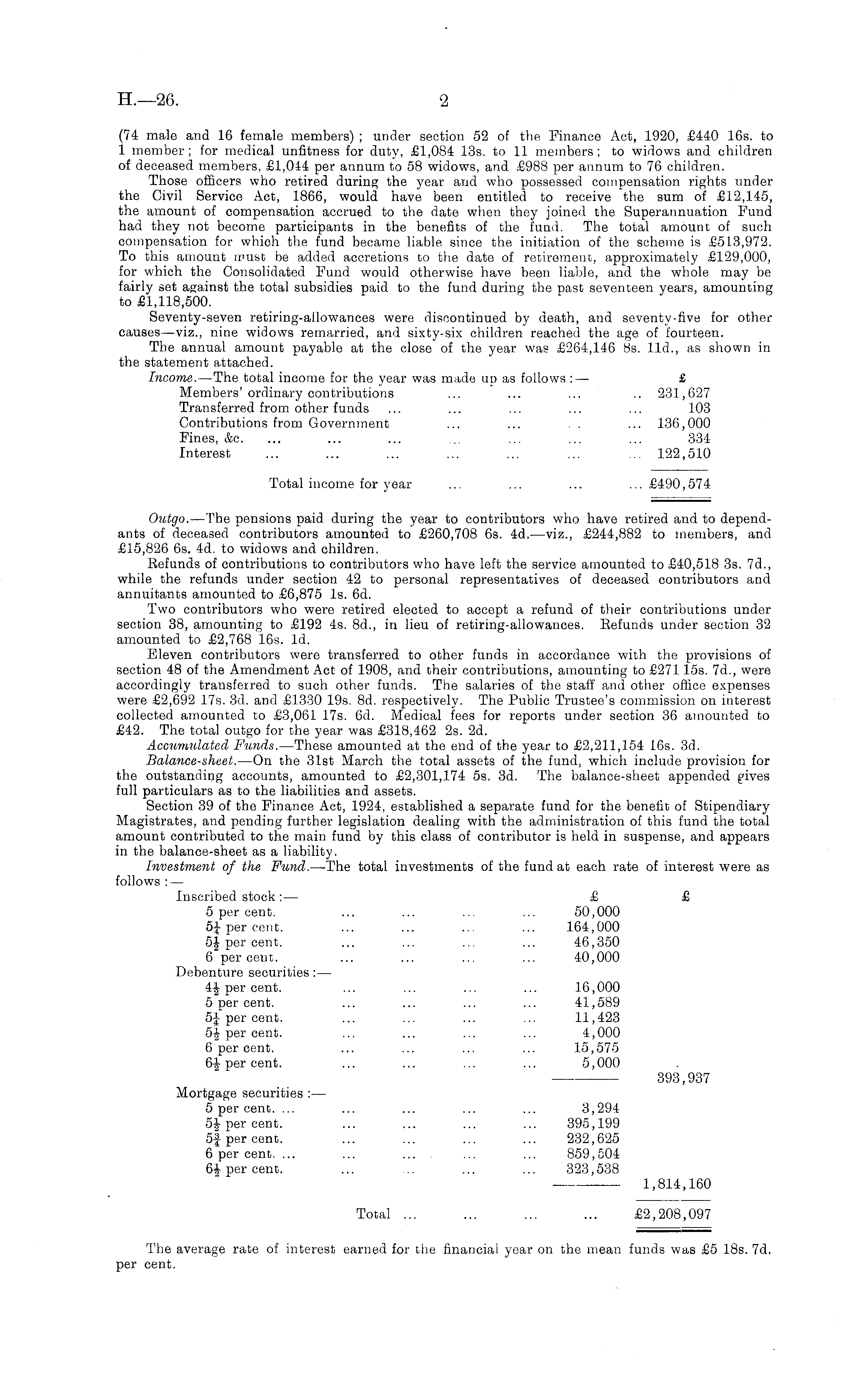 (74 male and 16 female members) ; under section 52 of the Finance Act, 1920, £440 16s. to 1 member; for medical unfitness for duty, £1,084 13s. to 11 members; to widows and children of deceased members, £1,044 per annum to 58 widows, and £988 per annum to 76 children. Those officers who retired during the year and who possessed compensation rights under the Civil Service Aet, 1866, would have been entitled to receive the sum of £12,145, the amount of compensation accrued to the date when they joined the Superannuation Fund had they not become participants in the benefits of the fund. The total amount of such compensation for which the fund became liable since the initiation of the scheme is £513,972. To this amount must be added accretions to the date of retirement, approximately £129,000, for which the Consolidated Fund would otherwise have been liable, and the whole may be fairly set against the total subsidies paid to the fund during the past seventeen years, amounting to £1,118,500. Seventy-seven retiring-allowances were discontinued by death, and seventy-five for other causes—viz., nine widows remarried, and sixty-six children reached the age of fourteen. The annual amount payable at the close of the year was £264,146 Bs. lid., as shown in the statement attached. Income. —The total income for the year was made up as follows : — £ Members'ordinary contributions ... ... ... .. 231,627 Transferred from other funds ... ... ... ... ... 103 Contributions from Government ... ... . . ... 136,000 Fines, &c. ... ... ... ... ... ... ... 334 Interest ... ... ... ... ... ... ... 122,510 Total income for year ... ... ... ...£490,574 Outgo.—The pensions paid during the year to contributors who have retired and to dependants of deceased contributors amounted to £260,708 6s. 4d.—viz., £244,882 to members, and £15,826 6s. 4d. to widows and children. Refunds of contributions to contributors who have left the service amounted to £40,518 3s. 7d., while the refunds under section 42 to personal representatives of deceased contributors and annuitants amounted to £6,875 Is. 6d. Two contributors who were retired elected to accept a refund of their contributions under section 38, amounting to £192 4s. Bd., in lieu of retiring-allowances. Refunds under section 32 amounted to £2,768 16s. Id. Eleven contributors were transferred to other funds in accordance with the provisions of section 48 of the Amendment Act of 1908, and their contributions, amounting to £271155. 7d., were accordingly transferred to such other funds. The salaries of the staff and other office expenses were £2,692 17s. 3d. and £1330 19s. Bd. respectively. The Public Trustee's commission on interest collected amounted to £3,061 17s. 6d. Medical fees for reports under section 36 amounted to £42. The total outgo for the year was £318,462 2s. 2d. Accumulated, Funds.—These amounted at the end of the year to £2,211,154 16s. 3d. Balance-sheet.—On the 31st March the total assets of the fund, which include provision for the outstanding accounts, amounted to £2,301,174 ss. 3d. The balance-sheet appended gives full particulars as to the liabilities and assets. Section 39 of the Finance Act, 1924, established a separate fund for the benefit of Stipendiary Magistrates, and pending further legislation dealing with the administration of this fund the total amount contributed to the main fund by this class of contributor is held in suspense, and appears in the balance-sheet as a liability. Investment of the Fund.—The total investments of the fund at each rate of interest were as follows : — Inscribed stock:— £ £ 5 per cent. ... ... ... ... 50,000 5J per cent. ... ... ... ... 164,000 5| per cent. ... ... ... ... 46,350 6 percent. ... ... ... ... 40,000 Debenture securities:— 4-J-per cent. ... ... ... ... 16,000 5 per cent. ... ... ... ... 41,589 5J per cent. ... ... ... ... 11,423 5f per cent. ... ... ... ... 4,000 6 per cent. ... ... ... ... 15,575 6-J-per cent. ... ... ... ... 5,000 — 393,937 Mortgage securities 5 per cent. ... ... ... ... ... 3,294 per cent. ... ... ... ... 395,199 5f per cent. ... ... ... ... 232,625 6 per cent. ... ... ... - ... ... 859,504 6i per cent. ... .. ... ... 323,538 1,814,160 Total ... ... ... ... £2,208,097 The average rate of interest earned for the financial year on the mean funds was £5 18s. 7d. per cent.