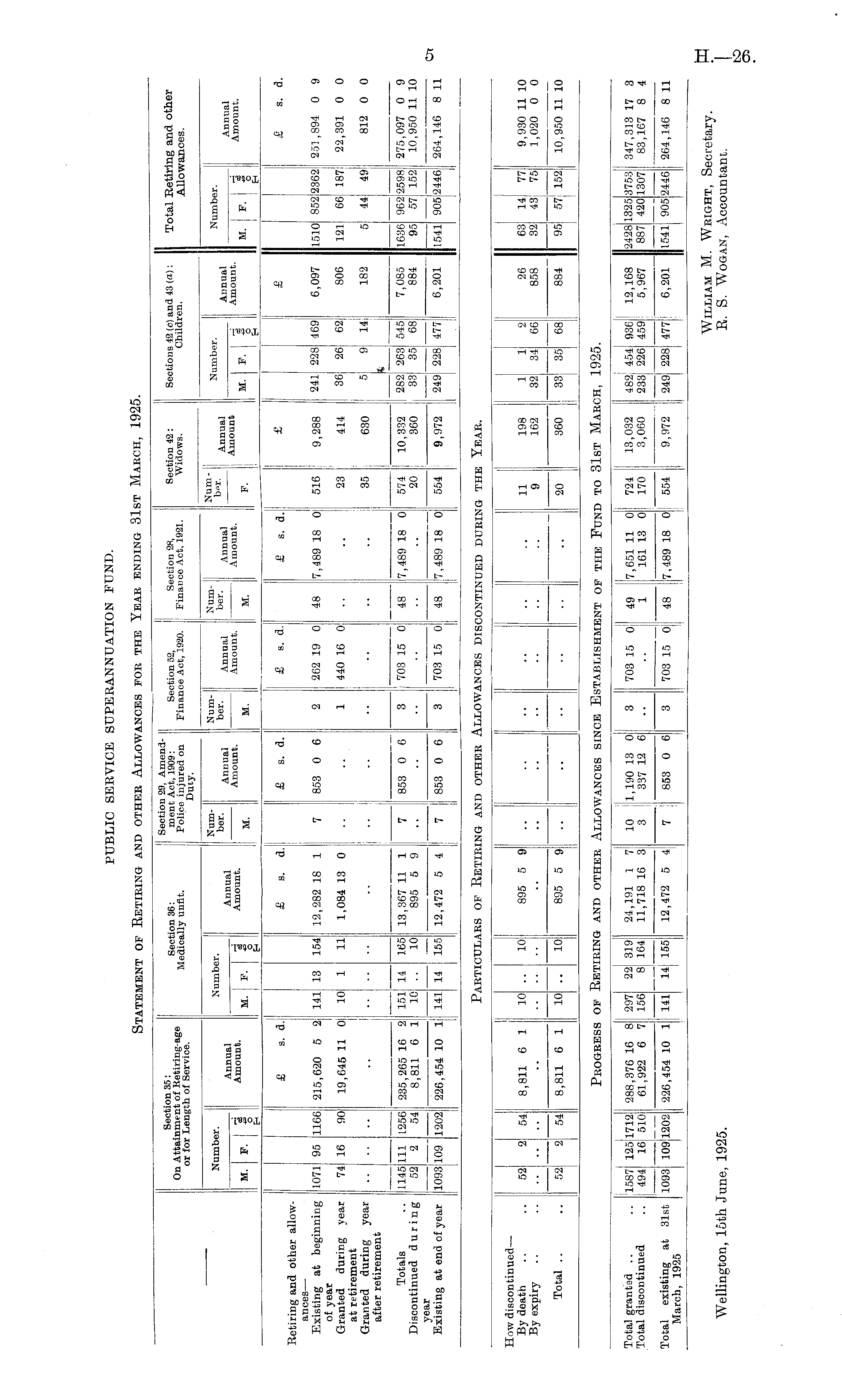 „ ,. Section 29. Amend- ! , _ ,. . , ,, . Section 35. Section 36: ment Act, 1909: \ Section 52, I Section 28, Section 42: Sections 42 (c) and 43 (a): Total Retiring and other On Attainment ol Ketmng-age Medically unfit. Police injured on Finance Act, 1920. Finance Act, 1921. Widows. Children. Allowances. or for -Length ol Service. Duty Number. Number. N b T" | A , Number. Number. Annual Annual Annual ber- Annual * Annual | Annual Annual Annual ■3 Amount. I 13 Amount. Amount. Amount. Amount. Amount 3 Amount. 73 Amount. M. P. -g M. F. -g M. M. M. F. M. F. -g M. F. g p II ! E-i I ' H Ej £ s. d. £ s. d. £ s. d. £ s. d. £ s. d. £ £ £ s. d. Retiring and other allowances — Existing at beginning 1071 95 1166 215,620 5 2 141 13 154 12,282 18 1 7 | 853 0 6 2 262 19 0 48 7,489 18 0 516 9,288 241 228 469 6,097 1510 852 2362 251,894 0 9 of year Granted during year I 74 16 90 19,645 11 0 10 1 11 1,084 13 0 1 440 16 0 .. .. 23 414 | 36 26 62 806 121 66 187 22,391 0 0 at retirement Granted during year .. .. j .. .. .. .. .. 35 630 5 9 14 182 5 44 49 812 0 0 after retirement j g Totals .. 1145111 L256 235,265 16 2 151 14 165 13,367 11 1 7 853 0 6 3 703 15 0 48 7,489 18 0 574 10,332 I 282 263 545 7,085 1636 962 2598 275,097 0 9 Discontinued during 52 2 54 8,811 6 1 10 .. 10 895 5 9.. .. .. .. .. .. 20 360 j 33 35 68 884 95 57 152 10,950 11 10 year — 1 Existing at end of year 1093109 1202 226,454 10 1 141 14 155 12,472 5 4 7 853 0 6 3 703 15 0 48 7,489 18 0 554 9,972 249 228 477 6,201 1541 9052446 264,146 8 11 Particulars of Retiring and other Allowances discontinued during the Year. How discontinued — Bydeath .. .. 52 2 54 8,811 6 1 10 .. 10 895 5 9.. .. .. .. .. .. 11 198 1 1 2 26 63 14 77 9,930 11 10 By expiry .. .. .. .. .. .. .. .. .. 9 162 32 34 66 858 32 43 75 1,020 0 0 Total .. .. 52 2 54 8,811 6 1 10 .. 10 895 5 9.. .. .. .. .. .. 20 360 33 35 68 884 95 57 152 10,950 11 10 Progress of Retiring and other Allowances since Establishment of the Fund to 31st March, 1925. Total granted .. .. 1587 1251712 288,376 16 8 297 22 319 24,191 1 7 10 1,190 13 0 3 703 15 0 49 7,651 11 0 724 13,032 482 454 936 12,168 24281325 3753 347,313 17 3 Total discontinued .. 494 16 510 61,922 6 7 156 8 164 11,718 16 3 3 337 12 6 .. 1 161 13 0 170 3,060 233 226 459 5,967 887 4201307 83,167 8 4 Total existing at 31st 1093 1091202 226,454 10 1 141 14 155 12,472 5 4 7 853 0 6 3 703 15 0 48 7,489 18 0 554 9,972 249 228 477 6,201 1541 905 2446 264,146 8 11 March, 1925 William M. Wright, Secretary. Wellington, loth June, 1925. R. S. Wogan, Accountant.