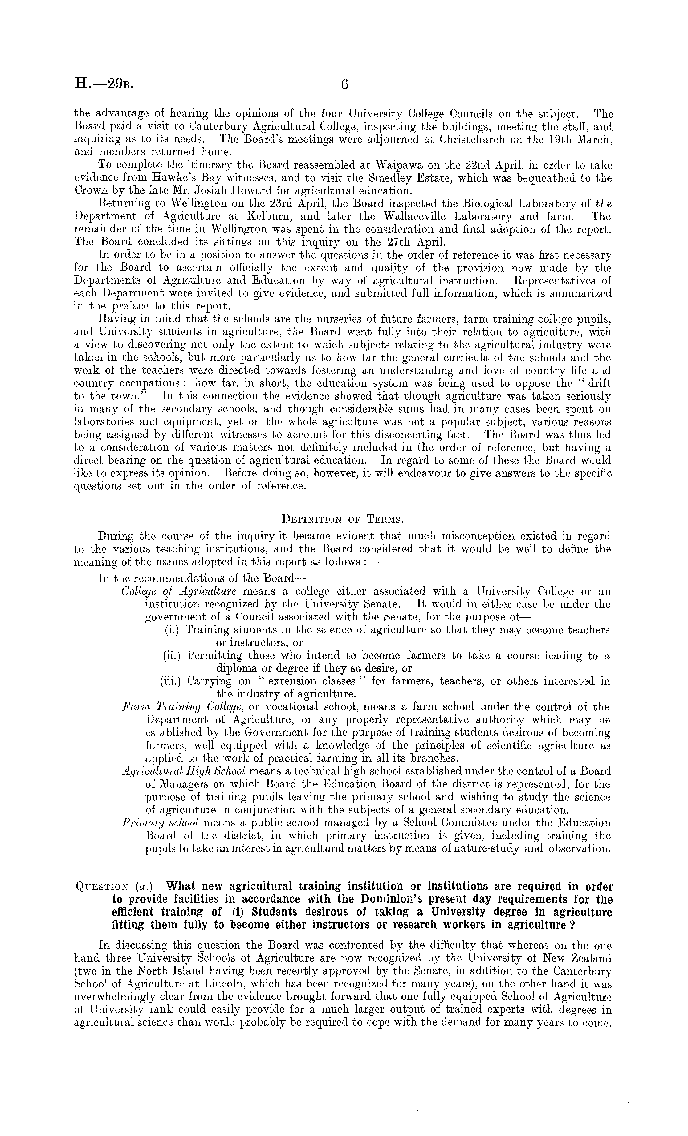 the advantage of hearing the opinions of the four University College Councils on the subject. The Board paid a visit to Canterbury Agricultural College, inspecting the buildings, meeting the staff, and inquiring as to its needs. The Board's meetings were adjourned at Christchurch on the 19th March, and members returned home. To complete the itinerary the Board reassembled at Waipawa on the 22nd April, in order to take evidence from Hawke's Bay witnesses, and to visit the Smedley Estate, which was bequeathed to the Crown by the late Mr. Josiak Howard for agricultural education. Returning to Wellington on the 23rd April, the Board inspected the Biological Laboratory of the Department of Agriculture at Kelburn, and later the Wallaceville Laboratory and farm. The remainder of the time in Wellington was spent in the consideration and final adoption of the report. The Board concluded its sittings on this inquiry on the 27th April. In order to be in a position to answer the questions in the order of reference it was first necessary for the Board to ascertain officially the extent and quality of the provision now made by the Departments of Agriculture and Education by way of agricultural instruction. Representatives of each Department were invited to give evidence, and submitted full information, which is summarized in the preface to this report. Having in mind that the schools are the nurseries of future farmers, farm training-college pupils, and University students in agriculture, the Board went fully into their relation to agriculture, with a view to discovering not only the extent to which subjects relating to the agricultural industry were taken in the schools, but more particularly as to how far the general curricula of the schools and the work of the teachers were directed towards fostering an understanding and love of country life and country occupations ; how far, in short, the education system was being used to oppose the " drift to the town." In this connection the evidence showed that though agriculture was taken seriously in many of the secondary schools, and though considerable sums had in many cases been spent on laboratories and equipment, yet on the whole agriculture was not a popular subject, various reasons being assigned by different witnesses to account for this disconcerting fact. The Board was thus led to a consideration of various matters not definitely included in the order of reference, but having a direct bearing on the question of agricultural education. In regard to some of these the Board would like to express its opinion. Before doing so, however, it will endeavour to give answers to the specific questions set out in the order of reference. Definition of Terms. During the course of the inquiry it became evident that much misconception existed in regard to the various teaching institutions, and the Board considered that it would be well to define the meaning of the names adopted in this report as follows : — In the recommendations of the Board — College of Agriculture means a college either associated with a University College or an institution recognized by the University Senate. It would in either case be under the government of a Council associated with the Senate, for the purpose of— (i.) Training students in the science of agriculture so that they may become teachers or instructors, or (ii.) Permitting those who intend to become farmers to take a course leading to a diploma or degree if they so desire, or (iii.) Carrying on " extension classes " for farmers, teachers, or others interested in the industry of agriculture. Farm Training College, or vocational school, means a farm school under the control of the Department of Agriculture, or any properly representative authority which may be established by the Government for the purpose of training students desirous of becoming farmers, well equipped with a knowledge of the principles of scientific agriculture as applied to the work of practical farming in all its branches. Agricultural High School means a technical high school established under the control of a Board of Managers on which Board the Education Board of the district is represented, for the purpose of training pupils leaving the primary school and wishing to study the science of agriculture in conjunction with the subjects of a general secondary education. Primary school means a public school managed by a School Committee under the Education Board of the district, in which primary instruction is given, including training the pupils to take an interest in agricultural matters by means of nature-study and observation. Question (a.) —What new agricultural training institution or institutions are required in order to provide facilities in accordance with the Dominion's present day requirements for the efficient training of (i) Students desirous of taking a University degree in agriculture fitting them fully to become either instructors or research workers in agriculture ? In discussing this question the Board was confronted by the difficulty that whereas on the one hand three University Schools of Agriculture are now recognized by the University of New Zealand (two in the North Island having been recently approved by the Senate, in addition to the Canterbury School of Agriculture at Lincoln, which has been recognized for many years), on the other hand it was overwhelmingly clear from the evidence brought forward that one fully equipped School of Agriculture of University rank could easily provide for a much larger output of trained experts with degrees in agricultural science than would probably be required to cope with the demand for many years to come.