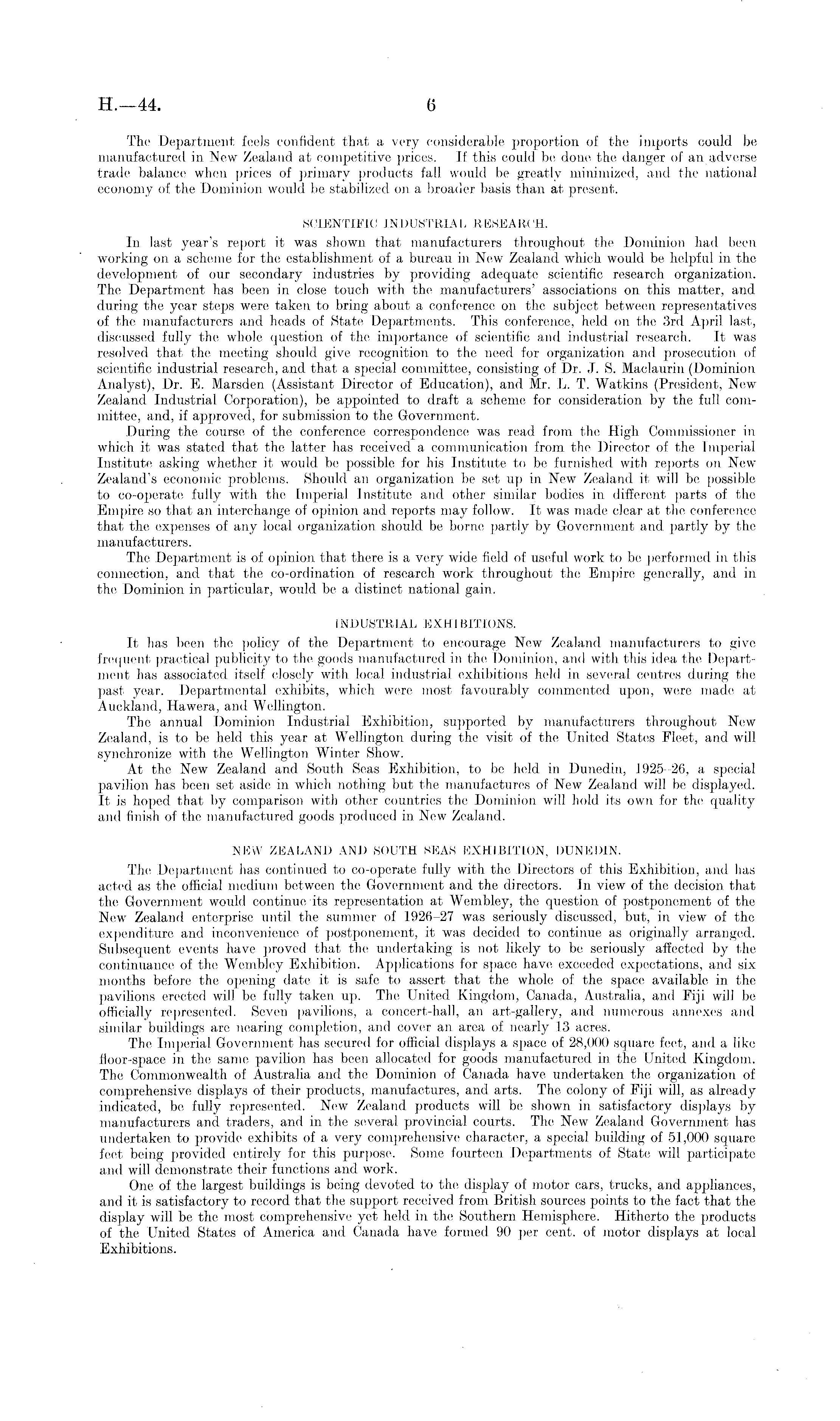 The Department feels confident that a very considerable proportion of the imports could be manufactured in New Zealand at competitive prices. If this could be done the danger of an adverse trade balance when prices of primary products fall would be greatlv minimized, and the national economy of the Dominion would be stabilized on a broader basis than at present. SCIENTIFIC INDUSTRIAL RESEARCH. In last year's report it was shown that manufacturers throughout the Dominion had been working on a scheme for the establishment of a bureau in New Zealand which would be helpful in the development of our secondary industries by providing adequate scientific research organization. The Department has been in close touch with the manufacturers' associations on this matter, and during the year steps were taken to bring about a conference on the subject between representatives of the manufacturers and heads of State Departments. This conference, held on the 3rd April last, discussed fully the whole question of the importance of scientific and industrial research. It was resolved that the meeting should give recognition to the need for organization and prosecution of scientific industrial research, and that a special committee, consisting of Dr. J. S. Maclaurin (Dominion Analyst), Dr. E. Marsden (Assistant Director of Education), and Mr. L. T. Watkins (President, New Zealand Industrial Corporation), be appointed to draft a scheme for consideration by the full committee, and, if approved, for submission to the Government. During the course of the conference correspondence wa,s read from the High Commissioner in which it was stated that the latter has received a communication from the Director of the Imperial Institute asking whether it would be possible for his Institute to be furnished with reports on New Zealand's economic problems. Should an organization be set up in New Zealand it will be possible to co-operate fully with the Imperial Institute and other similar bodies in different parts of the Empire so that an interchange of opinion and reports may follow. It was made clear at the conference that the expenses of any local organization should be borne partly by Government and partly by the manufacturers. The Department is of opinion that there is a very wide field of useful work to be performed in this connection, and that the co-ordination of research work throughout the Empire generally, and in the Dominion in particular, would be a distinct national gain. INDUSTRIAL EXHIBITIONS. It has been the policy of the Department to encourage New Zealand manufacturers to give frequent practical publicity to the goods manufactured in the Dominion, and with this idea the Department has associated itself closely with local industrial exhibitions held in several centres during the past year. Departmental exhibits, which were most favourably commented upon, were made at Auckland, Hawera, and Wellington. The annual Dominion Industrial Exhibition, supported by manufacturers throughout New Zealand, is to be held this year at Wellington during the visit of the United States Fleet, and will synchronize with the Wellington Winter Show. At the New Zealand and South Seas Exhibition, to be held in Dunedin, 1925-26, a special pavilion has been set aside in which nothing but the manufactures of New Zealand will be disjilayed. It is hoped that by comparison with other countries the Dominion will hold its own for the quality and finish of the manufactured goods produced in New Zealand. NEW ZEALAND AN J) SOUTH SEAS EXHIBITION, DUNEDIN. The Department has continued to co-operate fully with the Directors of this Exhibition, and has acted as the official medium between the Government and the directors. In view of the decision that the Government would continue its representation at Wembley, the question of postponement of the New Zealand enterprise until the summer of 1926-27 was seriously discussed, but, in view of the expenditure and inconvenience of postponement, it was decided to continue as originally arranged. Subsequent events have proved that the undertaking is not likely to be seriously affected by the continuance of the Wembley Exhibition. Applications for space have exceeded expectations, and six months before the opening date it is safe to assert that the whole of the space available in the pavilions erected will be fully taken up. The United Kingdom, Canada, Australia, and Fiji will be officially represented. Seven pavilions, a concert-hall, an art-gallery, and numerous annexes and similar buildings are nearing completion, and cover an area of nearly 13 acres. The Imperial Government has secured for official displays a space of 28,000 square feet, and a like floor-space in the same pavilion has been allocated for goods manufactured in the United Kingdom. The Commonwealth of Australia and the Dominion of Canada have undertaken the organization of comprehensive displays of their products, manufactures, and arts. The colony of Fiji will, as already indicated, be fully represented. New Zealand products will be shown in satisfactory displays by manufacturers and traders, and in the several provincial courts. The New Zealand Government has undertaken to provide exhibits of a very comprehensive character, a special building of 51,000 square feet being provided entirely for this purpose. Some fourteen Departments of State will participate and will demonstrate their functions and work. One of the largest buildings is being devoted to the display of motor cars, trucks, and appliances, and it is satisfactory to record that the support received from British sources points to the fact that the display will be the most comprehensive yet held in the Southern Hemisphere. Hitherto the products of the United States of America and Canada have formed 90 per cent, of motor displays at local Exhibitions.