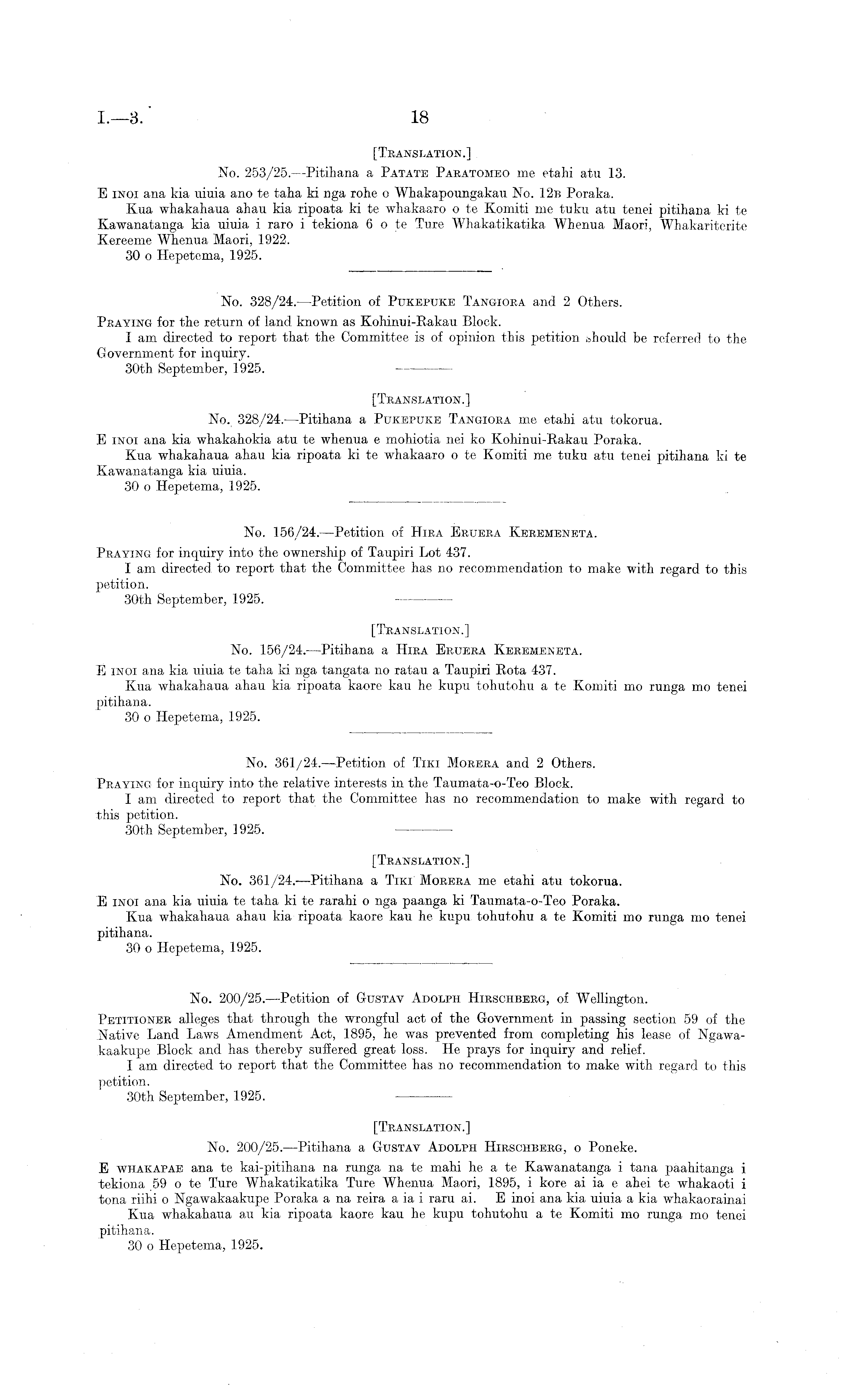 [Translation.] No. 253/25. —Pitihana a Patate Paratomeo me etahi atu 13. E inoi ana kia uiuia ano te taha ki nga rohe o Whakapoungakau No. 12b Poraka. Kua whakahaua ahau kia ripoata kite whakaaro o te Komiti me tuku atu tenei pitihana kite Kawanatanga kia uiuia i raro i tekiona 6 o te Ture Whakatikatika Whenua Maori, Whakariterite Kereeme Whenua Maori, 1922. 30 o Hepetema, 1925.