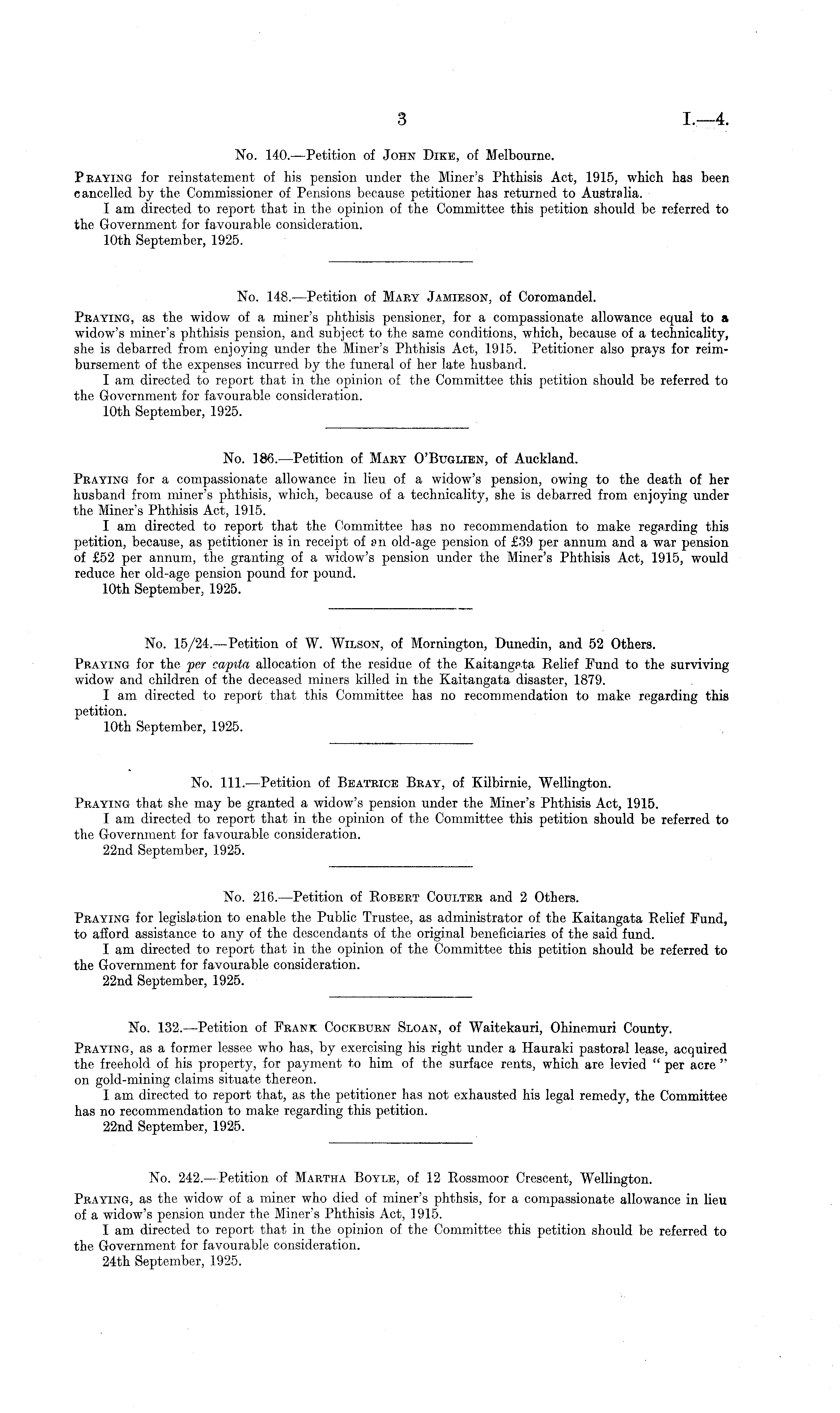 No. 148. —Petition of Mary Jamieson, of Coromandel. Praying, as the widow of a miner's phthisis pensioner, for a compassionate allowance equal to a widow's miner's phthisis pension, and subject to the same conditions, which, because of a technicality, she is debarred from enjoying under the Miner's Phthisis Act, 1915. Petitioner also prays for reimbursement of the expenses incurred by the funeral of her late husband. I am directed to report that in the opinion of the Committee this petition should be referred to the Government for favourable consideration. 10th September, 1925.
