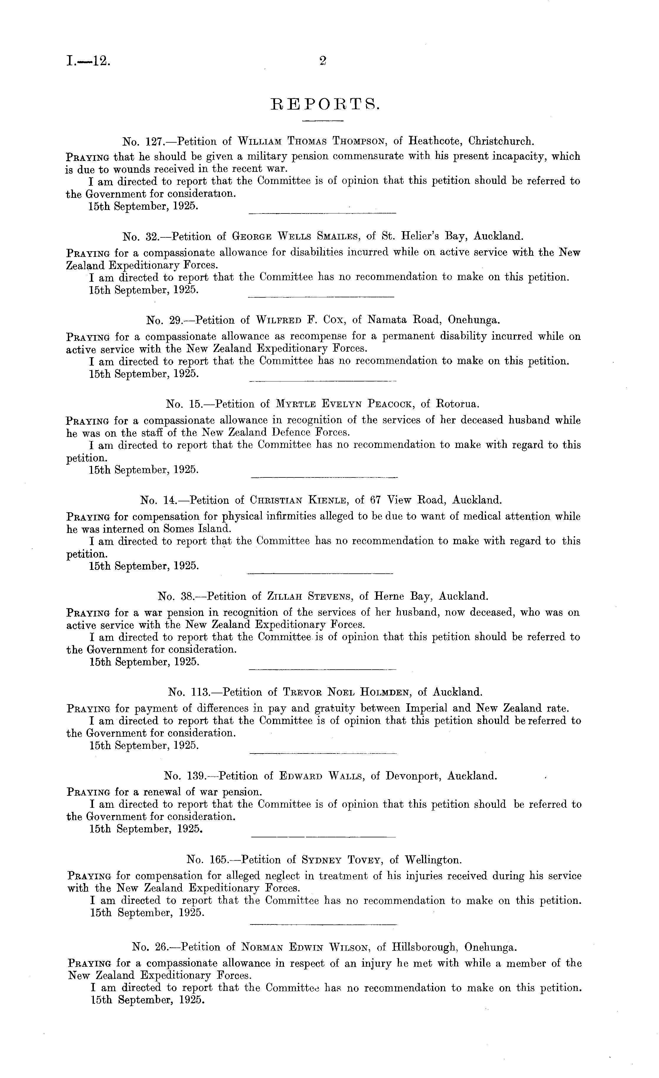 REPORTS. No. 127. —Petition of William Thomas Thompson, of Heathcote, Christchurch. Praying that he should be given a military pension commensurate with his present incapacity, which is due to wounds received in the recent war. I am directed to report that the Committee is of opinion that this petition should be referred to the Government for consideration. 15th September, 1925.