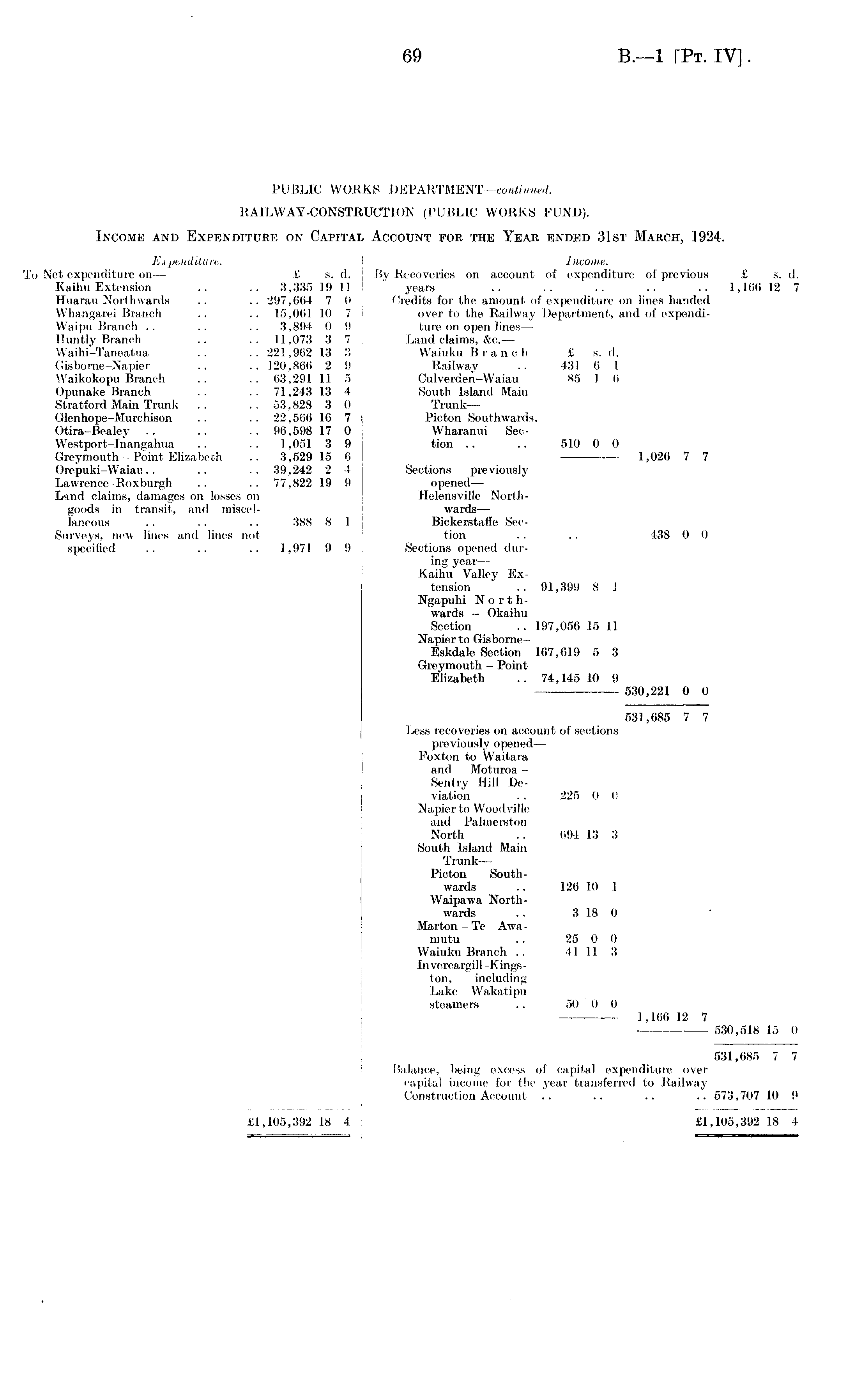 PUBLIC WORKS DEPARTMENT—continued. RAILWAY-CONSTRUCTION (PUBLIC WORKS FUND). Income and Expenditure on Capital Account for the Year ended 31st March, 1924. Expenditure. I Income. To Net expenditure on— £ s. d. ißy Recoveries on account of expenditure of previous £ s. d. Kaihu Extension .. .. 3,335 19 11 years .. .. .. .. .. 1,106 12 7 Huarau Northwards .. .. 297,664 7 0 Credits for the amount of expenditure on lines handed Whangarei Branch .. . . 15,061 10 7 over to the Railway Department, and of expendiWaipu Branch .. .. . . 3,894 0 9 ture on open lines — Huntly Branch .. .. 11,073 3 7 Land claims, &c.— Waihi-Taneatua .. .. 221,962 13 3 Waiuku Branch £ s. d. Gis borne-Napier .. .. 120,866 2 9 Railway .. 431 6 1 Waikokopu Branch .. .. 63,291 11 5 Culverden-Waiau 85 1 6 Opunake Branch .. .. 71,243 13 4 South Island Main Stratford Main Trunk .. .. 53,828 3 0 Trunk— Glenhope-Murchison .. .. 22,566 16 7 Picton Southwards, Otira-Bealey .. .. .. 96,598 17 0 Wharanui Sec-Westport-Tnangahua .. .. 1,051 3 9 tion .. .. 510 0 0 Greymouth - Point Elizabeth .. 3,529 15 6 1,026 7 7 Orepuki-Waiau.. .. .. 39,242 2 4 Sections previously Lawrence-Roxburgh .. .. 77,822 19 9 opened— Land claims, damages on losses on Helensville North - goods in transit, and miscel- wards— laneous .. .. .. 388 8 1 Bickerstaffe SecSurveys, new lines and lines not tion . . .. 438 0 0 specified .. .. .. 1,9719 9 Sections opened during year— Kaihu Valley Extension .. 91,399 8 1 Ngapuhi Northwards - Okaihu Section .. 197,056 15 11 Napier to GisborneEskdale Section 167,619 5 3 Greymouth - Point Elizabeth .. 74,145 10 9 530,221 0 0 531,685 7 7 Less recoveries on account of sections previously opened— Foxton to Waitara and Moturoa - Sentry Hill Deviation .. 225 0 0 Napier to Woodville and Palmerston North .. 694 13 3 South Island Main Trunk— Picton Southwards .. 126 10 1 Waipawa Northwards ~ 3 18 0 Marton -Te Awam utu .. 25 0 0 Waiuku Branch .. 41 11 3 In vercargill-Kings - ton, including Lake Wakatipu steamers .. 50 0 0 1,166 12 7 530,518 15 0 531,685 7 7 Balance, being excess of capital expenditure over capital income for the year transferred to Railway Construction Account .. .. .. .. 573,707 10 9 £1,105,392 18 4 £1,105,392 18 4