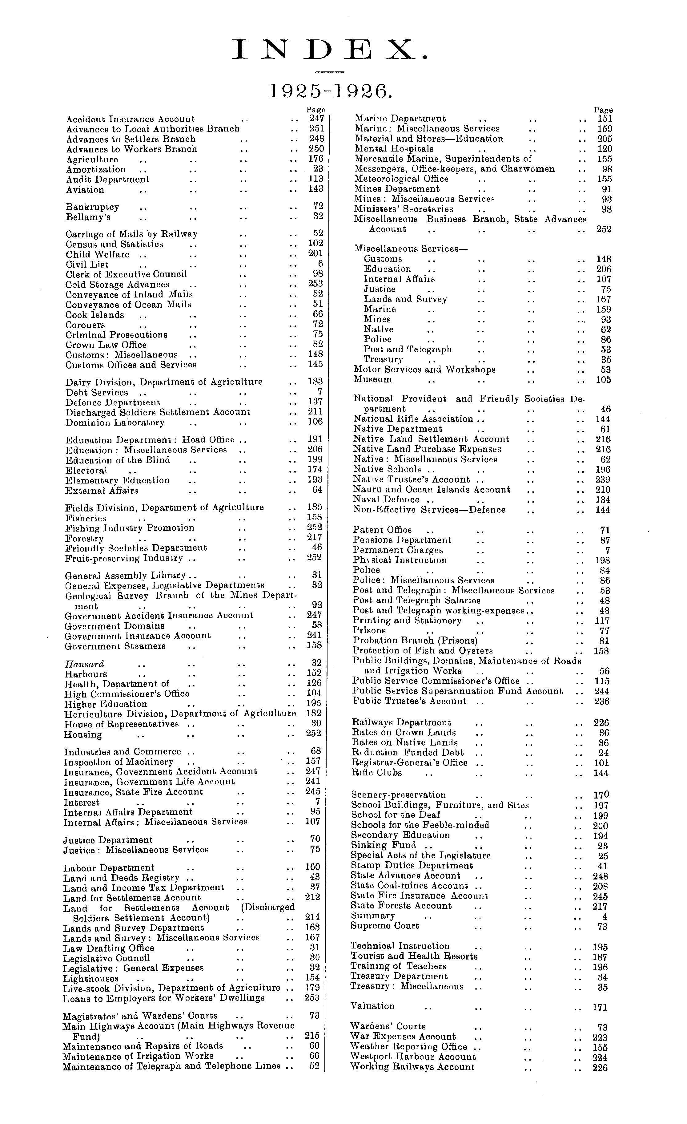 1925-1926. Page Page Accident Insurance Account .. .. 247 Marine Department .. .. .. 151 Advances to Local Authorities Branch .. 251 Marine: Miscellaneous Services .. .. 159 Advances to Settlers Branch .. .. 248 Material and Stores—Education .. .. 205 Advances to Workers Branch .. .. 250 Mental Hospitals .. .. .. 120 Agriculture .. .. .. .. 176 Mercantile Marine, Superintendents of .. 155 Amortization .. .. .. .. 23 Messengers, Office-keepers, and Charwomen .. 98 Audit Department .. .. ..113 Meteorological Office .. .. .. 155 Aviation .. .. .. .. 143 Mines Department .. .. 91 Mines: Miscellaneous Services .. 93 Bankruptcy .. .. .. ..72 Ministers' Secretaries .. .. ..98 Bellamy's .. .. .. 32 Miscellaneous Business Branch, State Advances Carriage of Mails by Railway .. ..52 Account .. .. .. .. 252 StatistioB •• •• •• Miscellaneous Servioes — Child Welfare .. .. .. -.201 ouBtomß .. .. .. U8 n\ i * L i.-" n " '* qq Education .. .. .. ..206 Clerk of Executive Council .. ..98 T «f n „, n i m<7 u cii • j okq internal Affairs .. .. .. 107 Cold Storage Advances .. .. .. 256 Triori™ 7* Conveyance of Inland Mails .. ..52 Lands and Survey 167 Conveyance of Ocean Mails .. ..51 Marine ' _ .. _. 159 Cook Islands .. .. .. .. 66 Mjne£ , 93 Coroners .. .. .. 72 Native .. .. .. 62 Criminal Prosecutions .. .. ..id Pnli^P Grown Law Office .. .. 82 p dT, '' h " " "53 Customs: Miscellaneous .. .. ..148 " " " ot Customs Offices and Services .. ..145 Motor Services and Workshops 53 Dairy Division, Department of Agriculture .. 183 Museum .. .. .. .. 105 Debt Services .. .. .. •• 7 . Defence Department .. .. .. 137 National Provident and Friendly Societies DeDischarged Soldiers Settlement Account .. 211 partment " ..46 Dominion Laboratory .. .. ..106 National Rifle Association .. .. ..144 Native Department .. .. 61 Education Department: Head Offioe .. .. 191 Native Land Settlement Account .. .. 216 Education : Miscellaneous Services .. .. 206 Native Land Purohase Expenses .. .. 216 Education of the Blind .. .. .. 199 Native: Miscellaneous Servioes .. ..62 Electoral .. .. .. .. 174 Native Schools .. .. .. .. 196 Elementary Education .. .. .. 193 Native Trustee's Account .. .. .. 239 External Affairs .. .. ..64 Nauru and Ocean Islands Account .. .. 210 Naval Defence .. .. .. .. 134 Fields Division, Department of Agriculture .. 185 Non-Effeotive Services —Defence .. .. 144 Fisheries .. .. .. .. 158 Fishing Industry Promotion .. .. 252 Patent Office .. .. .. 71 Forestry .. .. .. .. 217 Pensions Department .. .. 87 Friendly Societies Department .. ..46 Permanent Charges .. .. .. 7 Fruit-preserving Industry .. .. ..252 Phvsical Instruction .. .. .. 198 General Assembly Library ..31 Pohce: Miscellaneous Services '.i !! 86 General Expenses, Legislative Departments 32 Post and Telegraph: Miscellaneous Services .. 53 Geological Survey Branch of the Mines Depart- Post and Telelraph Salaries .. ..48 Government Accident Insurance Account !! M ZiS Government Domains .. .. 58 Prisons 77 Government Insurance Account .. ..241 Probation Branch (Prisons)" 81 Government Steamers .. .. ..158 Protection of Fish and Oysters .. ..158 Hansard .. ■■ •• ..32 Public Buildings, Domains, Maintenance of Roads Harbours " 152 and Irrigation Works .. .. ..56 Health, Department of .. .. .. 126 Public Service Commissioner's Office .. .. 115 High Commissioner's Office .. ..104 Public Service Superannuation Fund Account .. 244 Higher Education .. .. .. 195 Public Trustee's Account .. .. .. 236 Horticulture Division, Department of Agriculture 182 House of Representatives .. .. 30 Railways Department .. .. .. 226 Housing .. .. ■ • • • 252 Rates on Crown Lands .. .. 36 Rates on Native Lands .. .. ..36 Industries and Commerce .. .. ..68 Reduction Funded Debt .. .. ..24 Inspection of Machinery .. .. .. 157 Registrar-General's Offioe .. .. .. 101 Insurance, Government Accident Aocount .. 247 Rifle Clubs .. .. .. .. 144 Insuranoe, Government Life Account .. 241 Insurance, State Fire Account .. .. 245 Scenery-preservation .. .. .. 170 Interest .. .. .. 7 School Buildings, Furniture, and Sites .. 197 Internal Affairs Department .. .. 95 School for the Deaf .. .. ..199 Internal Affairs : Miscellaneous Services .. 107 Schools for the Feeble-minded .. .. 200 t , ■ -r, I.™ 1n Secondary Education .. .. .. 194 Justice Department .. .. ..70 ainkini? Fund 93 Justice: Miscellaneous Servioes .. .. 75 . j=> . •• •• 23 Speoial Acts of the Legislature .. ..25 Labour Department .. .. .. 160 Stamp Duties Department .. 41 Land and Deeds Registry .. .. 43 State Advances Account .. .. .. 248 Land and Income Tax Department .. ..37 State Coal-mines Account .. .. ..208 Land for Settlements Account .. .. 212 State Fire Insurance Account .. .. 245 Land for Settlements Account (Discharged State Forests Account .. .. .. 217 Soldiers Settlement Account) .. .. 214 Summary .. .. .. 4 Lands and Survey Department .. .. 163 Supreme Court .. .. 73 Lands and Survey : Miscellaneous Services .. 167 Law Drafting Office .. .. 31 Technioal Instruction .. .. .. 195 Legislative Council .. .. 30 Tourist and Health Resorts .. .. 187 Legislative: General Expenses .. .. 32 Training of Teachers .. .. .. 196 Lighthouses .. .. .. ..154 Treasury Department .. .. ..34 Live-stock Division, Department of Agriculture .. 179 Treasury : Miscellaneous .. .. .. 35 Loans to Employers for Workers' Dwellings .. 253 Valuation .. .. .. .. 171 Magistrates' and Wardens' Courts .. 73 Main Highways Aocount (Main Highways Revenue Wardens' Courts .. .. ..73 Fund) .. .. .. .. 215 War Expenses Aocount .. .. .. 223 Maintenance and Repairs of Roads .. .. 60 Weather Reporting Office .. .. .. 155 Maintenance of Irrigation Works .. ..60 Westport Harbour Account .. .. 224 Maintenance of Telegraph and Telephone Lines .. 52 Working Railways Account .. .. 226
