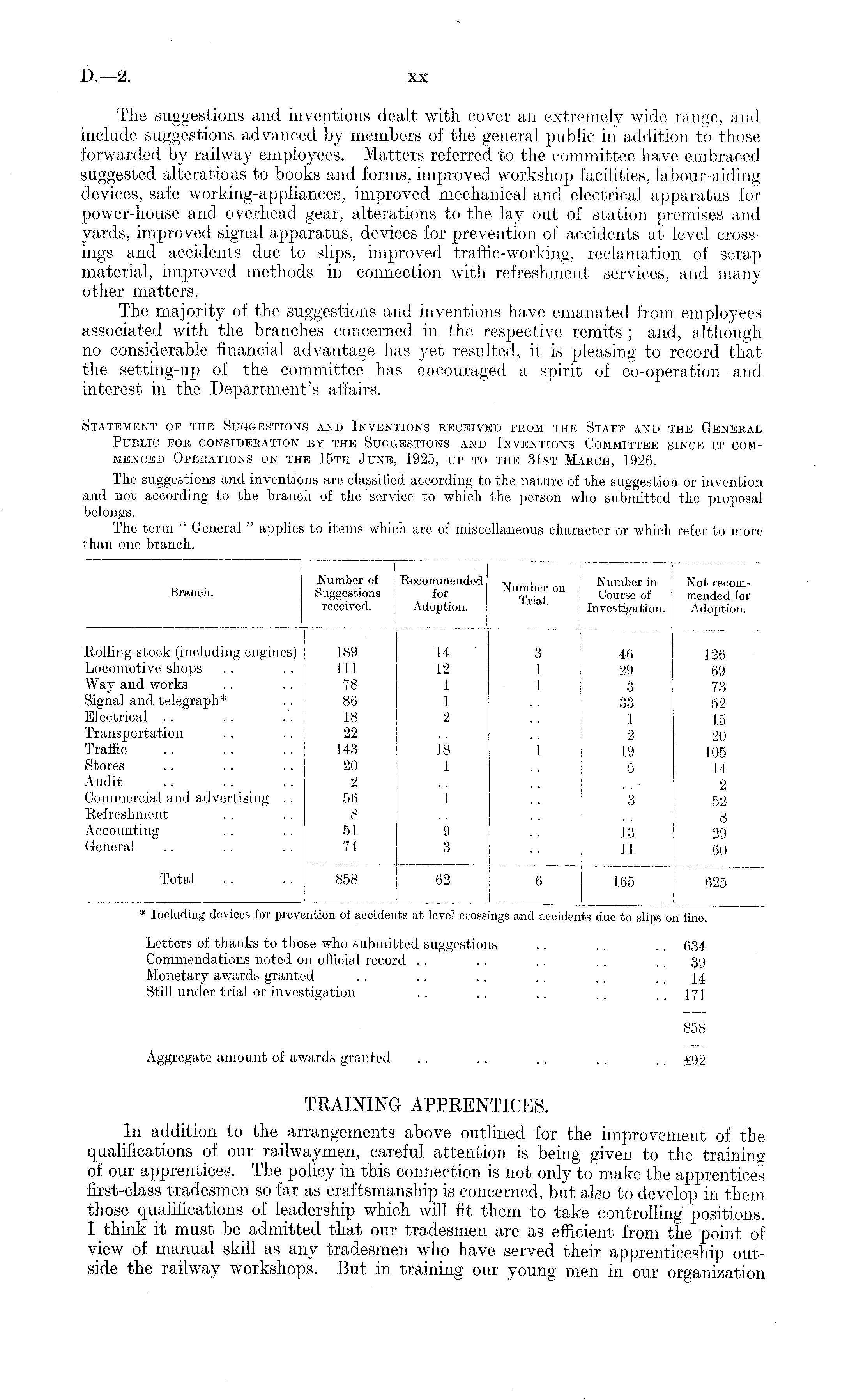 Letters of thanks to those who submitted suggestions .. . . .. 634 Commendations noted on official record .. .. . . . . .. 39 Monetary awards granted . . .. .. .. . . . . 14 Still under trial or investigation .. .. .. . . . . ]71 858 Aggregate amount of awards granted .. .. .. .. .. £92 TRAINING APPRENTICES. In addition to the arrangements above outlined for the improvement of the qualifications of our railwaymen, careful attention is being given to the training of our apprentices. The policy in this connection is not only to make the apprentices first-class tradesmen so far as craftsmanship is concerned, but also to develop in them those qualifications of leadership which will fit them to take controlling positions. I think it must be admitted that our tradesmen are as efficient from the point of view of manual skill as any tradesmen who have served their apprenticeship outside the railway workshops. But in training our young men in our organization