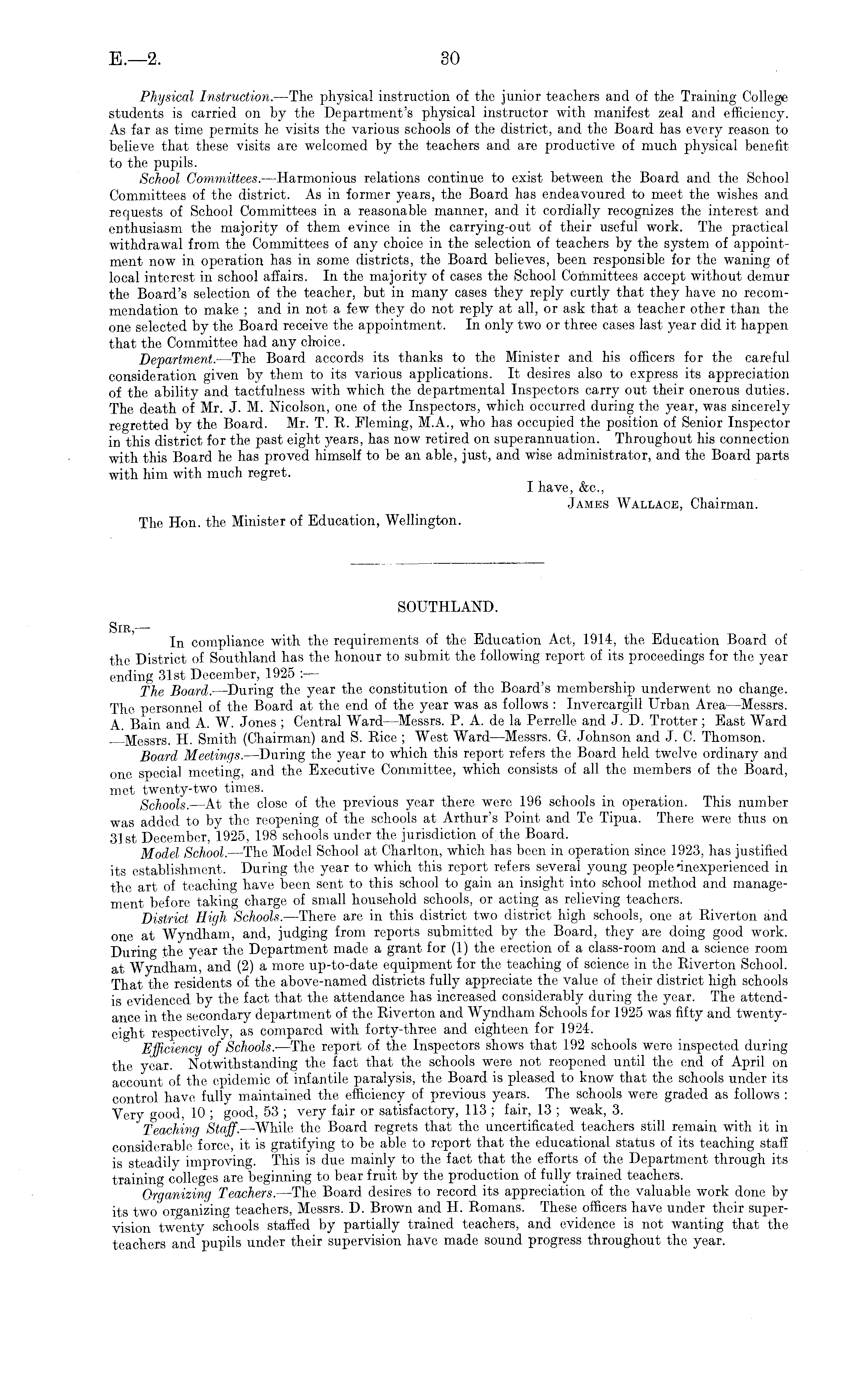 SOUTHLAND. Sir, —• In compliance with the requirements of the Education Act, 1914, the Education Board of the District of Southland has the honour to submit the following report of its proceedings for the year ending 31st December, 1925 : — The Board. —During the year the constitution of the Board's membership underwent no change. The personnel of the Board at the end of the year was as follows : Invercargill Urban Area —Messrs. A Bain and. A. W. Jones ; Central Ward —Messrs. P. A. de la Perrelle and J. D. Trotter; East Ward Messrs. H. Smith (Chairman) and S. Rice ; West Ward —Messrs. G. Johnson and J. C. Thomson. Board Meetings.—During the year to which this report refers the Board held twelve ordinary and one special meeting, and the Executive Committee, which consists of all the members of the Board, met twenty-two times. Schools. —At the close of the previous year there were 196 schools in operation. This number was added to by the reopening of the schools at Arthur's Point and Te Tipua. There were thus on 31st December, 1925, 198 schools under the jurisdiction of the Board. Model School. —The Model School at Charlton, which has been in operation since 1923, has justified its establishment. During the year to which this report refers several young people "inexperienced in the aTt of teaching have been sent to this school to gain an insight into school method and management before taking charge of small household schools, or acting as relieving teachers. District High Schools. —There are in this district two district high schools, one at Riverton and one at Wyndham, and, judging from reports submitted by the Board, they are doing good work. During the year the Department made a grant for (1) the erection of a class-room and a science room at Wyndham, and (2) a more up-to-date equipment for the teaching of science in the Riverton School. That the residents of the above-named districts fully appreciate the value of their district high schools is evidenced by the fact that the attendance has increased considerably during the year. The attendance in the secondary department of the Riverton and Wyndham Schools for 1925 was fifty and twentyeight respectively, as compared with forty-three and eighteen for 1924. Efficiency of Schools. —The report of the Inspectors shows that 192 schools were inspected during the year. Notwithstanding the fact that the schools were not reopened until the end of April on account of the epidemic of infantile paralysis, the Board is pleased to know that the schools under its control have fully maintained the efficiency of previous years. The schools were graded as follows : Very good, 10 ; good, 53 ; very fair or satisfactory, 113 ; fair, 13 ; weak, 3. Teaching Staff. —While the Board regrets that the uncertificated teachers still remain with it in considerable force, it is gratifying to be able to report that the educational status of its teaching staff is steadily improving. This is due mainly to the fact that the efforts of the Department through its training colleges are beginning to bear fruit by the production of fully trained teachers. Organizing Teachers. —The Board desires to record its appreciation of the valuable work done by its two organizing teachers, Messrs. D. Brown and H. Romans. These officers have under their supervision twenty schools stalled by partially trained teachers, and evidence is not wanting that the teachers and pupils under their supervision have made sound progress throughout the year.