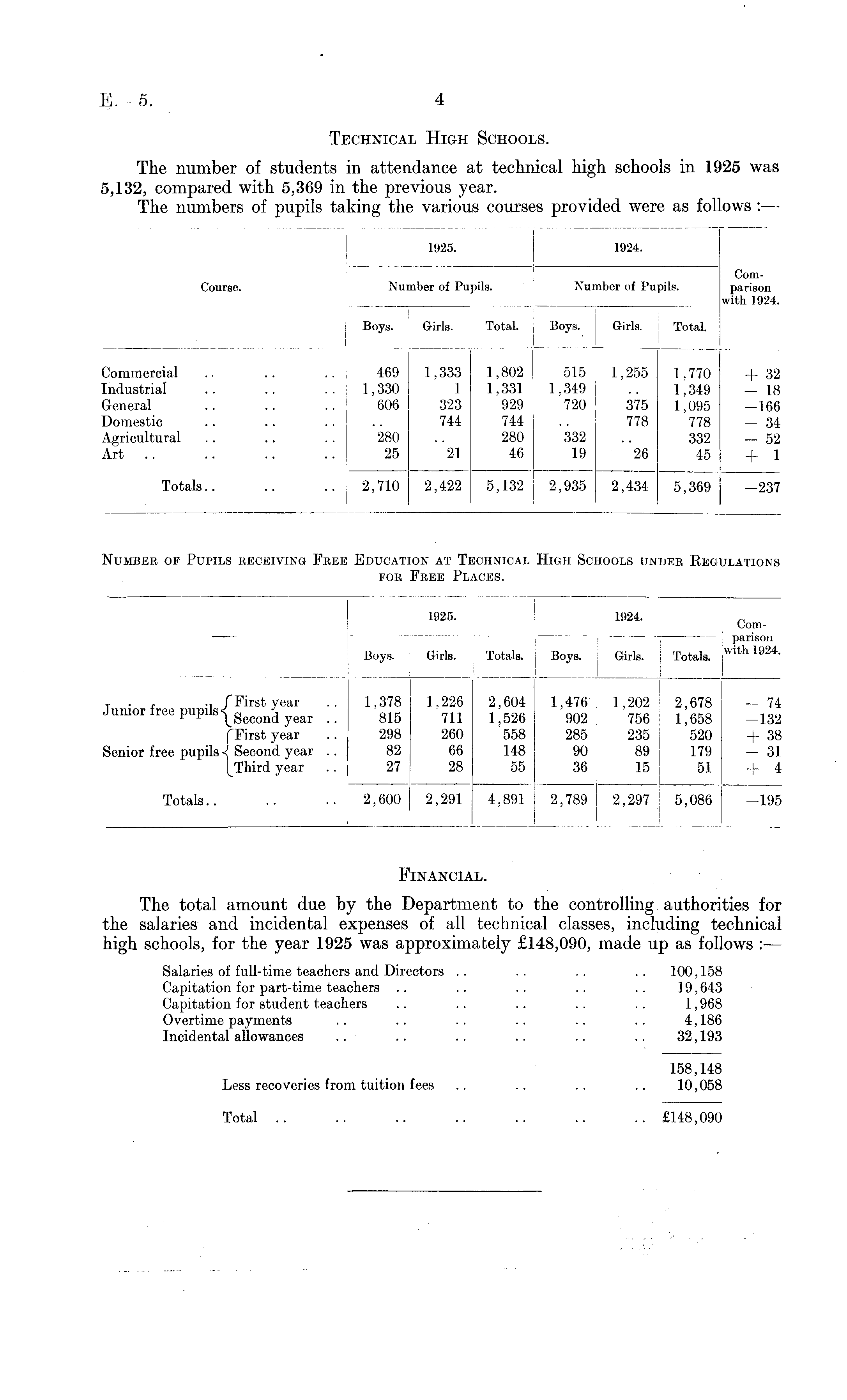 Technical High Schools. The number of students in attendance at technical high schools in 1925 was 5,132, compared with 5,369 in the previous year. The numbers of pupils taking the various courses provided were as follows