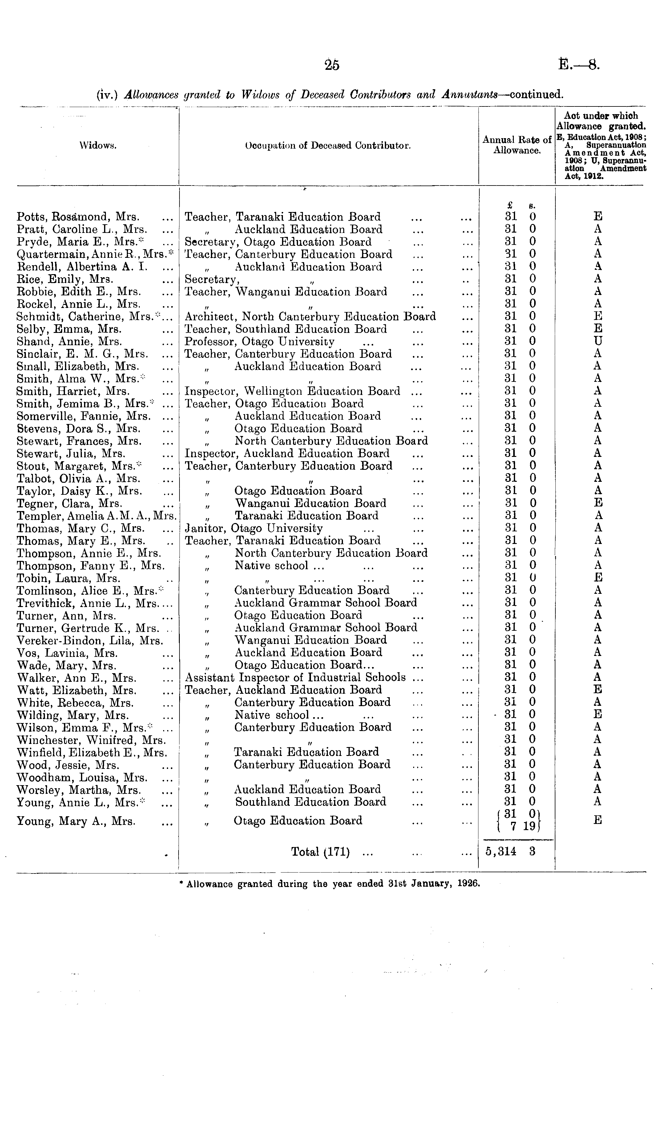 Aot under which Allowance granted. Annual Rata of E > Education Act, 1908; Widows. OccuTJation of Deceased Contributor. ,,, A, Superannuation 1 Allowance. Amendment Act, 1908; U, Superannuation Amendment Act, 1912. £ 6. Potts, Rosamond, Mrs. ... Teacher, Taranaki Education Board ... ... 31 0 E Pratt, Caroline L., Mrs. ... „ Auckland Education Board ... ... 31 0 A Pryde, Maria E., Mrs.* ... Secretary, Otago Education Board ... ... 31 0 A Quartermain,AnnieR., Mrs.* Teacher, Canterbury Education Board ... ... 31 0 A Rendell, Albertina A. I. ... „ Auckland Education Board ... ... 31 0 A Rice, Emily, Mrs. ... Secretary, „ ... .. 31 0 A Robbie, Edith E., Mrs. ... Teacher, Wanganui Education Board ... ... 31 0 A Rockel, Annie L., Mrs. ... „ „ ... ... 31 0 A Schmidt, Catherine, Mrs.*... Architect, North Canterbury Education Board ... 31 0 E Selby, Emma, Mrs. ... Teacher, Southland Education Board ... ... 31 0 E Shand, Annie, Mrs. ... Professor, Otago University ... ... ... 31 0 U Sinclair, E. M. G., Mrs. ... Teacher, Canterbury Education Board ... ... 31 0 A Small, Elizabeth, Mrs. ... „ Auckland Education Board ... ... 31 0 A Smith, Alma W., Mrs.* ... „ „ ... ... 31 0 A Smith, Harriet, Mrs. ... Inspector, Wellington Education Board ... ... 31 0 A Smith, Jemima B., Mrs.* ... Teacher, Otago Education Board ... ... 31 0 A Somerville, Fannie, Mrs. ... „ Auckland Education Board ... ... 31 0 A Stevens, Dora S., Mrs. ... „ Otago Education Board ... ... 31 0 A Stewart, Frances, Mrs. ... „ North Canterbury Education Board ... 31 0 A Stewart, Julia, Mrs. ... Inspector, Auckland Education Board ... ... 31 0 A Stout, Margaret, Mrs.* ... Teacher, Canterbury Education Board ... ... 31 0 A Talbot, Olivia A., Mrs. ... „ „ ... ... 31 0 A Taylor, Daisy K., Mrs. ... „ Otago Education Board ... ... 31 0 A Tegner, Clara, Mrs. ... „ Wanganui Education Board ... ... 31 0 E Templer, Amelia A.M. A., Mrs. „ Taranaki Education Board ... ... 31 0 A Thomas, Mary C., Mrs. ... Janitor, Otago University ... ... ... 31 0 A Thomas, Mary E., Mrs. .. Teacher, Taranaki Education Board ... ... 31 0 A Thompson, Annie E., Mrs. „ North Canterbury Education Board ... 31 0 A Thompson, Fanny E., Mrs. „ Native school ... ... ... ... 31 0 A Tobin, Laura, Mrs. .. „ „ ... ... ... ... 31 0 E Tomlinson, Alice E., Mrs.* Canterbury Education Board ... ... 31 0 A Trevithick, Annie L., Mrs „ Auckland Grammar School Board ... 31 0 A Turner, Ann, Mrs. ... „ Otago Education Board ... ... 31 0 A Turner, Gertrude K., Mrs. . „ Auckland Grammar School Board ... 31 0 A Vereker-Bindon, Lila, Mrs. „ Wanganui Education Board ... ... 31 0 A Vos, Lavinia, Mrs. ... „ Auckland Education Board ... ... 31 0 A Wade, Mary, Mrs. ... „ Otago Education Board... ... ... 31 0 A Walker, Ann E., Mrs. ... Assistant Inspector of Industrial Schools ... ... 31 0 A Watt, Elizabeth, Mrs. ... Teacher, Auckland Education Board ... ... 31 0 E White, Rebecca, Mrs. ... „ Canterbury Education Board . . ... 31 0 A Wilding, Mary, Mrs. ... „ Native school... ... ... ... 31 0 E Wilson, Emma F., Mrs.* ... „ Canterbury Education Board ... ... 31 0 A Winchester, Winifred, Mrs. „ „ ... ... 31 0 A Winfield, Elizabeth E., Mrs. „ Taranaki Education Board ... . . 31 0 A Wood, Jessie, Mrs. ... „ Canterbury Education Board ... ... 31 0 A Woodham, Louisa, Mrs. ... „ „ ... ... 31 0 A Worsley, Martha, Mrs. ... „ Auckland Education Board ... ... 31 0 A Young, Annie L., Mrs.* ... Southland Education Board ... ... 31 0 A ( 31 0) Young, Mary A., Mrs. ... „ Otago Education Board ... ... j E Total (171) 5,314 3 * Allowance granted during the year ended 31st January, 1926.