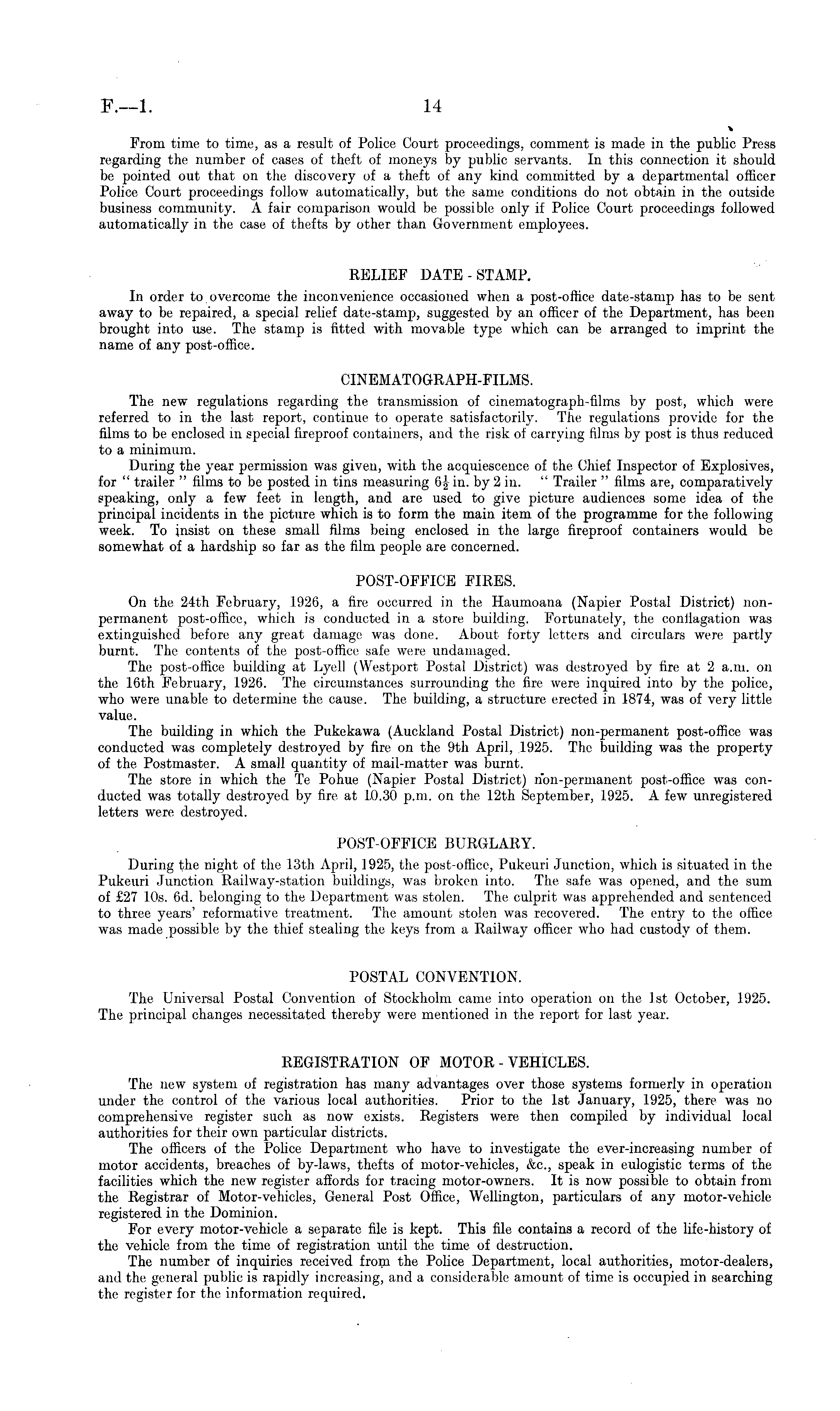 % From time to time, as a result of Police Court proceedings, comment is made in the public Press regarding the number of cases of theft of moneys by public servants. In this connection it should be pointed out that on the discovery of a theft of any kind committed by a departmental officer Police Court proceedings follow automatically, but the same conditions do not obtain in the outside business community. A fair comparison would be possible only if Police Court proceedings followed automatically in the case of thefts by other than Government employees. RELIEF DATE-STAMP. In order to overcome the inconvenience occasioned when a post-office date-stamp has to be sent away to be repaired, a special relief date-stamp, suggested by an officer of the Department, has been brought into use. The stamp is fitted with movable type which can be arranged to imprint the name of any post-office. CINEMATOGRAPH-FILMS. The new regulations regarding the transmission of cinematograph-films by post, which were referred to in the last report, continue to operate satisfactorily. The regulations provide for the films to be enclosed in special fireproof containers, and the risk of carrying films by post is thus reduced to a minimum. During the year permission was given, with the acquiescence of the Chief Inspector of Explosives, for " trailer " films to be posted in tins measuring 6jin. by 2 in. " Trailer " films are, comparatively speaking, only a few feet in length, and are used to give picture audiences some idea of the principal incidents in the picture which is to form the main item of the programme for the following week. To insist on these small films being enclosed in the large fireproof containers would be somewhat of a hardship so far as the film people are concerned. POST-OFFICE FIRES. On the 24th February, 1926, a fire occurred in the Haumoana (Napier Postal District) nonpermanent post-office, which is conducted in a store building. Fortunately, the conflagation was extinguished before any great damage was done. About forty letters and circulars were partly burnt. The contents of the post-office safe were undamaged. The post-office building at Lyell (Westport Postal District) was destroyed by fire at 2 a.m. on the 16th February, 1926. The circumstances surrounding the fire were inquired into by the police, who were unable to determine the cause. The building, a structure erected in 1874, was of very little value. The building in which the Pukekawa (Auckland Postal District) non-permanent post-office was conducted was completely destroyed by fire on the 9th April, 1925. The building was the property of the Postmaster. A small quantity of mail-matter was burnt. The store in which the Te Pohue (Napier Postal District) non-permanent post-office was conducted was totally destroyed by fire at 1.0.30 p.m. on the 12th September, 1925. A few unregistered letters were destroyed. POST-OFFICE BURGLARY. During the night of the 13th April, 1925, the post-office, Pukeuri Junction, which is situated in the Pukeuri Junction Railway-station buildings, was broken into. The safe was opened, and the sum of £27 10s. 6d. belonging to the Department was stolen. The culprit was apprehended and sentenced to three years' reformative treatment. The amount stolen was recovered. The entry to the office was made possible by the thief stealing the keys from a Railway officer who had custody of them. POSTAL CONVENTION. The Universal Postal Convention of Stockholm came into operation on the Ist October, 1925. The principal changes necessitated thereby were mentioned in the report for last year. REGISTRATION OF MOTOR - VEHICLES. The new system of registration has many advantages over those systems formerly in operation under the control of the various local authorities. Prior to the Ist January, 1925, there was no comprehensive register such as now exists. Registers were then compiled by individual local authorities for their own particular districts. The officers of the Police Department who have to investigate the ever-increasing number of motor accidents, breaches of by-laws, thefts of motor-vehicles, &c., speak in eulogistic terms of the facilities which the new register affords for tracing motor-owners. It is now possible to obtain from the Registrar of Motor-vehicles, General Post Office, Wellington, particulars of any motor-vehicle registered in the Dominion. For every motor-vehicle a separate file is kept. This file contains a record of the life-history of the vehicle from the time of registration until the time of destruction. The number of inquiries received from the Police Department, local authorities, motor-dealers, and the general public is rapidly increasing, and a considerable amount of time is occupied in searching the register for the information required.