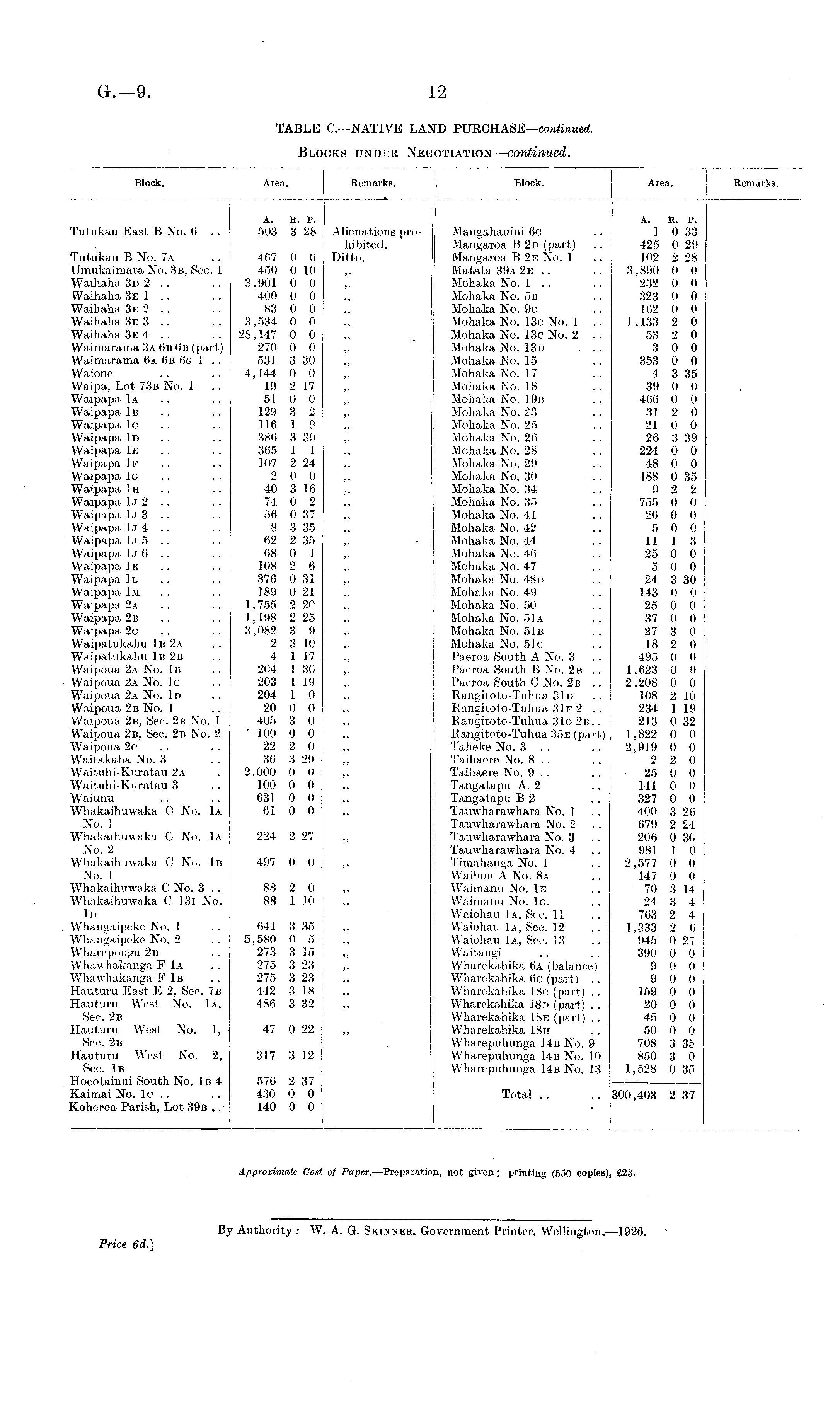 Block. Area. : Remarks, A. E. P. Mangahauini 6c .. 1 0 33 Mangaroa B 2d (part) .. 425 0 29 Mangaroa B 2e No. 1 .. 102 2 28 Matata 39a 2e .. .. 3,890 0 0 Mohaka No. 1 .. .. 232 0 0 Mohaka No. 5b .. 323 0 0 Mohaka No. 9c .. 162 0 0 Mohaka No. 13c No. 1 .. 1,133 2 0 Mohaka No. 13c No. 2 .. 53 2 0 ] Mohaka No. 13d ... 300 Mohaka No. 15 .. 353 0 0 Mohaka No. 17 .. 4 3 35 Mohaka No. 18 .. 39 0 0 . Mohaka No. 19b .. 466 0 0 Mohaka No. 23 . . 31 2 0 Mohaka No. 25 .. 21 0 0 Mohaka No. 26 .. 26 3 39 Mohaka No. 28 .. 224 0 0 Mohaka No. 29 .. 48 0 0 Mohaka No. 30 .. 188 0 35 Mohaka No. 34 .. 9 2 2 Mohaka No. 35 .. 755 0 0 Mohaka No. 41 .. 26 0 0 Mohaka No. 42 .. 5 0 0 Mohaka No. 44 .. 11 1 3 Mohaka No. 46 .. 25 0 0 Mohaka No. 47 .. 5 0 0 Mohaka No. 48d .. 24 3 30 Mohaka No. 49 . . 143 0 0 Mohaka No. 50 .. 25 0 0 Mohaka No. 51a .. 37 0 0 Mohaka No. 51b .. 27 3 0 Mohaka No. 51c .. 18 2 0 Paeroa South A No. 3 .. 495 0 0 Paeroa South B No. 2b .. 1,623 0 0 Paeroa South C No. 2b .. 2,208 0 0 Rangitoto-Tuhua 31d .. 108 2 10 Rangitoto-Tuhua 311 2 .. 234 1 19 Rangitoto-Tuhua 31g 2b. . 213 0 32 Rangitoto-Tuhua 35e (part) 1,822 0 0 Taheke No. 3 .. .. 2,919 0 0 Taihaere No. 8 .. .. 2 2 0 Taihaere No. 9 . . . . 25 0 0 Tangatapu A. 2 .. 141 0 0 Tangatapu B 2 .. 327 0 0 Tauwharawhara No. 1 .. 400 3 26 Tauwharawhara No. 2 .. 679 2 24 Tauwharawhara No. 3 .. 206 0 30 Tauwharawhara No. 4 .. 981 1 0 Timahanga No. 1 .. 2,577 0 0 Waihou A No. 8a .. 147 0 0 Waimanu No. 1e .. 70 3 14 Waimanu No. 1g. . . 24 3 4 Waiohau 1a, Sec. 11 .. 763 2 4 Waiohau 1a, Sec. 12 .. 1,333 2 6 Waiohau Ia, Sec. 13 .. 945 0 27 Waitangi .. .. 390 0 0 Wharekahika 6a (balance) 9 0 0 Wharekahika 6c (part) .. 9 0 0 Wharekahika 18c (part) .. 159 0 0 Wharekahika 18d (part) .. 20 0 0 Wharekahika 18s (part) .. 45 0 0 Wharekahika 18h .. 50 0 0 Wharepuhunga 14b No. 9 708 3 35 Wharepuhunga 14b No. 10 850 3 0 Wharepuhunga 14b No. 13 1,528 0 35 Total .. .. 300,403 2 37