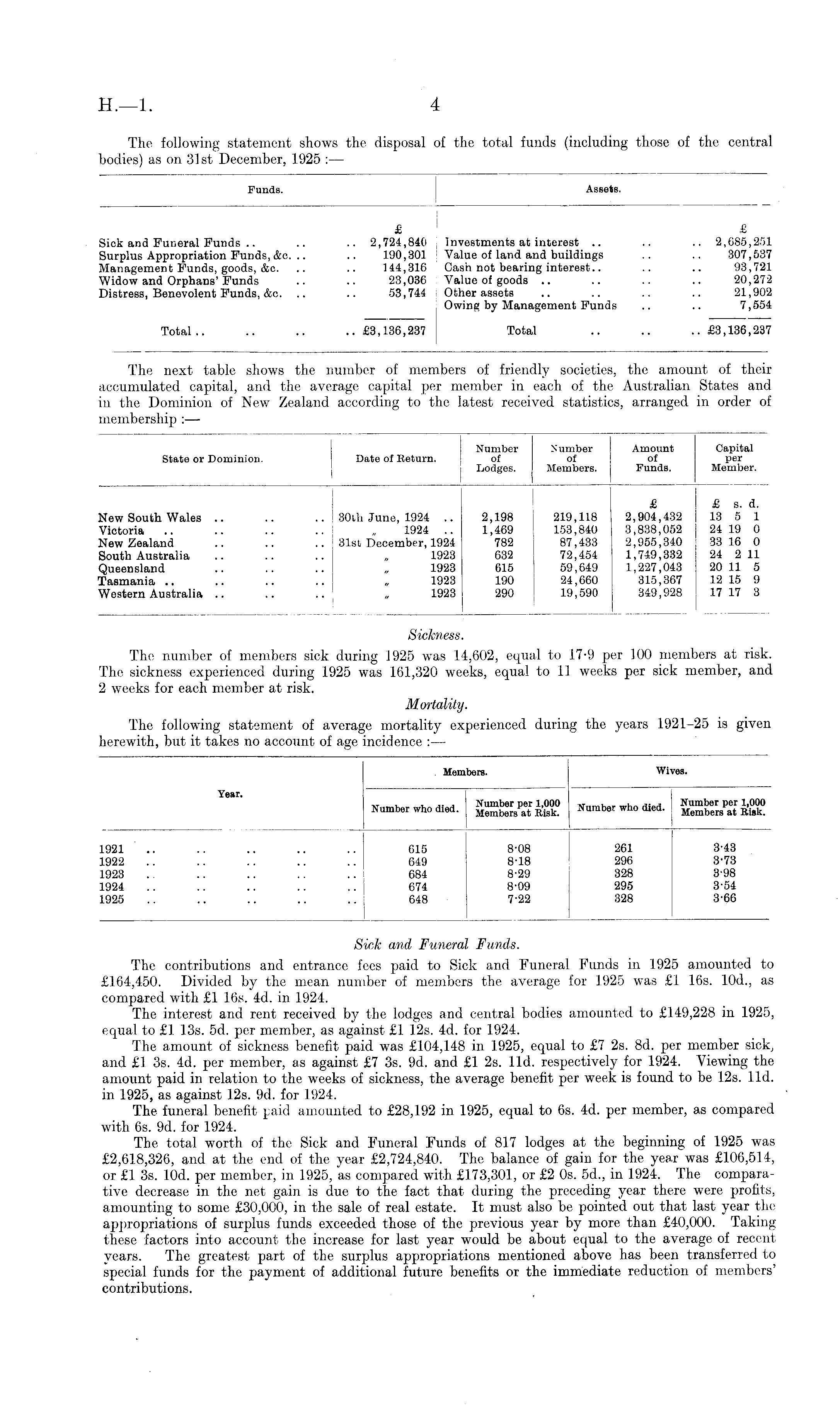 Sick and Funeral Funds. The contributions and entrance fees paid to Sick and Funeral Funds in 1925 amounted to £164,450. Divided by the mean number of members the average for 1925 was £1 16s. 10d., as compared with £1 16s. 4d. in 1924. The interest and rent received by the lodges and central bodies amounted to £149,228 in 1925, equal to £1 13s. sd. per member, as against £1 12s. 4d. for 1924. The amount of sickness benefit paid was £104,148 in 1925, equal to £7 2s. Bd. per member sick, and £1 3s. 4d. per member, as against £7 3s. 9d. and £1 2s. lid. respectively for 1924. Viewing the amount paid in relation to the weeks of sickness, the average benefit per week is found to be 12s. lid. in 1925, as against 12s. 9d. for 1924. The funeral benefit paid amounted to £28,192 in 1925, equal to 6s. 4d. per member, as compared with 6s. 9d. for 1924. The total worth of the Sick and Funeral Funds of 817 lodges at the beginning of 1925 was £2,618,326, and at the end of the year £2,724,840. The balance of gain for the year was £106,514, or £1 3s. lOd. per member, in 1925, as compared with £173,301, or £2 os. 5d., in 1924. The comparative decrease in the net gain is due to the fact that during the preceding year there were profits, amounting to some £30,000, in the sale of real estate. It must also be pointed out that last year the appropriations of surplus funds exceeded those of the previous year by more than £40,000. Taking these factors into account the increase for last year would be about equal to the average of recent years. The greatest part of the surplus appropriations mentioned above has been transferred to special funds for the payment of additional future benefits or the immediate reduction of members' contributions.