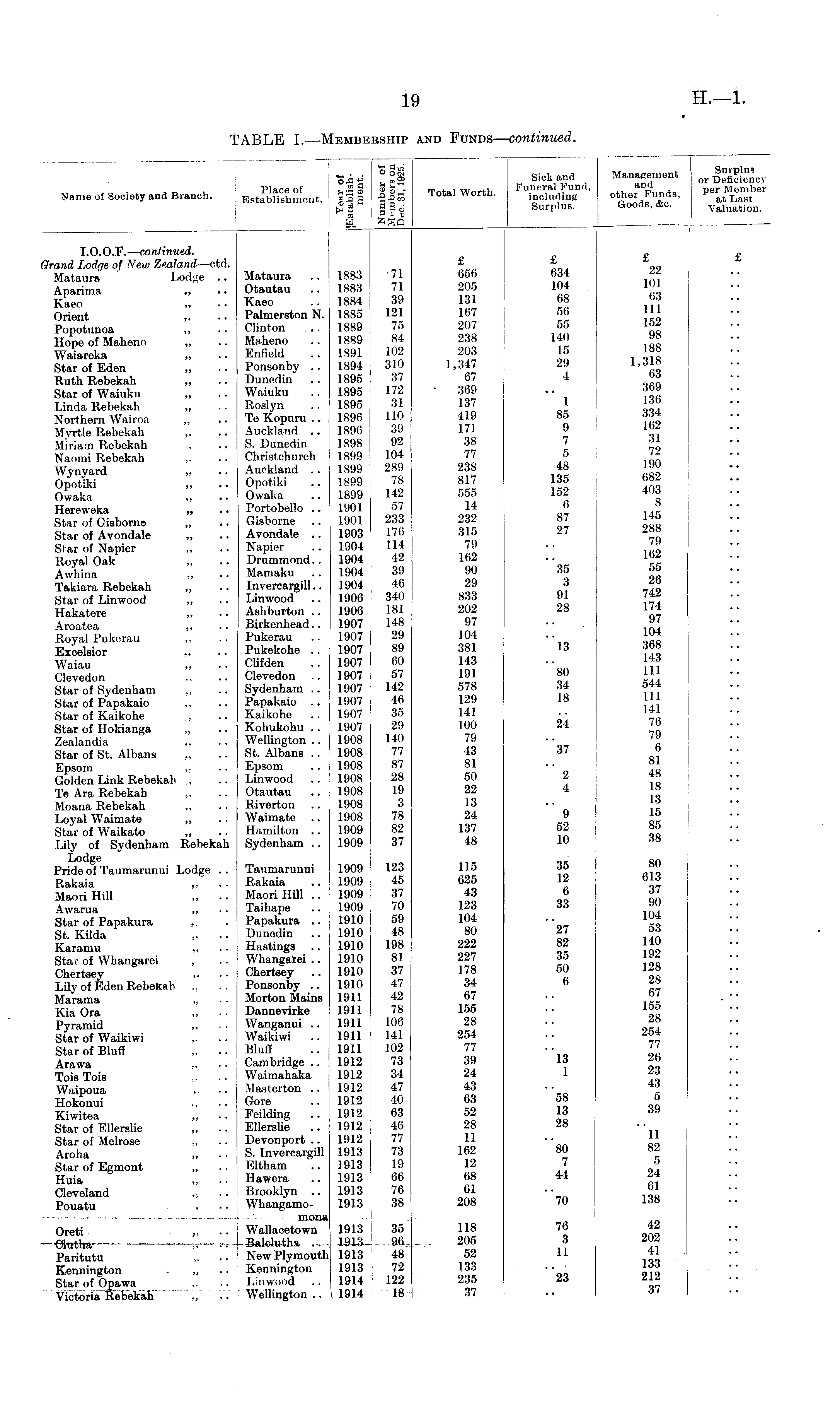 •S-i-2 °!| Sick and Management or Name of Society and Branch. Establishment. *2 £ ||S Total Worth. including ' ot her Funds, per ,* L ™, lleT )S S 9 a o Surplus. Goods, &c. valuation. I m r i u i _ a _ I.O.O.F.—continued. r £ £ Grand Lodqe of New Zealand —ctd. £ ~ 00 Mataura Lodge .. Mataura .. 1883 71 656 634 Aparima „ .. Otautau .. 1883 71 205 104 101 Kaeo „ .. Kaeo .. 1884 39 131 68 63 Orient ,. •• Palmerston N. 1885 121 167 56 111 Popotunoa „ .. Clinton ... 1889 75 207 55 Hope of Maheno „ .. Maheno .. 1889 84 238 140 Waiareka „ .. Enfield .. 1891 102 203 15 188 Star of Eden „ .. Ponsonby .. 1894 310 1,347 29 1,3 Ruth Rebekah „ .. Dunedin .. 1895 37 67 4 63 Star of Waiuku „ .. Waiuku .. 1895 172 369 .. Linda Rebekah „ .. Roslyn .. 1895 31 137 1 Northern Wairoa „ .. Te Kopuru .. 1896 110 419 So • Myrtle Rebekah „ .. Auckland .. 1896 39 171 9 Miriam Rebekah „ S. Dunedin 1898 92 38 7 Naomi Rebekah .. Christchurch 1899 104 77 5 Wvnvard „ .. Auckland .. 1899 289 238 48 190 Opotiki „ .. Opotiki .. 1899 78 817 135 682 Owaka „ .. Owaka .. 1899 142 555 152 403 Hereweka „ .. Portobello .. 190 1 57 14 6 Star of Gisborne „ .. Gisborne .. 1901 233 232 87 145 Star of Avondale „ .. Avondale .. 1903 176 315 27 288 Star of Napier „ .. Napier .. 1904 114 79 .. Royal Oak „ .. Drummond.. 1904 42 162 .. 1 Awhina „ .. Mamaku .. 1904 39 90 35 55 Takiara Rebekah „ .. Invercargill.. 1904 46 29 ■> Star of Linwood „ .. Linwood .. 1906 340 833 .1 Hakatere „ .. Ashburton .. 1906 181 202 28 17 Aroatea „ .. Birkenhead.. 1907 148 97 97 Royal Pukorau ,, •• Pukerau .. 1907 29 104 .. Excelsior .. .. Pukekohe .. 1907 89 381 13 368 Waiau „ .. CUfden .. 1907 60 143 .. 43 Clevedon ., .. Clevedon ,. 1907 57 191 80 111 Star of Sydenham .. Sydenham .. 1907 142 578 34 544 Star of Papakaio „ .. Papakaio .. 1907 46 129 18 Star of Kaikohe „ .. Kaikohe .. 1907 35 141 .. Star of Hokianga „ .. Kohukohu .. 1907 29 100 24 7b Zealandia ,. .. WelUngton .. 1908 140 79 •• Star of St. Albans ., .. St. Albans .. 1908 77 43 37 6 Epsom „ .. Epsom .. 1908 87 81 .. 81 Golden Link Rebekah ., .. Linwood .. 1908 28 50 2 Te Ara Rebekah .. Otautau .. 1908 19 22 4 Moana Rebekah ,, .. Riverton .. 1908 3 13 • • Loyal Waimate „ .. Waimate .. 1908 78 24 9 Star of Waikato „ .. Hamilton .. 1909 82 137 52 Lily of Sydenham Rebekah Sydenham . . 1909 37 48 10 Pride of Taumarunui Lodge .. Taumarunui 1909 123 115 35 80 Rakaia „ .. Rakaia .. 1909 45 625 12 613 Maori Hill „ .. Maori Hill .. 1909 37 43 6 37 Awarua „ .. Taihape .. 1909 70 123 33 90 Star of Papakura , . Papakura .. 1910 59 104 .. St. Kilda ,. .. Dunedin .. 1910 48 80 27 53 Karamu „ .. Hastings .. 1910 198 222 82 140 Star of Whangarei , .. Whangarei .. 1910 81 227 35 19 Chertsey „ .. Chertsey .. 1910 37 178 50 1 8 Lily of Eden Rebeka h .. .. Ponsonby .. 1910 47 34 6 Marama „ •• Morton Mains 1911 42 67 •• 67 Kia Ora „ • • IJannevirke 1911 78 155 • ■ 155 Pyramid „ •• Wanganui .. 1911 106 28 •• Star of Waikiwi „ .. Waikiwi .. 1911 141 254 25 Star of Bluff „ .. Bluff .. 1911 102 77 •• Arawa • • Cambridge .. 1912 73 39 13 Tois Tois .. Waimahaka 1912 34 24 1 23 Waipoua .. .. Masterton .. 1912 47 43 •• 4d Hokonui .. Gore .. 1912 40 63 58 5 Kiwitea „ .. Feilding .. 1912 63 52 13 39 Star of Ellershe „ .. Ellerslie .. 1912 46 28 28 .. Star of Melrose „ .. Devonport .. 1912 77 11 •• Aroha „ S. Invercargill 1913 73 162 80 82 Star of Egmont „ .. Eltham .. 1913 19 12 7 Huia „ •• Hawera .. 1913 66 68 44 24 Cleveland „ .. Brooklyn .. 1913 76 61 •• 1 Pouatu , .. Whangamo- 1913 38 208 70 — ... mona Oreti ,, •• Wallacetown 1913 35 118 76 42 —-Ghrtba- ——- =-r— Bftlolutha ... 1513-- 9& r . 205 3 202 Paritutu „ .. New Plymouth 1913 I 48 52 11 |1 Kennington - „ .. Kennington 1913 ; 72 133 „ if; Star of Opawa ,. .. j Linwood .. 1914 ; 122 235 3 Victoria Rebekah ,, .. i Wellington .. 1914 18 - 37