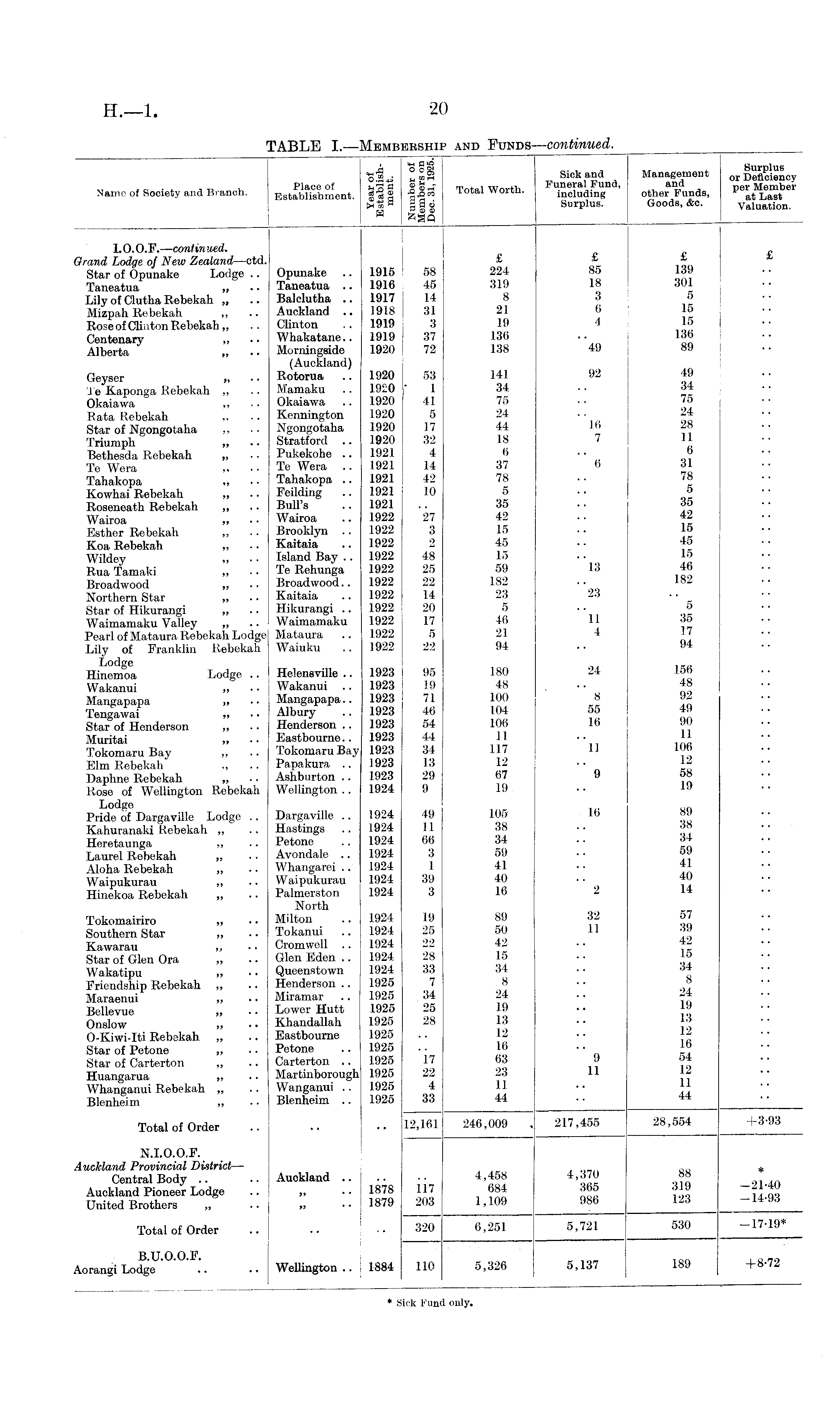 "SSL Sick and Management or Deficiency _ T) , Place of a ®ch Total Worth Funeral Fund, and per Member Name of Society and Branch. Establishment, gs 2 ■§«« a worth. lnc luding other Funds, a t Last gSg Surplus. Goods, &c. Valuation. | iggQ I.O.O.F. —continued. t . Grand Lodge of New Zealand —otd. ! £ *• Star of Opunake Lodge .. Opunake .. 1915 | 58 224 85 139 Taneatua „ • • Taneatua .. 1916 j 45 319 18 301 Lily of Clutha Rebekah „ .. Balclutha .. 1917 14 8 3 5 Mizpah Rebekah „ .. Auckland .. 1918 31 21 6 15 Rose of Clinton Rebekah „ .. Clinton .. 1919 3 19 4 15 Centenary „ .. Whakatane.. 1919 37 136 .. 136 Alberta „ .. Morningside 1920 72 138 49 89 (Auckland) Geyser „ • ■ Rotorua .. 1920 53 141 92 49 J i e Kaponga Rebekah „ .. Mamaku .. 1920 1 34 • • 34 j Okaiawa „ • • Okaiawa .. 1920 41 75 • • 75 Rata Rebekah „ .. Kennington 1920 5 24 .. 24 Star of Ngongotaha „ •• Ngongotaha 1920 17 44 16 Triumph „ Stratford .. 1920 32 18 7 11 Bethesda Rebekah „ ■ ■ Pukekohe .. 1921 4 6 .. 6 Te Wera .. Te Wera .. 1921 14 37 6 31 Tahakopa „ ■■ Tahakopa .. 1921 42 78 • • 78 Kowhai Rebekah „ .. Feilding .. 1921 10 5 • • 5 Roseneath Rebekah „ .. Bull's .. 1921 . . 35 • • 35 Wairoa „ • • Wairoa .. 1922 27 42 .. 42 Esther Rebekah ,, •. Brooklyn .. 1922 3 15 • • 15 Koa Rebekah „ .. Kaitaia .. 1922 2 45 .. 45 Wildey „ .. Island Bay .. 1922 48 15 . • 15 RuaTamaki „ .. Te Rehunga 1922 25 59 13 46 Broadwood „ Broadwood.. 1922 22 182 Northern Star „ . • Kaitaia .. 1922 14 23 23 Star of Hikurangi „ .. Hikurangi .. 1922 20 5 .. 5 Waimamaku Valley „ .. Waimamaku 1922 17 46 11 Pearl of Mataura Rebekah Lodge Mataura .. 1922 5 21 4 Lily of Franklin Rebekah Waiuku .. 1922 22 94 Lodge , , Hinemoa Lodge .. Helensville .. 1923 95 180 24 156 Wakanui „ • • Wakanui .. 1923 19 48 ... 48 Mangapapa „ Mangapapa.. 1923 71 100 8 92 Tengawai ,, • • Albury .. 1923 46 104 55 . Star of Henderson „ .. Henderson .. 1923 54 106 16 90 Muritai ,, .. Eastbourne 1923 44 11 • • 11 TokomaruBay „ .. TokomaruBay 1923 34 117 11 106 Elm Rebekah „ .. Papakura .. 1923 13 12 •. 12 Daphne Rebekah „ • ■ Ashburton .. 1923 29 67 9 Rose of Wellington Rebekah Wellington .. 1924 9 19 Lodge n Pride of Dargaville Lodge .. Dargaville .. 1924 49 105 16 . Kahuranaki Rebekah „ .. Hastings .. 1924 11 38 • • 38 Heretaunga „ ■. Petone .. 1924 66 34 .. Laurel Rebekah „ • • Avondale .. 1924 3 59 • • Aloha Rebekah „ .. Whangarei .. 1924 1 41 . • 41 Waipukurau „ • • Waipukurau 1924 39 40 • ■ 40 Hinekoa Rebekah „ .. Palmerston 1924 3 16 2 14 North Tokomairiro „ ■ ■ Milton .. 1924 19 89 32 57 Southern Star „ .. Tokanui .. 1924 25 50 11 39 Kawarau „ • • Cromwell .. 1924 22 42 •. Star of Glen Ora „ .. Glen Eden .. 1924 28 15 • • 15 Wakatipu „ • • Queenstown 1924 33 34 .. <54 Friendship Rebekah „ .. Henderson .. 1925 7 8 .. Maraenui „ • • Miramar .. 1925 34 24 .. -4 Bellevue ,, .. Lower Hutt 1925 25 19 • • Onslow „ .. Khandallah 1925 28 13 •. 13 O-Kiwi-Iti Rebekah „ .. Eastbourne 1925 .. 12 .. 12 Star of Petone „ • • Petone .. 1925 . • 16 .. Star of Carterton „ .. Carterton .. 1925 17 63 9 Huangarua „ .. Martinborough 1925 22 23 11 Whanganui Rebekah „ .. Wanganui .. 1925 4 11 •• Blenheim „ .. Blenheim .. 1925 33 44 44 ■■ Total of Order .. .. 12,161 246,009 , 217,455 28,554 + 3 ' 93 N.I.O.O.F. Auckland Provincial District — , 00 Central Body .. .. Auckland 4,458 4,370 88 Auckland Pioneer Lodge .. „ •• 1878 117 684 365 , United Brothers „ .. „ •• 1879 203 1,109 986 123 Total of Order .. .. •• 320 6,251 5,721 530 -17-19* Aorangi Lodge .. •• Wellington.. 1884 110 5,326 5,137 189 +8-72 * Sick Fund only.