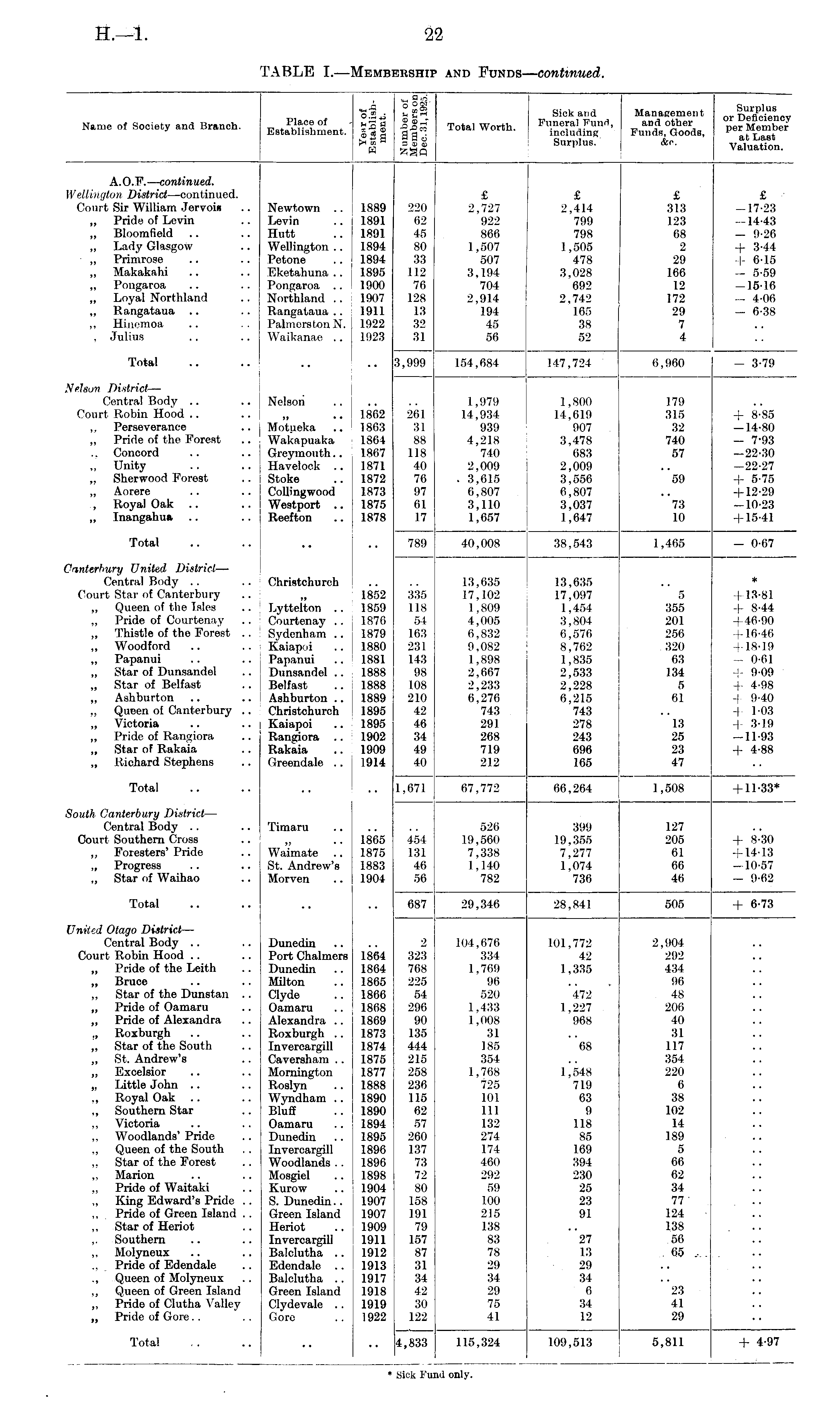 i § ,f *. Sickand Management or Deficiency Name of Society and Branch. Eata^hme nt.' gl | |f» Total Worth. per a " er Surplus. Sec-. Valuation. A.O.F. —continued. Wellington District—continued. £ £ £ £ Court Sir William Jervois .. Newtown .. 1889 220 2,727 2,414 313 -17-23 „ Pride of Levin .. Levin .. 1891 62 922 799 123 -14-43 „ Bloomfield .. .. Hutt .. 1891 45 866 798 68 — 9-26 „ Lady Glasgow .. Wellington.. 1894 80 1,507 1,505 2 + 3-44 „ Primrose .. .. Petone .. 1894 33 507 478 29 + 6-15 „ Makakahi .. .. Eketahuna .. 1895 112 3,194 3,028 166 - 5-59 „ Pongaroa .. .. Pongaroa .. 1900 76 704 692 12 -15-16 „ Loyal Northland .. Northland .. 1907 128 2,914 2,742 172 — 4-06 „ Rangataua .. .. Rangataua.. 1911 13 194 165 29 — 6-38 „ Hinemoa .. . . Palmerston N. 1922 32 45 38 7 , Julius .. .. Waikanae .. 1923 31 56 52 4 .. Total .. .. .. .. 3,999 154,684 147,724 6,960 - 3-79 Nelson District— Central Body .. .. Nelson .. .. .. 1,979 1,800 179 Court, Robin Hood .. .. „ .. 1862 261 14,934 14,619 315 + 8-85 „ Perseverance .. Motueka .. 1863 31 939 907 32 -14-80 „ Pride of the Forest .. Wakapuaka 1864 88 4,218 3,478 740 — 7-93 Concord .. .. Greymonth.. 1867 118 740 683 57 —22-30 „ Unity .. .. Haveloek .. 1871 40 2,009 2,009 .. -22-27 Sherwood Forest .. Stoke .. 1872 76 . 3,615 3,556 59 + 5-75 „ Aorere .. .. Collingwood 1873 97 6,807 6,807 .. +12-29 , Royal Oak .. .. Westport .. 1875 61 3,110 3,037 73 -10-23 „ Inangahua .. .. Reefton .. 1878 17 1,657 1,647 10 +15-41 Total .. .. i .. .. 789 40,008 38,543 1,465 - 0-67 Canterbury United District— Central Body .. .. j Christchurch .. .. 13,635 13,635 .. * Court Star of Canterbury .. „ 1852 335 17,102 17,097 5 +13-81 „ Queen of the Isles .. Lyttelton ..1859 118 1,809 1,454 355 + 8-44 „ Pride of Courtenay .. i Courtenay .. 1876 54 4,005 3,804 201 +46-90 „ Thistle of the Forest .. ! Sydenham .. 1879 163 6,832 6,576 256 +16-46 „ Woodford .. .. j Kaiapoi .. 1880 231 9,082 8,762 320 +18-19 „ Papanui .. .-. -j Papanui .. 1881 143 1,898 1,835 63 — 0-61 „ Star of Dunsandel .. j Dunsandel.. 1888 98 2,667 2,533 134 + 9-09 „ Star of Belfast .. (Belfast .. 1888 108 2,233 2,228 5 + 4-98 „ Ashburton .. .. Ashburton .. 1889 210 6,276 6,215 61 + 9-40 „ Queen of Canterbury .. Christchurch 1895 42 743 743 .. + 1-03 „ Victoria .. .. i Kaiapoi .. 1895 46 291 278 13 + 3-19 „ Pride of Rangiora .. Rangiora .. 1902 34 268 243 25 —11-93 „ Star of Rakaia .. Rakaia .. 1909 49 719 696 23 + 4-88 „ Richard Stephens .. Greendale .. 1914 40 212 165 47 Total .. .. .. .. 1,671 67,772 66,264 1,508 +11-33* South Canterbury District — Central Body .. .. Timaru .. .. .. 526 399 127 Court Southern Cross .. „ .. 1865 454 19,560 19,355 205 + 8-30 „ Foresters'Pride .. Waimate .. 1875 131 7,338 7,277 61 +14-13 „ Progress .. .. St. Andrew's 1883 46 1,140 1,074 66 —10-57 „ Star of Waihao .. Morven .. 1904 56 782 736 46 — 9-62 Total .. .. .. .. 687 29,346 28,841 505 + 6-73 United Otago District— Central Body .. .. Dunedin .. .. 2 104,676 101,772 2,904 Court Robin Hood .. .. Port Chalmers 1864 323 334 42 292 „ Pride of the Leith .. Dunedin .. 1864 768 1,769 1,335 434 „ Bruce .. .. Milton .. 1865 225 96 ... 96 „ Star of the Dunstan .. Clyde .. 1866 54 520 472 48 „ Pride of Oamaru .. Oamaru .. 1868 296 1,433 1,227 206 „ Pride of Alexandra .. Alexandra .. 1869 90 1,008 968 40 ,, Roxburgh .. .. Roxburgh .. 1873 135 31 .. 31 „ Star of the South .. Invercargill 1874 444 185 68 117 „ St. Andrew's .. Caversham .. 1875 215 354 .. 354 „ Excelsior .. .. Mornington 1877 258 1,768 1,548 220 „ Little John .. .. Roslyn .. 1888 236 725 719 6 „ Royal Oak .. .. Wyndham .. 1890 115 101 63 38 „ Southern Star .. Bluff .. 1890 62 111 9 102 „ Victoria .. .. Oamaru .. 1894 57 132 118 14 ,, Woodlands' Pride .. Dunedin .. 1895 260 274 85 189 „ Queen of the South .. Invercargill 1896 137 174 169 5 „ Star of the Forest .. Woodlands .. 1896 73 460 394 66 „ Marion .. .. Mosgiel .. 1898 72 292 230 62 ,, Pride of Waitaki .. Kurow ... 1904 80 59 25 34 „ King Edward's Pride .. S. Dunedin.. 1907 158 100 23 77 .. „ Pride of Green Island .. Green Island 1907 191 215 91 124 „ Star of Heriot .. Heriot .. 1909 79 138 .. 138 „ Southern .. .. Invercargill 1911 157 83 27 .56 „ Molyneux .. .. Balclutha .. 1912 87 78 13 . 65 .... . „ Pride of Edendale .. Edendale .. 1913 31 29 29 .. ,, Queen of Molyneux .. Balclutha .. 1917 34 34 34 „ Queen of Green Island Green Island 1918 42 29 6 23 ,, Pride of Clutha Valley Clyde vale ..1919 30 75 34 41 „ Pride of Gore.. .. Gore .. 1922 122 41 12 29 .. Total .. .. .. .. 4,833 115,324 109,513 5,811 + 4-97 * Sick Fund only.